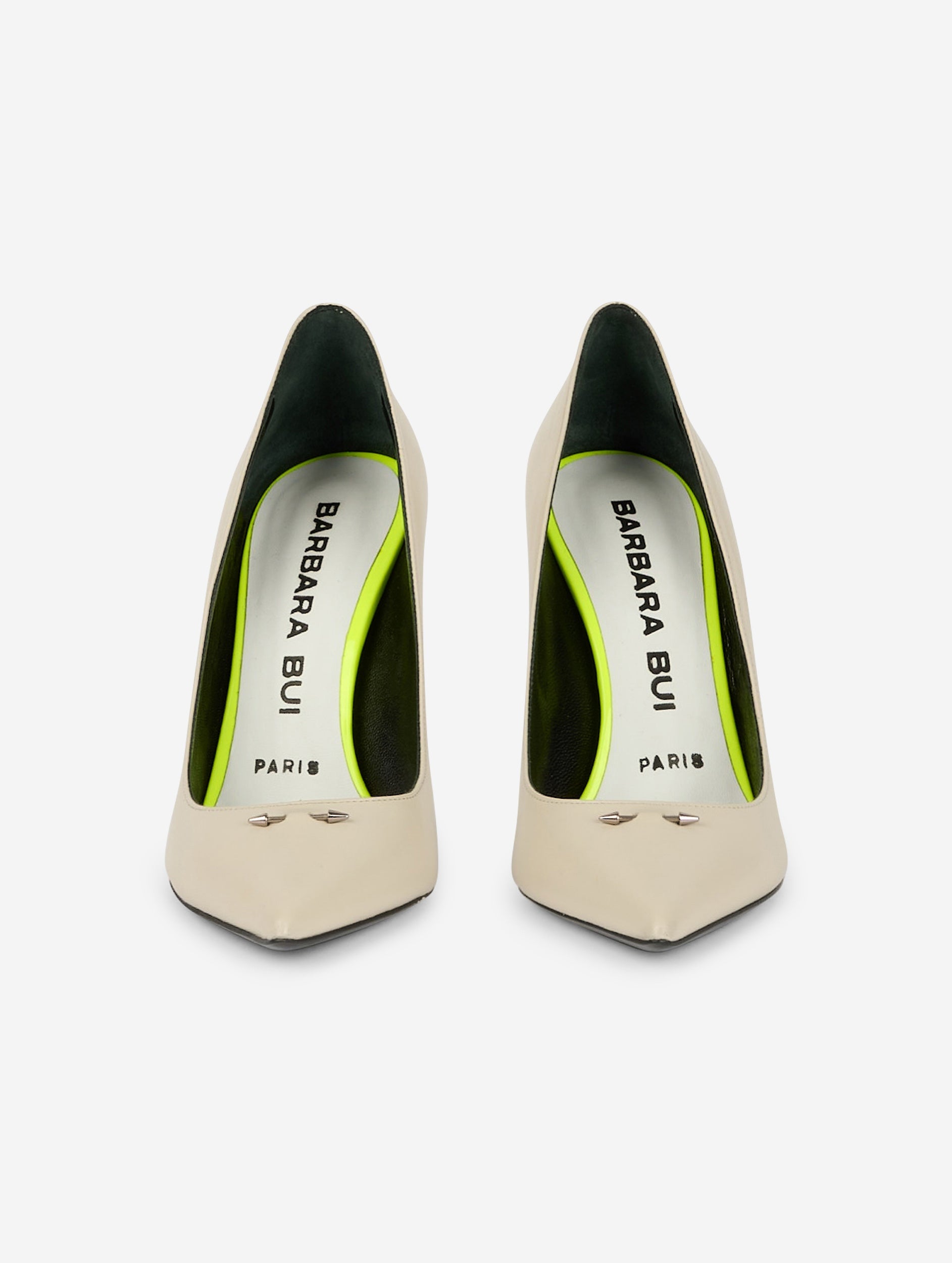 Beige nappa leather vamps with our signature metal piercing. Sexy 10.5 cm heel.