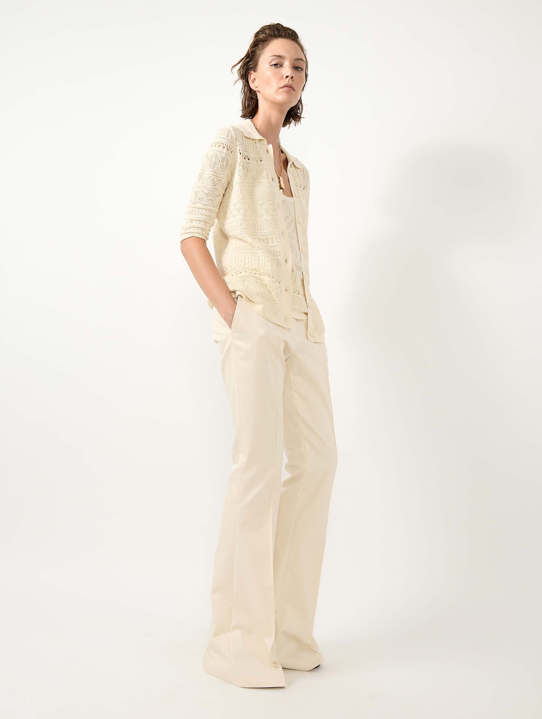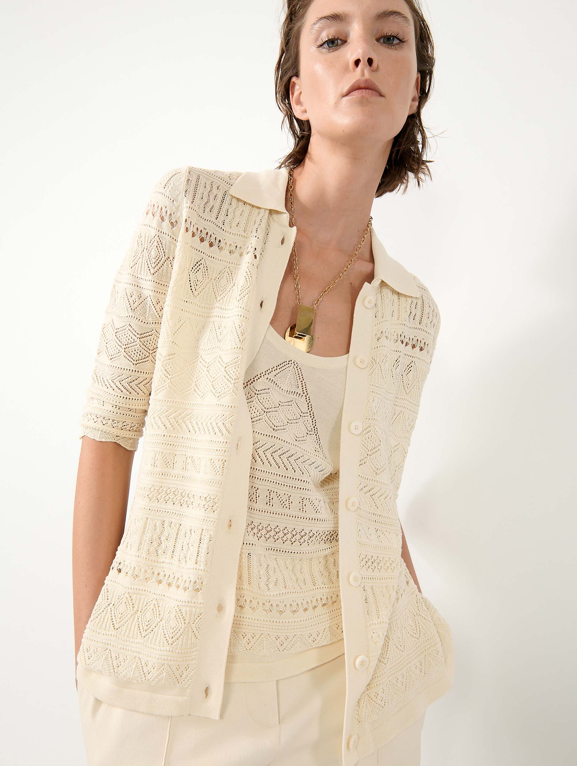 This polo-collar cardigan reimagines a wardrobe essential in an openwork knit with raised geometric patterns, subtly blending transparency and refinement. The knitwork alternates decorative stitches forming chevrons, lace effects, and bands. This cardigan layers easily over the matching tank top to create a lightweight twin set, perfect for mid-season wear or summer evenings. Available in three colors—beige, khaki, and navy—it can be worn open for a relaxed look or styled in a more structured way.