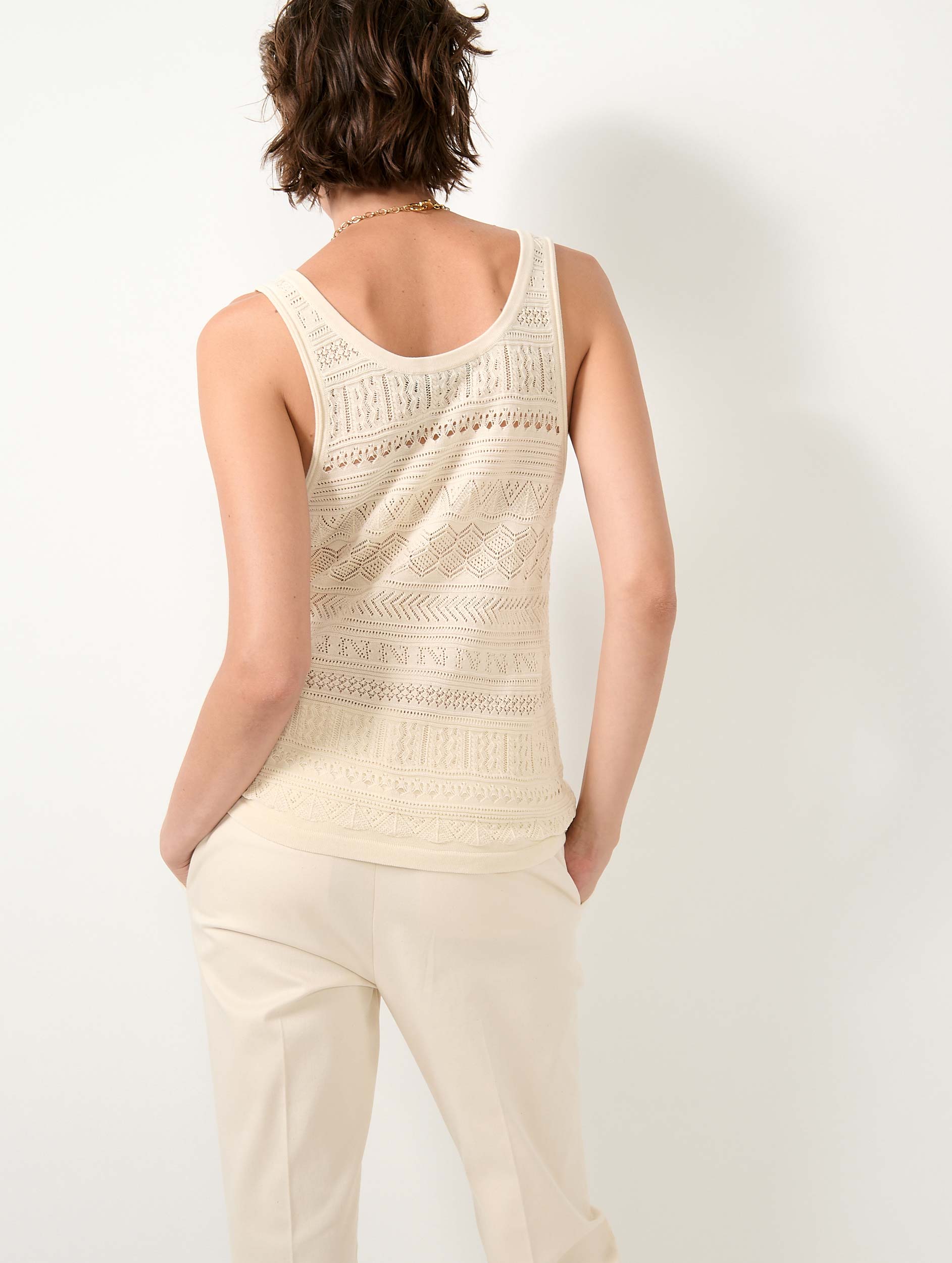 This feminine top in openwork knit with geometric relief motifs elegantly plays on transparency effects while ensuring comfortable wear thanks to the opacity of the knit at the chest level. The knitting work alternates fancy stitches, evoking both chevrons, graphic lace, and textured bands, in a spirit both artisanal and sophisticated. Proposed in the three colours coordinated with the matching pullover, this knit tank top can be worn as a twin-set for the start of the season or a summer evening. From the back, all the know-how of the House's workshops is revealed.