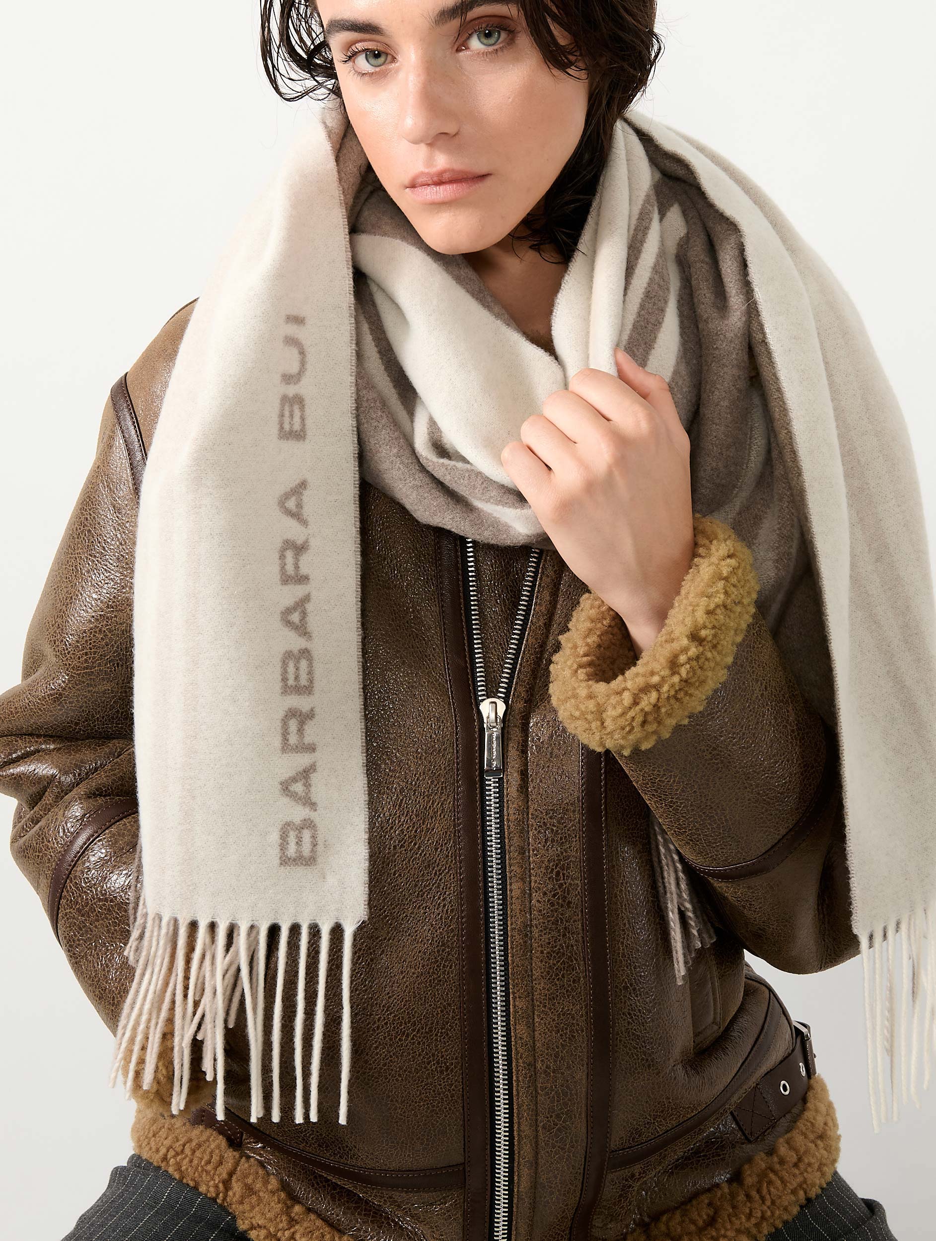 This wool and cashmere scarf is jacquard-woven with a subtle striped pattern and Barbara Bui lettering. Its soft, lightweight texture makes it the perfect accessory to accompany you all winter long.