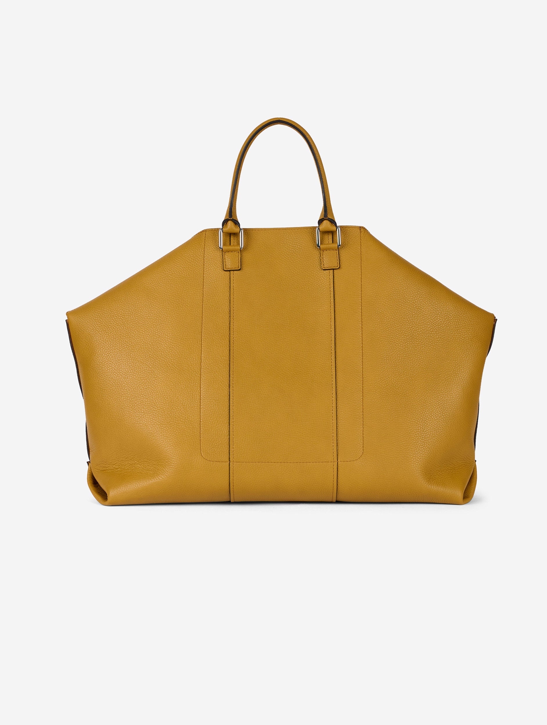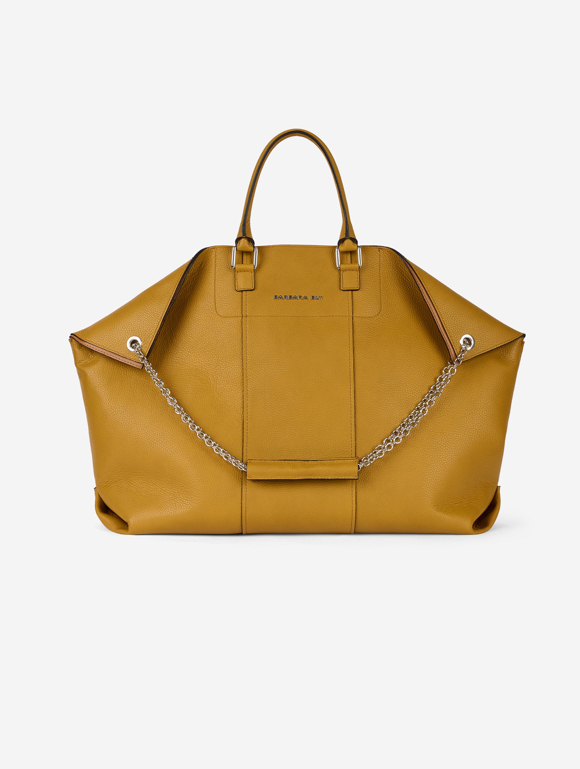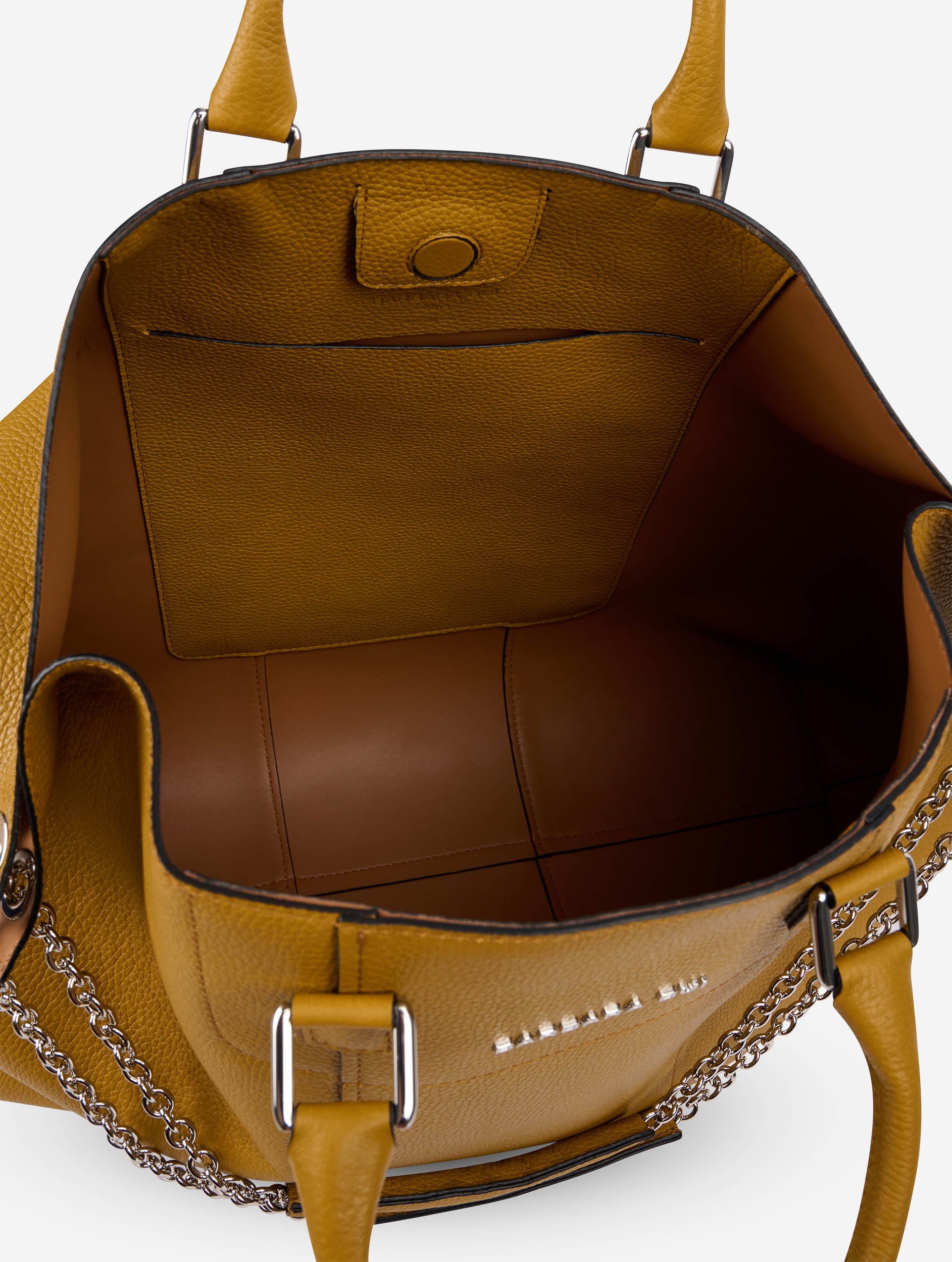"BIG CHAMALLOW" large tote bag in mustard grained calfskin with reversible effect lining. Articulated hand-carry handles and sliding chain shoulder strap for either short double-chain or long single-chain carrying. Inside patch pocket and central magnetic closure. Height 41cm - Length: 64cm - Depth: 18cm.
