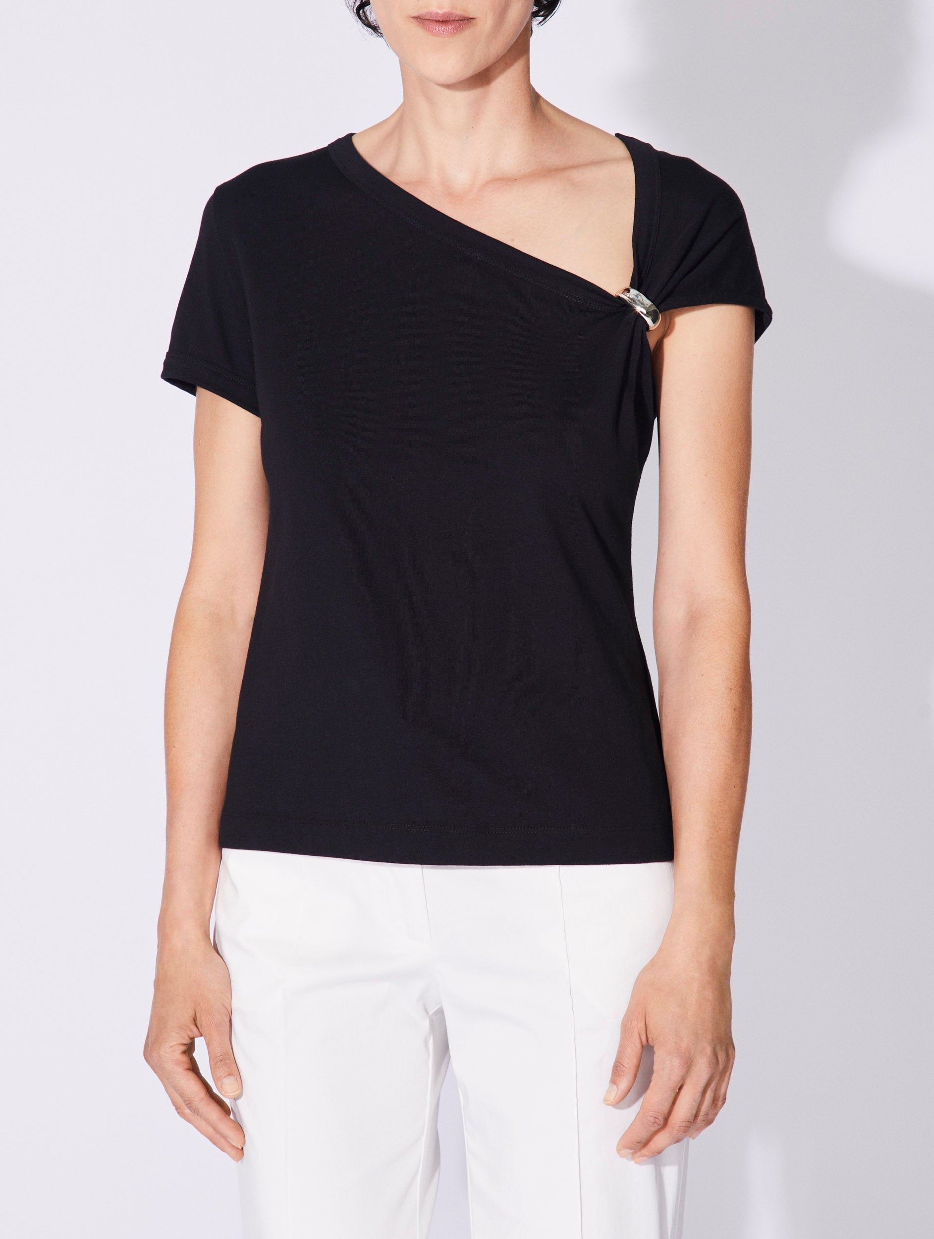 The soft, comfortable cotton jersey women’s T-shirt is a Barbara Bui classic. It combines a regular shoulder line with a draped effect to create an elegant asymmetric look, secured with a detachable silver metal ring. In black or white cotton jersey, this jewel-embellished T-shirt will rapidly become one of your wardrobe staples.