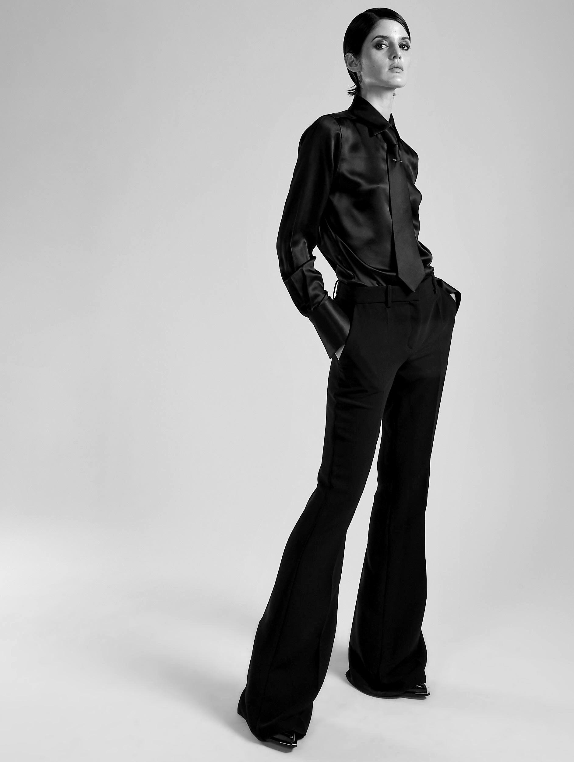 Sharp lines for a “sharp and cut” silhouette: that’s the ethos of our tailoring wardrobe, and this women’s trouser style does it proud. With its flattering bootleg cut that flares dramatically at the hem, this crepe trouser is the perfect companion for a dressed-up outfit. Its defined crease elongates the leg for a sleek silhouette, enhanced by ankle boots or heels. Available in matte white or black crepe, this tailored pant creates an elegant contrast with the luminous satin of our silk shirts and tank tops.