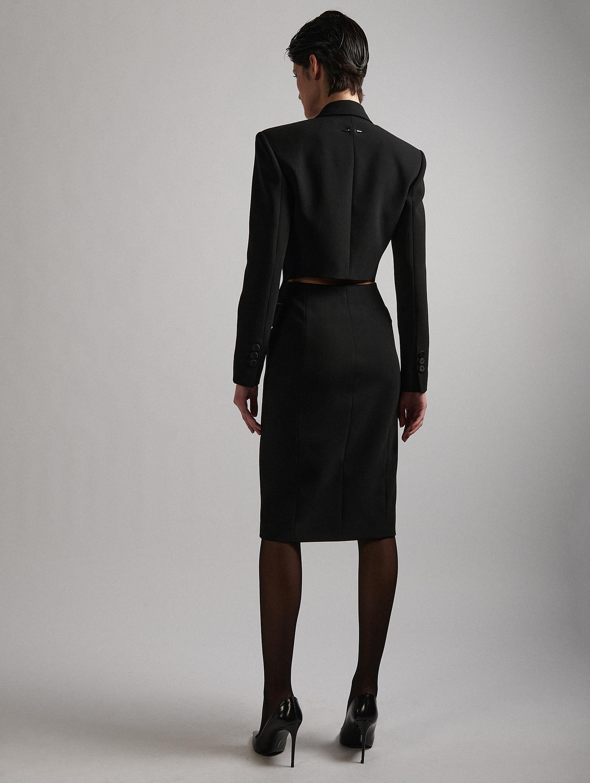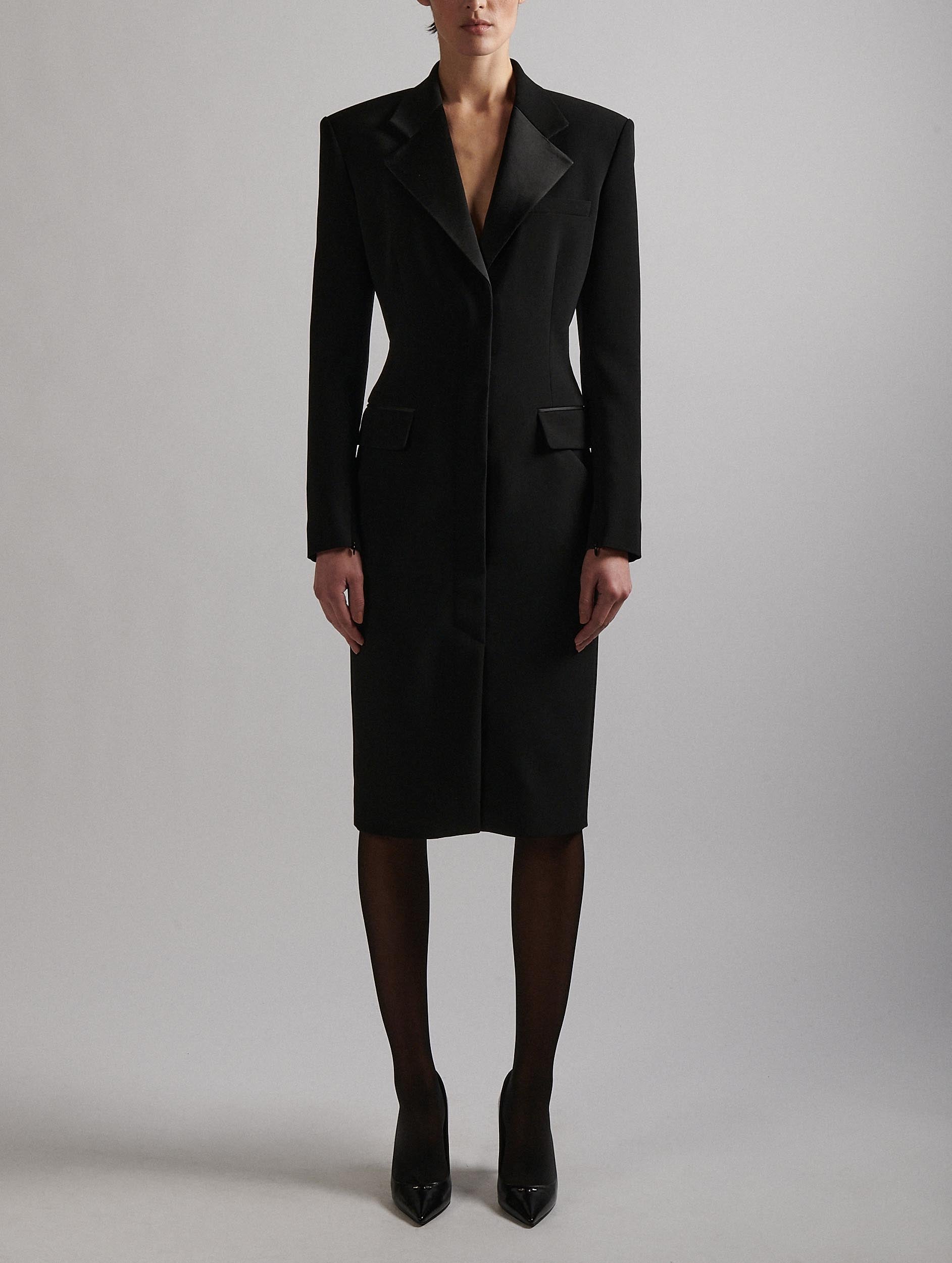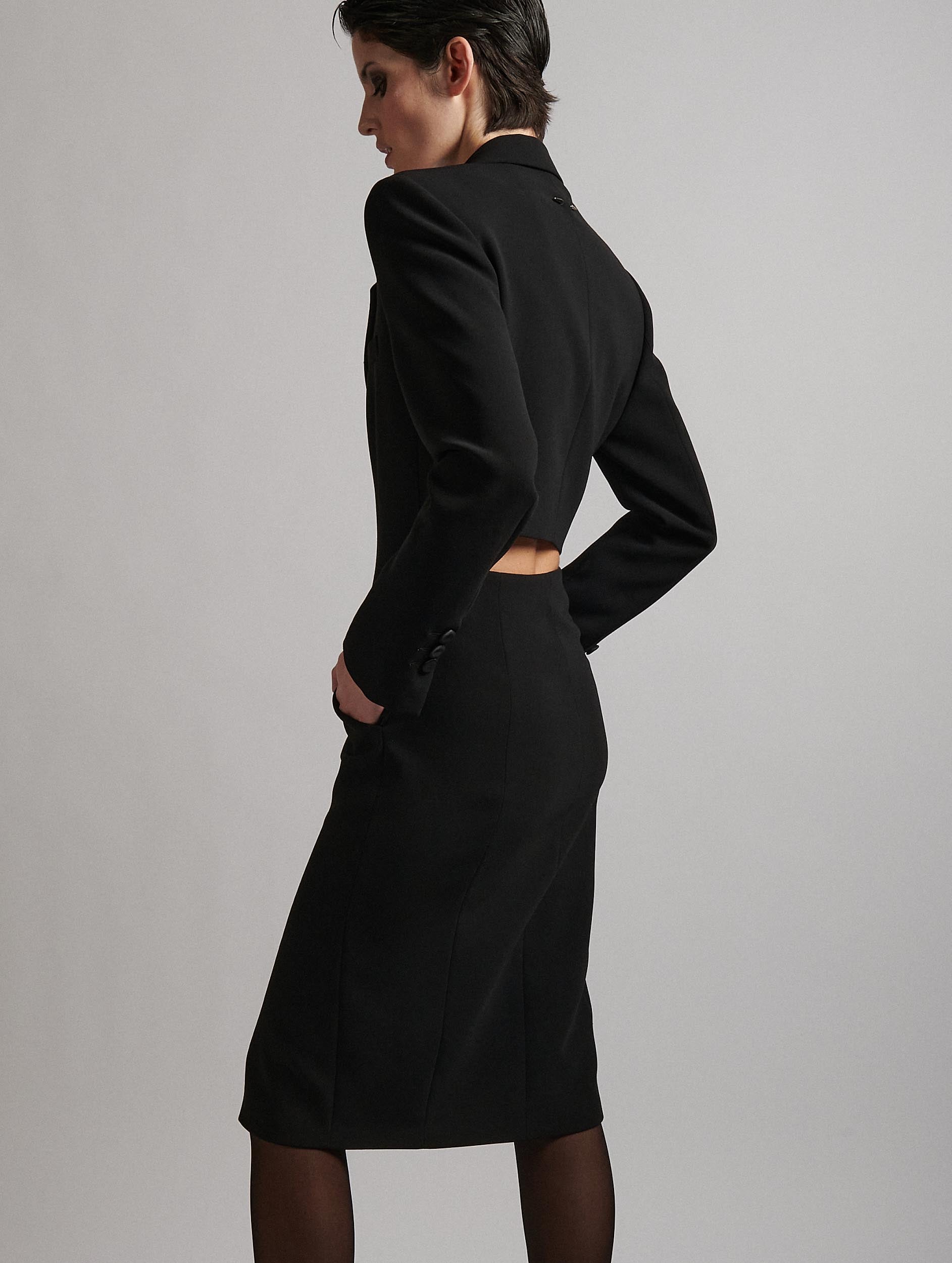 Crafted in black crepe with satin detailing, this elegant black crepe dress underscores our ateliers' sense of cut as well as the seductive power of the Barbara Bui woman. Its sharp lines, in the House's sharp and cut spirit, give this dress an inimitable allure. At the back, this tuxedo-jacket-inspired dress reveals a hint of skin, thanks to a clean cut lined with a band that holds it to the skin for a tailored jacket and skirt effect. Sleeves with satin-covered buttonholes open with an invisible zip, adding to the charm of this timeless dress with a slit and satin-covered placket. Tuxedo collar with satin lapel and Italian pockets, to which a satin flap and piping are added, outline a racy, feminine silhouette.