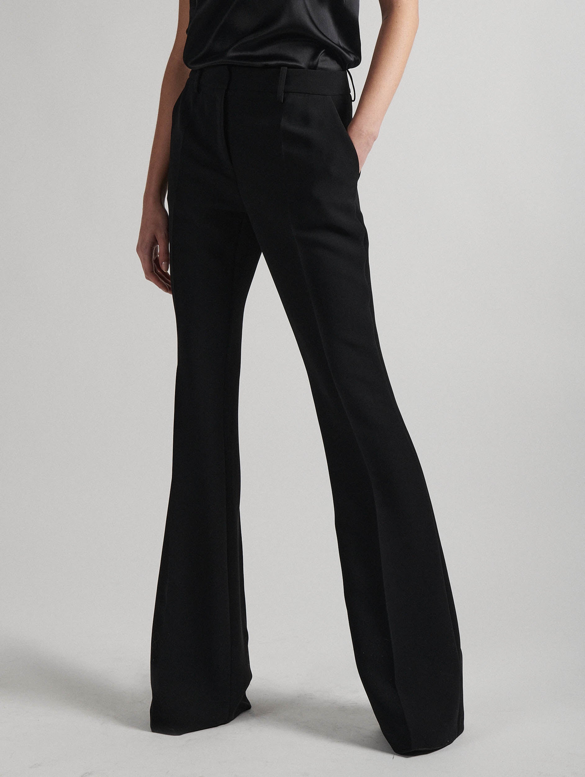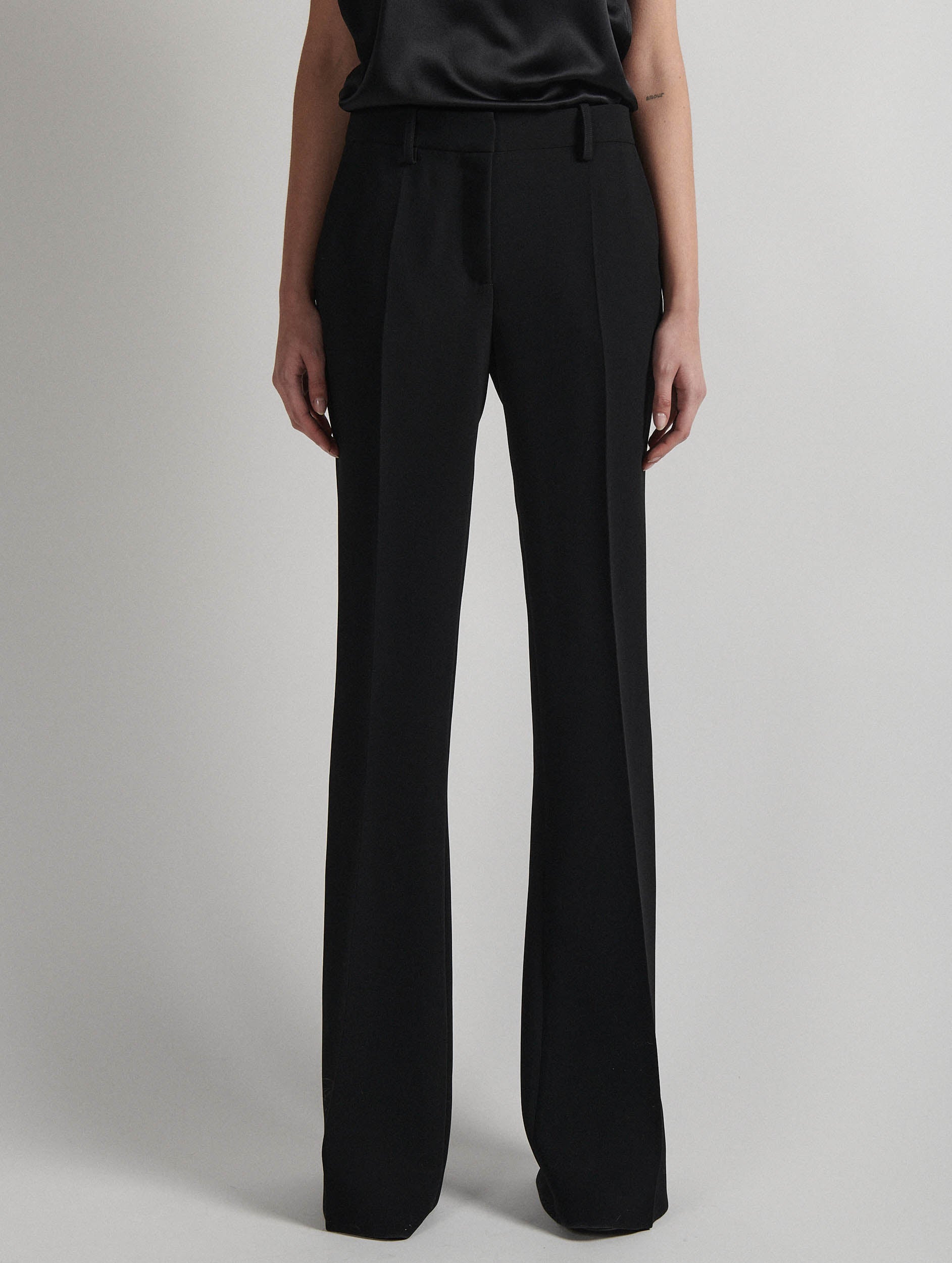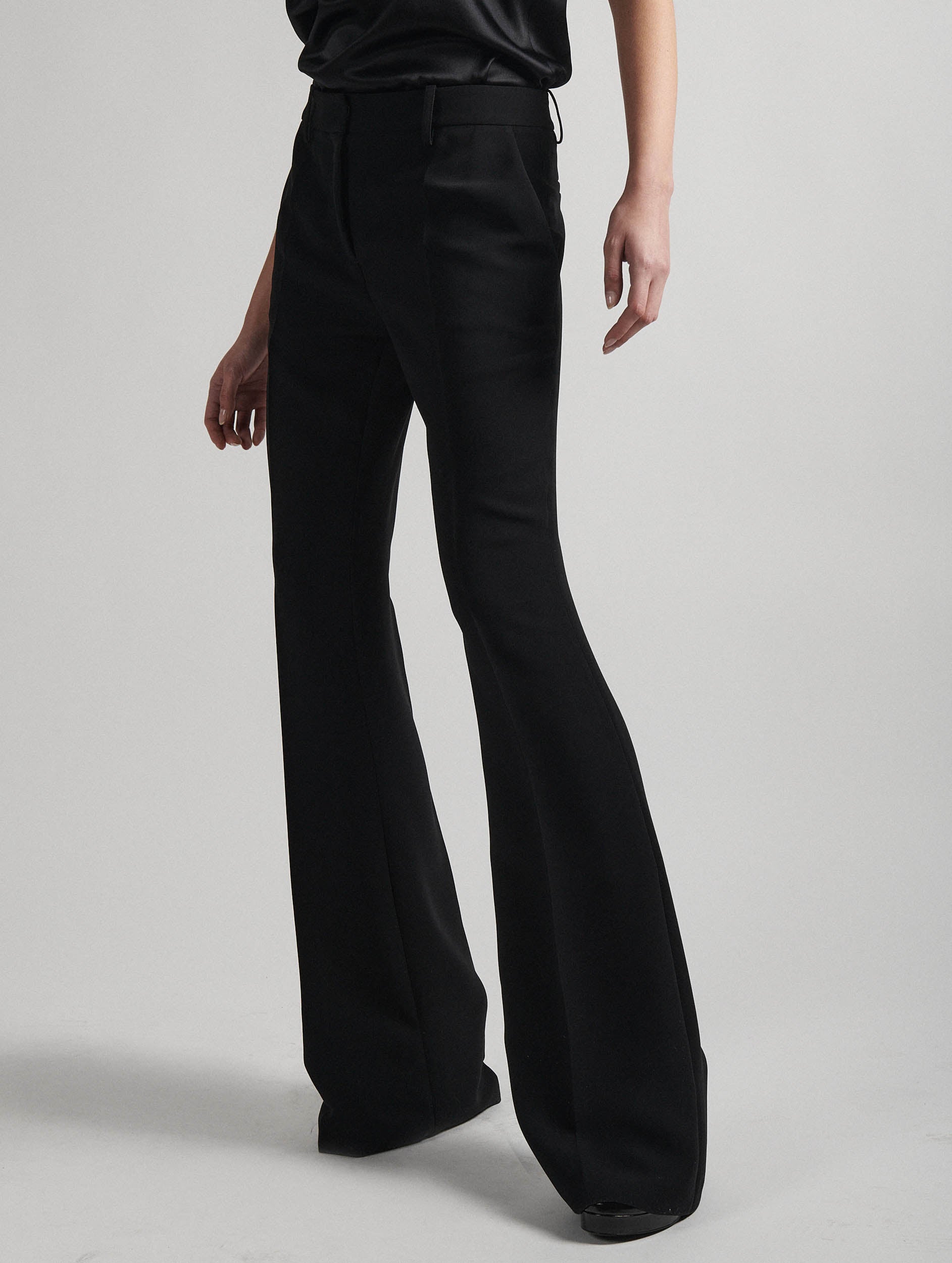 These women's trousers in flowing crepe are guaranteed to make a statement. The bootleg cut, flared at the bottom of the leg, lifts the silhouette, offering a sculptural look to suit all body types. Meticulous details such as Italian pockets, waist loops and back pockets with piping highlight the House's expertise in tailoring. For a suit look, pair these trousers with the zip-sleeved jacket in the same fluid crepe and our silk satin shirt with lavaliere.