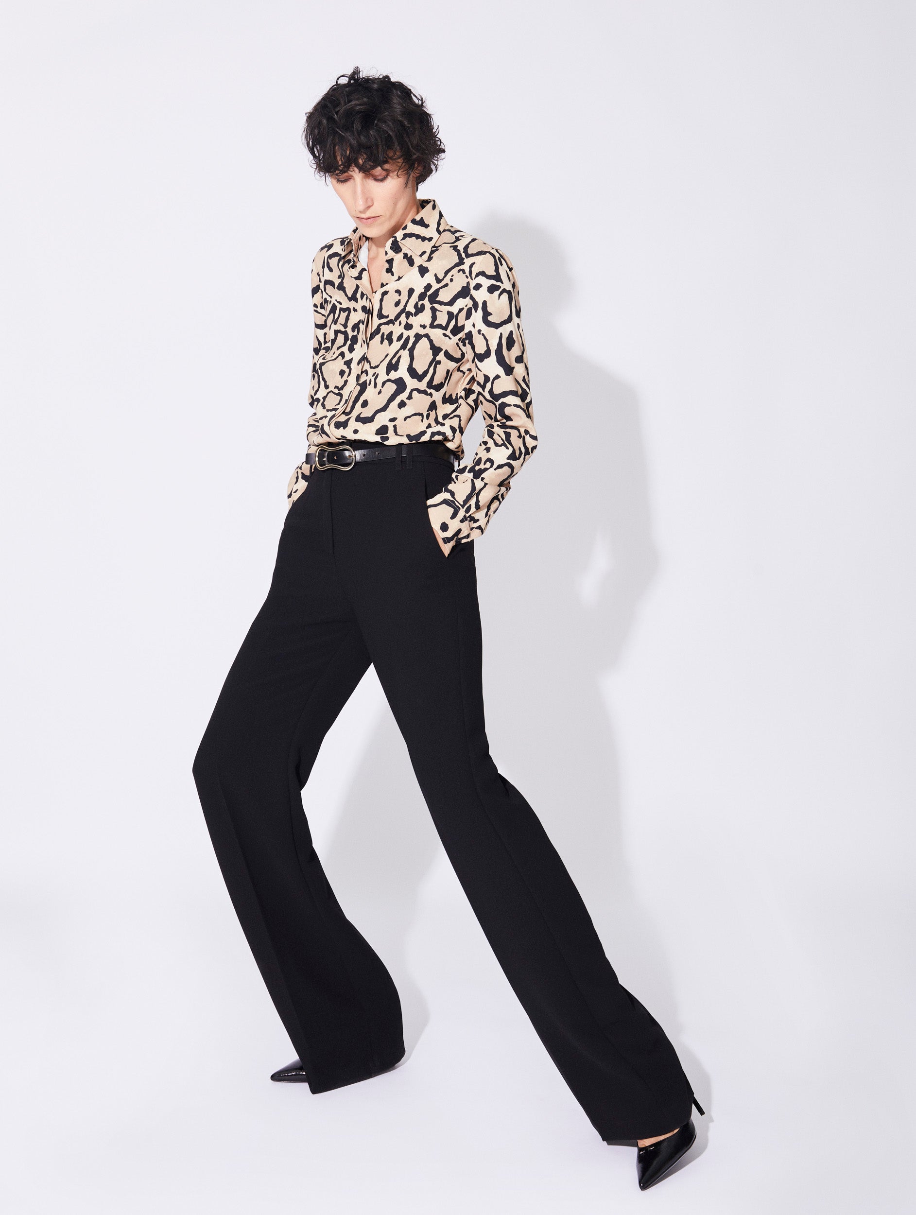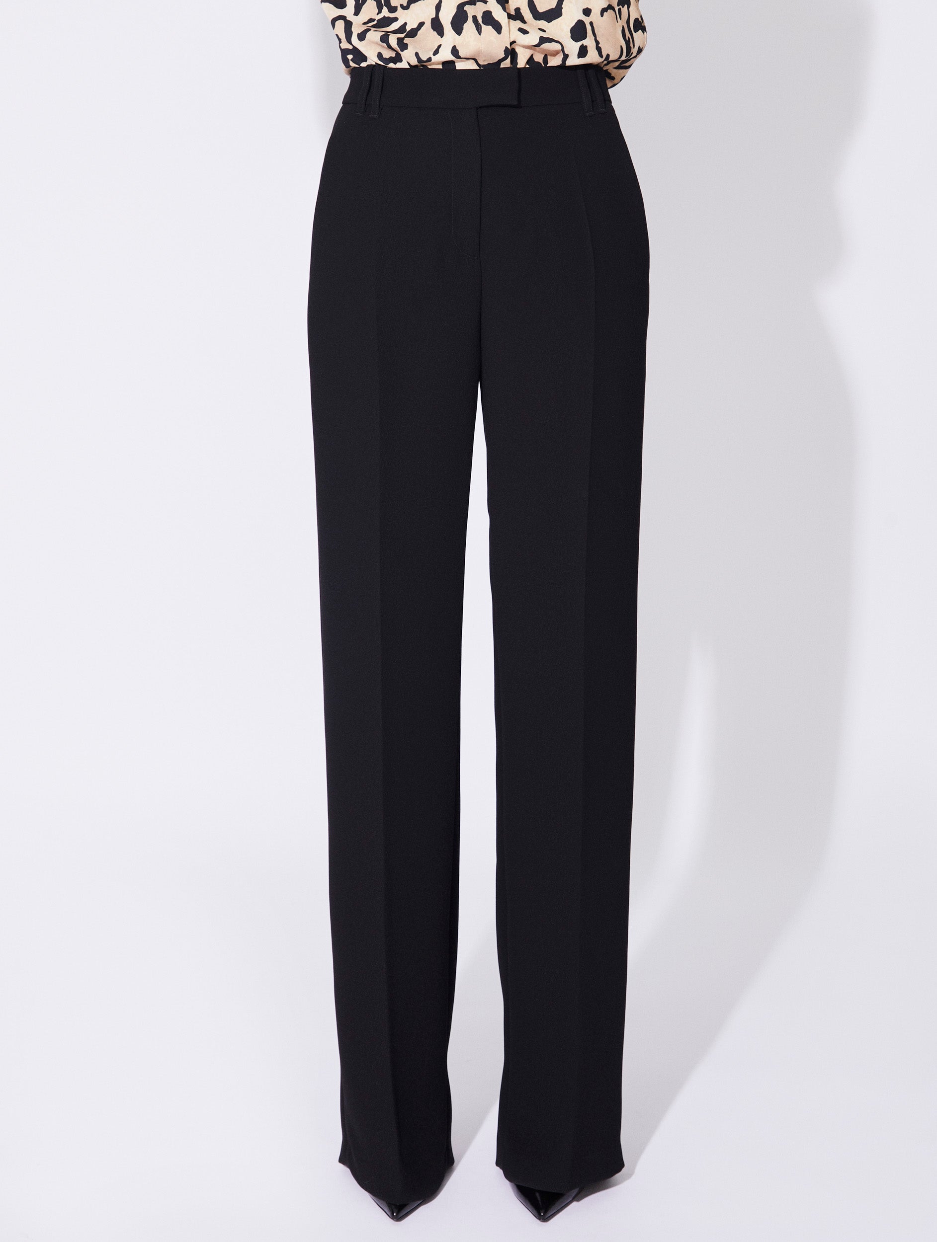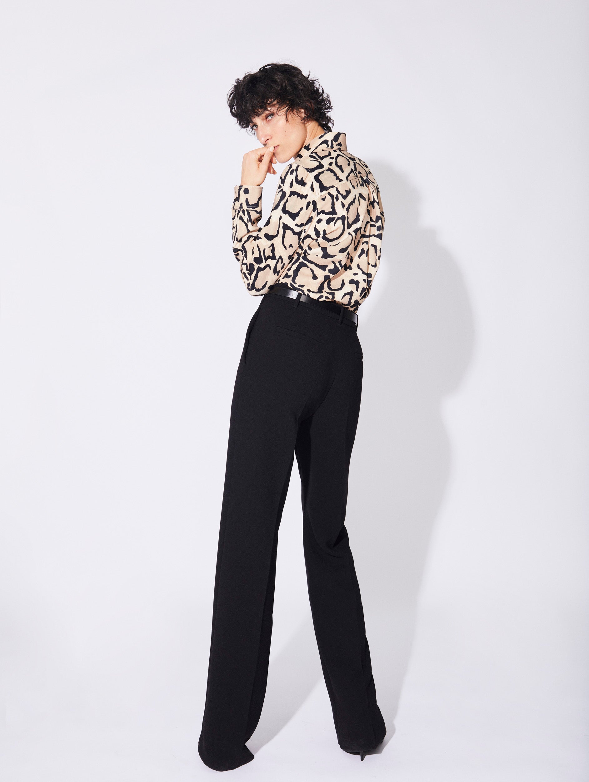 You can rely on these these timeless tailored trousers in comfortable flowy crepe to give you a statuesque look. The high waist and wide leg with pleats, elegantly flared at the hem, ensure a slender, streamlined silhouette. Comfortable slant pockets and rear welt pockets reflect the importance Barbara Bui gives to comfort and the attitude of the women who wears her creations. A silk satin shirt artfully slipped into these women’s suit trousers underlines their masculine-inspired elegance. In black, white or linden green, these high waisted flared trousers can be worn separately or coordinated with jackets from our collection.