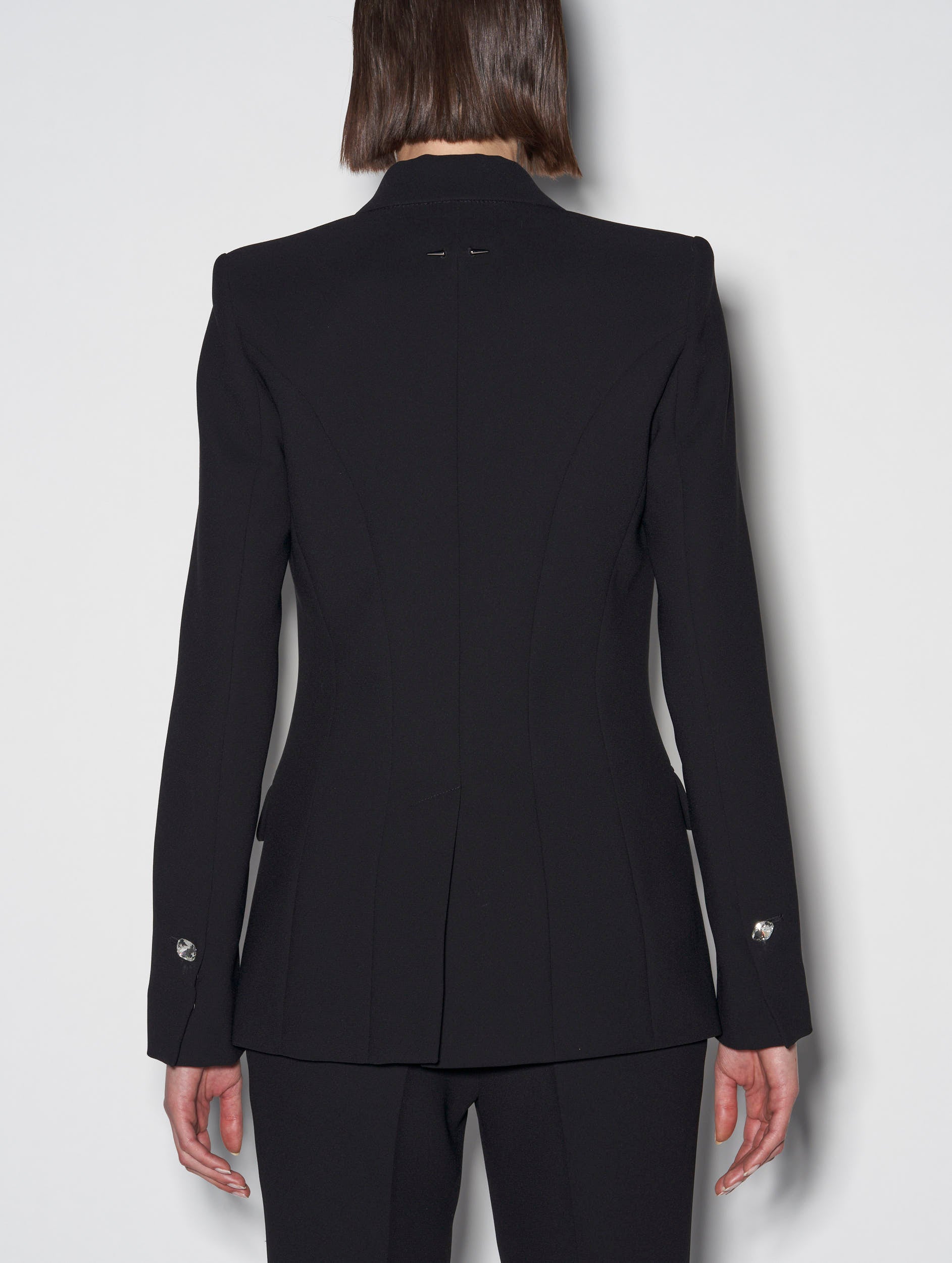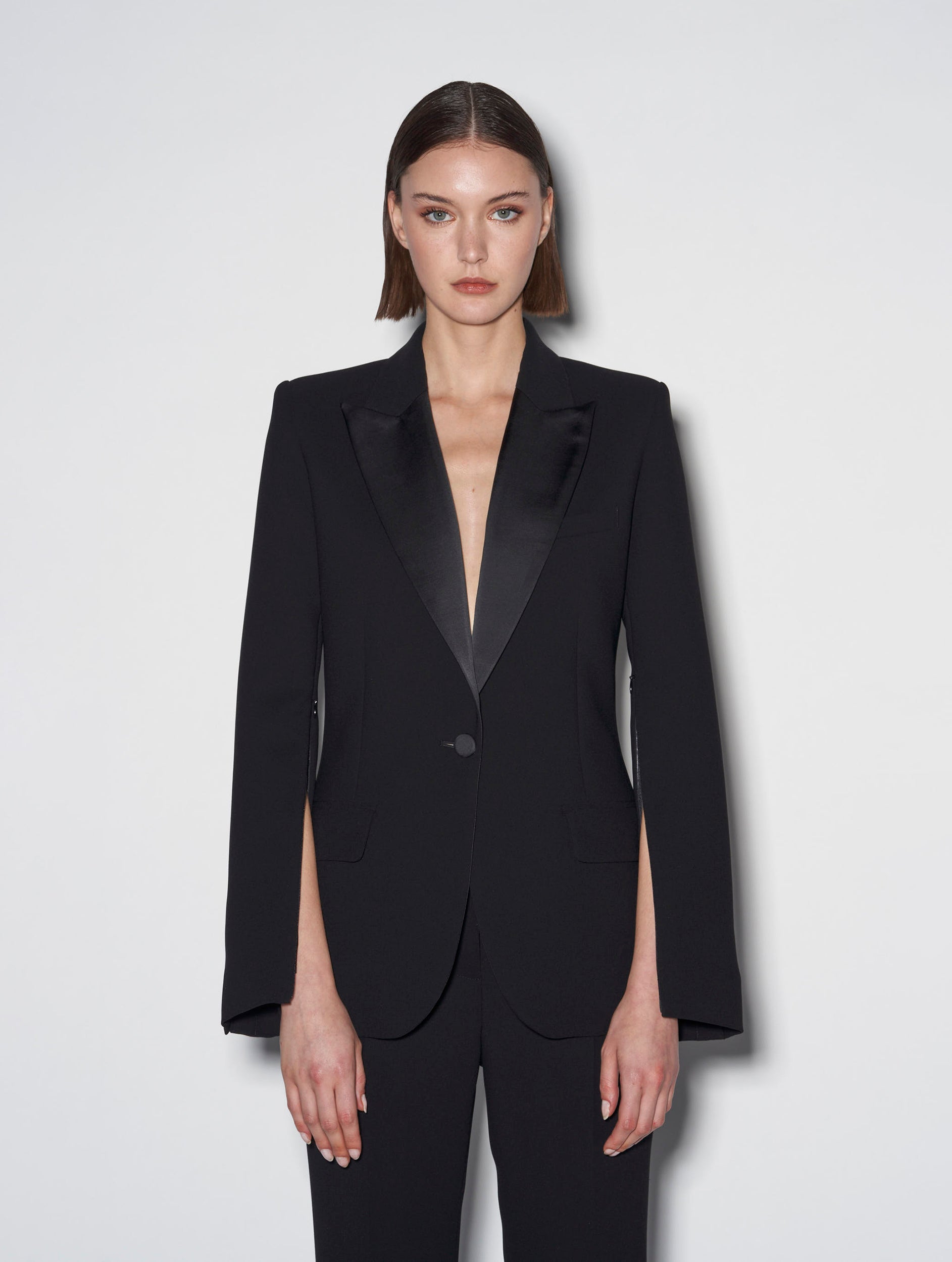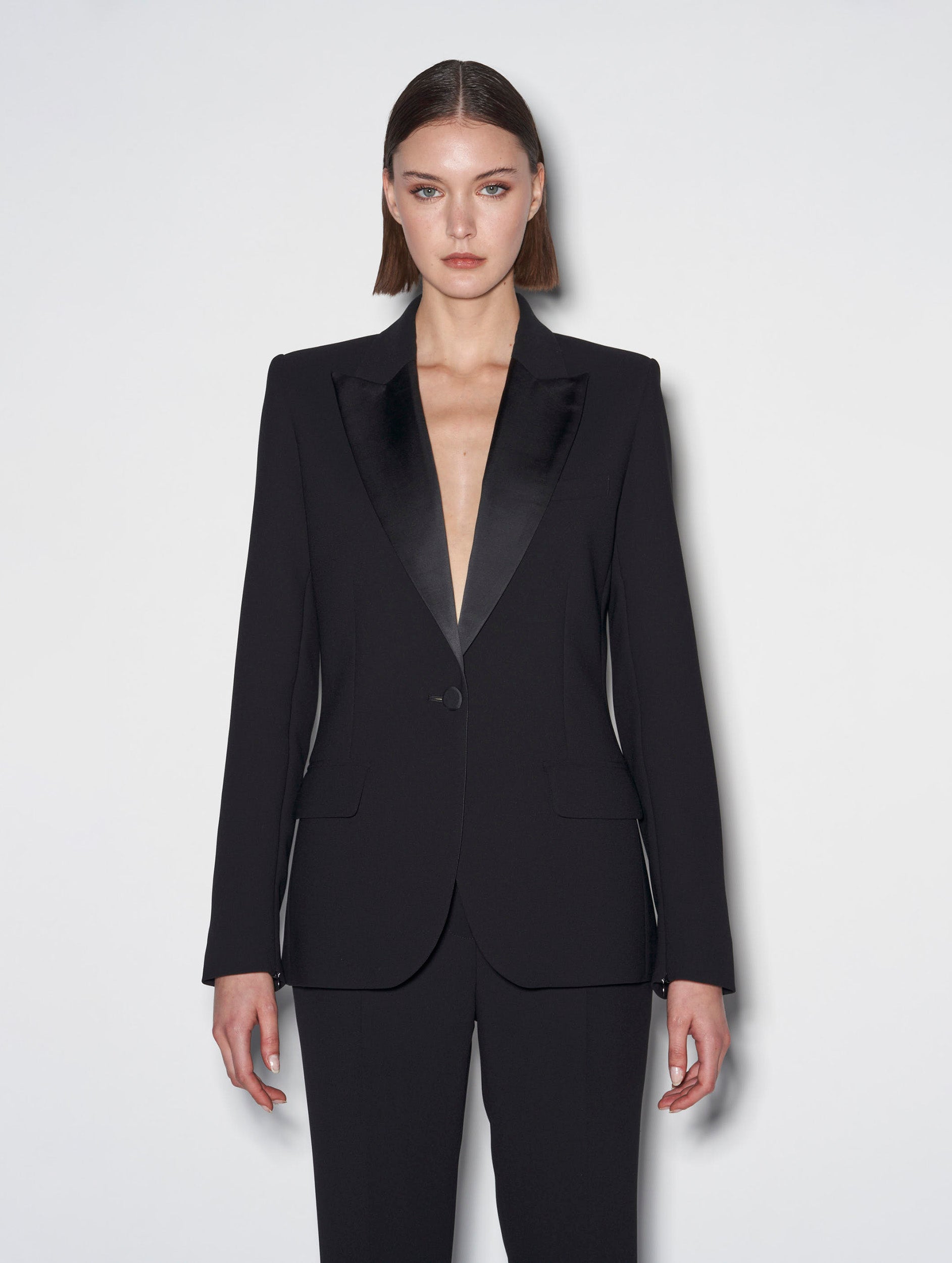 This timeless black crepe jacket with its wide shawl collar in black silk satin will bring an elegant touch to your evening or formal occasion wear. This women’s tuxedo jacket features a covered button and discreet zips on the sleeves enabling the jacket to be worn like a cape. The jacket is enhanced with faceted crystal jewel buttons on the cuffs and our signature silver metal piercing at the back. For maximum effect wear this women’s black suit jacket next to the skin teamed with the matching flared suit trousers.