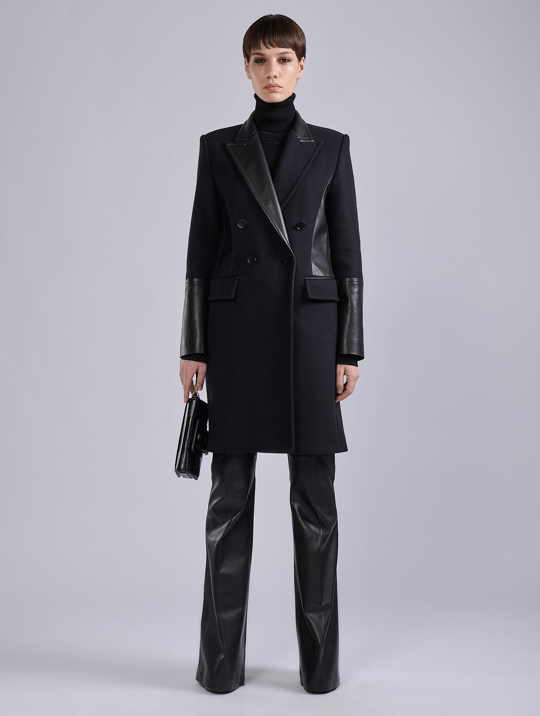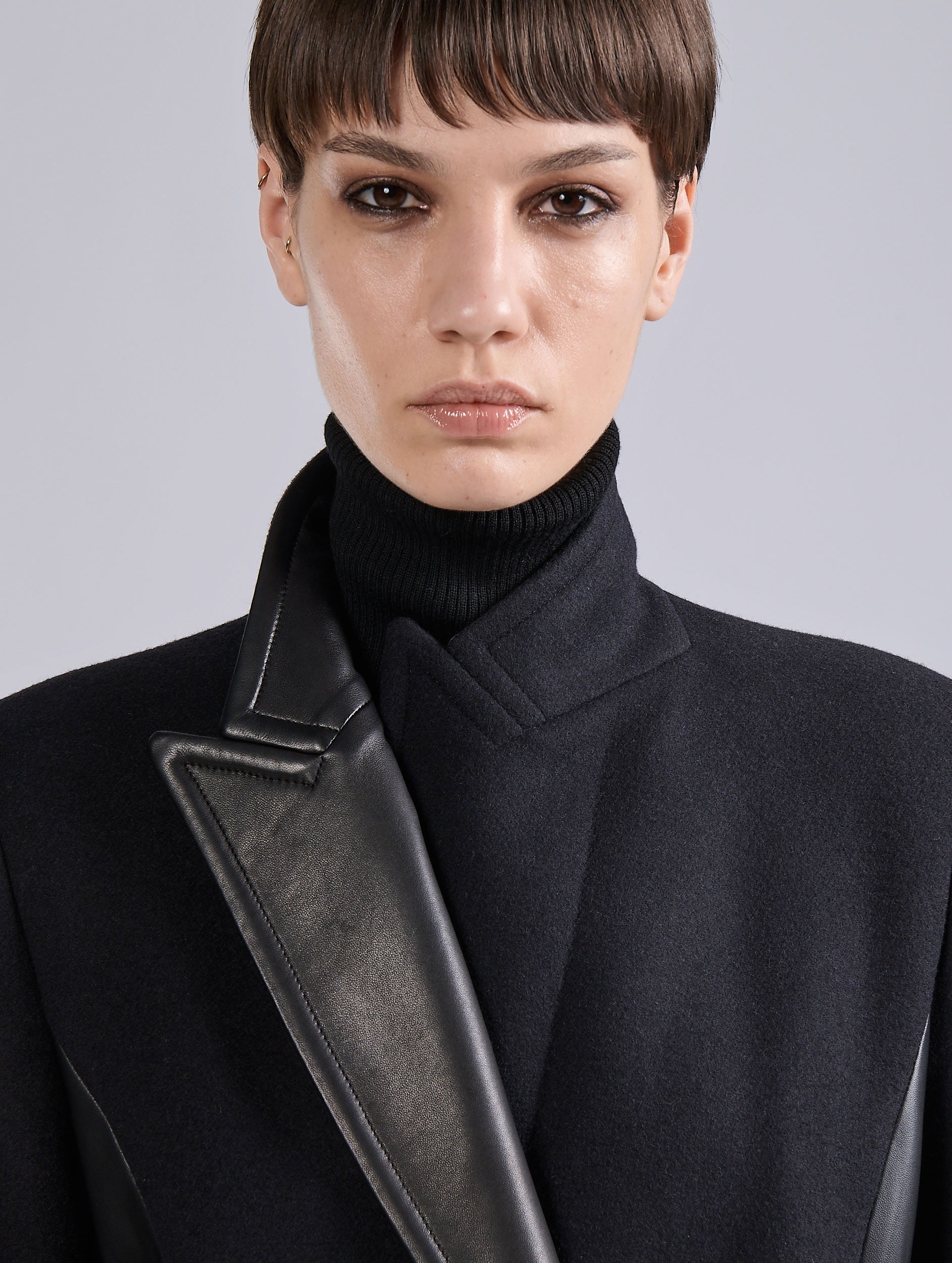 This bimaterial coat embodies the quintessence of Barbara Bui style. Renewing the codes of tailoring, it infuses them with a rock aura enhanced by black leather skilfully married to wool and cashmere drape. The graphic construction of this double-breasted coat underscores its elegant straight cut, with leather inserts on the sides accentuating its bending effect. This coat, with its zipped leather cuffs and notched collar punctuated with tone on tone leather will become a timeless piece of your wardobe.