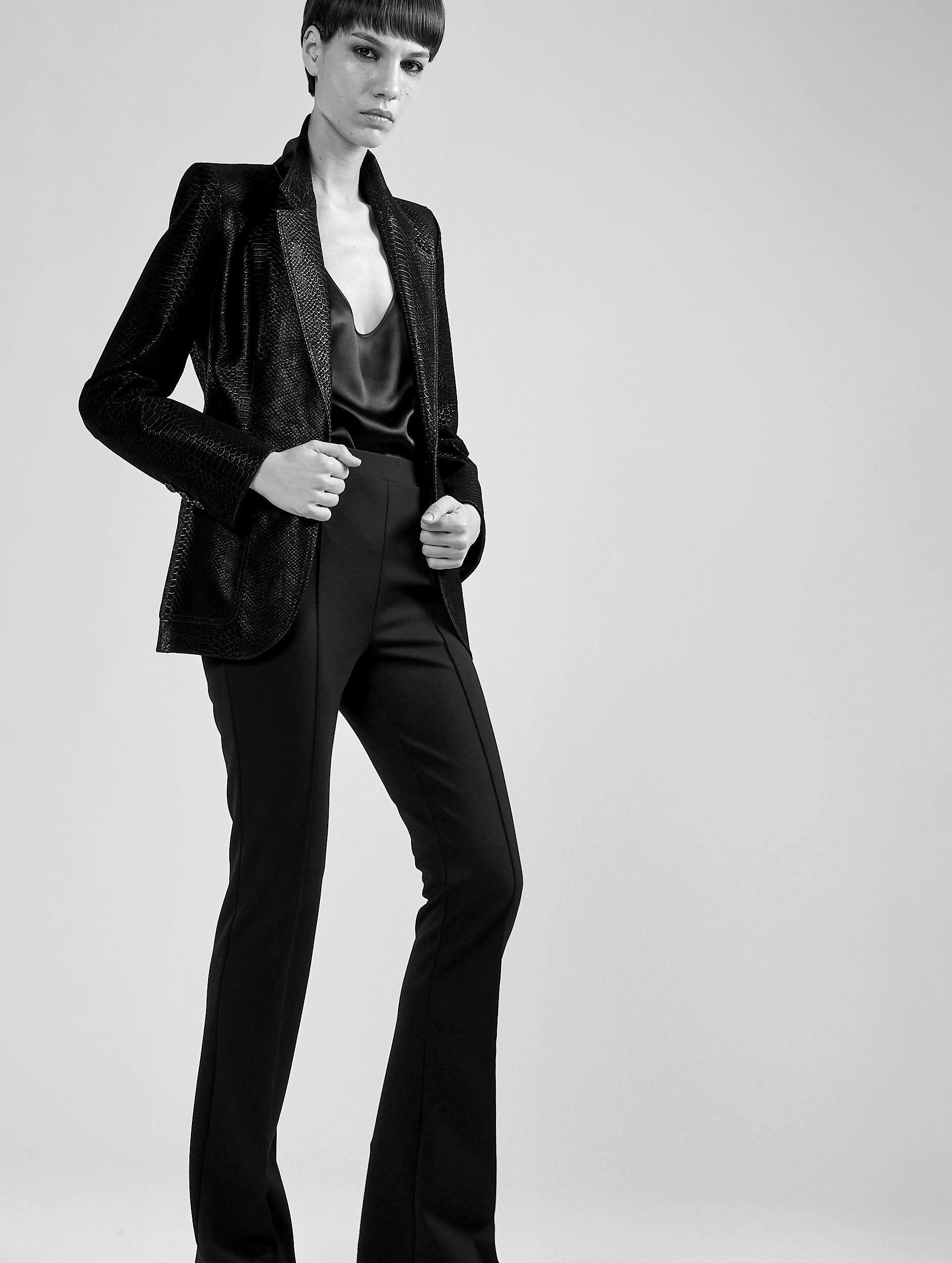 This suit jacket immediately structures the silhouette, subtly emphasizing the build. Crafted in black velvet flocked with python scales, this sophisticated rock blazer is the highlight of any outfit. Its wide, notched collar and two patch pockets lend modernity to this women's jacket, which reveals a meticulous construction enhanced by cleverly placed back seams and a slit guaranteeing a seyant fall. The play of textures is enhanced by the deep black chosen by Barbara Bui for this versatile jacket to be worn as a second skin or over a flowing satin top, the perfect balance between strength and softness, from day to night.