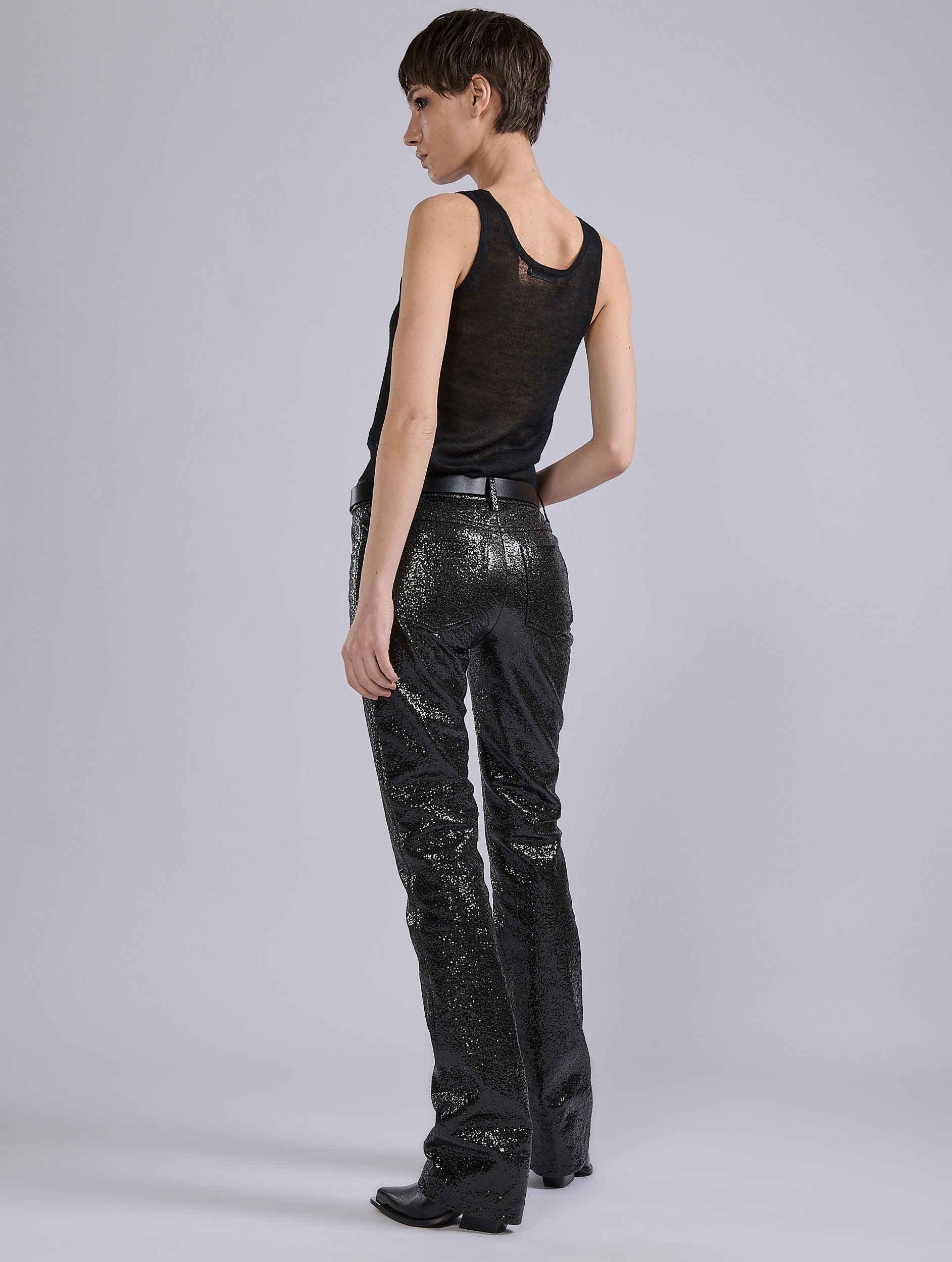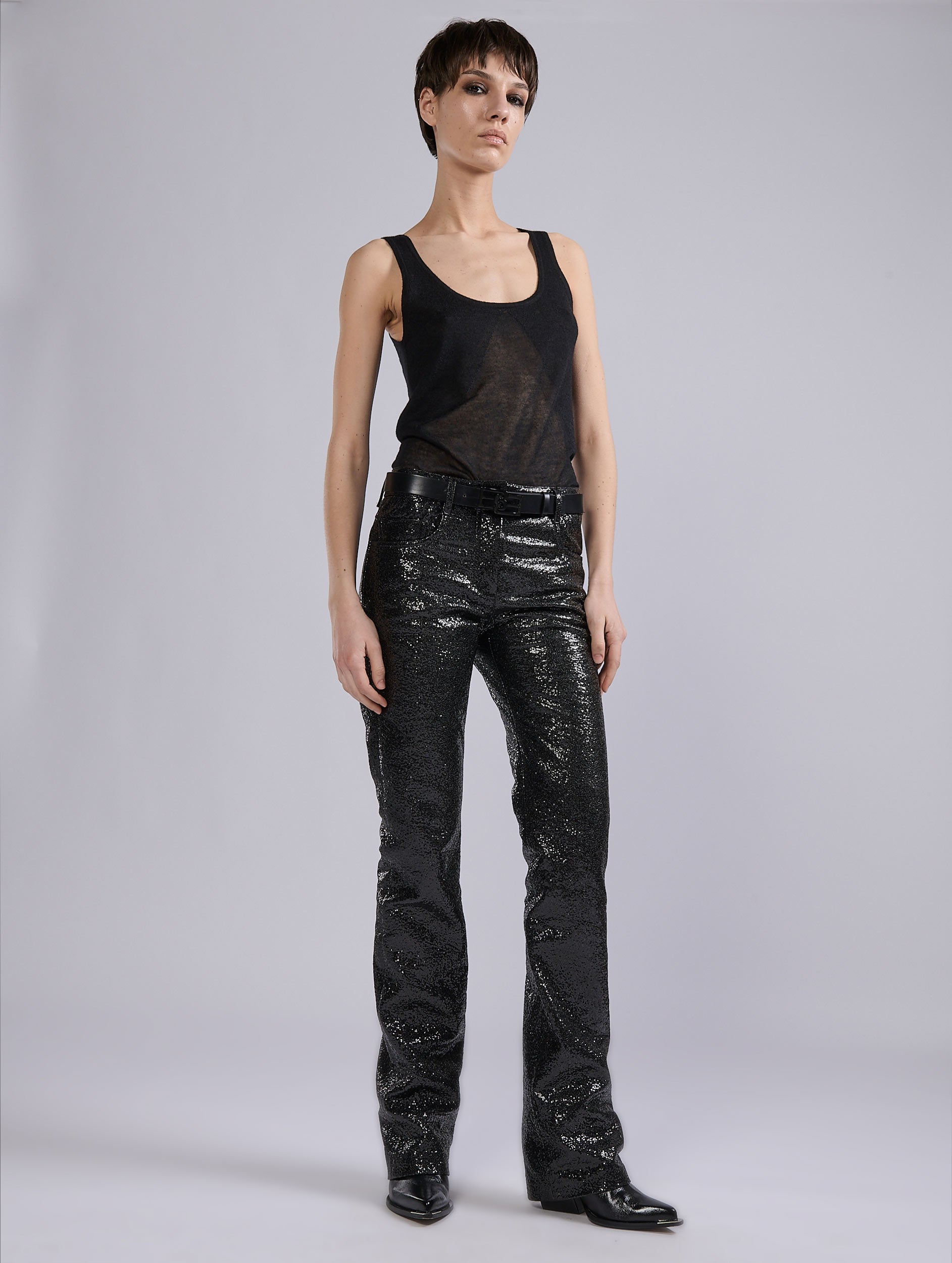 The evening jean according to Barbara Bui! Cut like a 5-pocket jean, this black pant is actually made from a fabric entirely covered in frosted sequins, catching the light with every movement. Its classic straight line accentuates its urban silhouette. Pair these pants with a matte black or subtler monochrome, echoing its sensuality with delicate transparency, like one of our fine knit sweaters with a cashmere-touch voile feel. A must-have to shine effortlessly from morning till night.