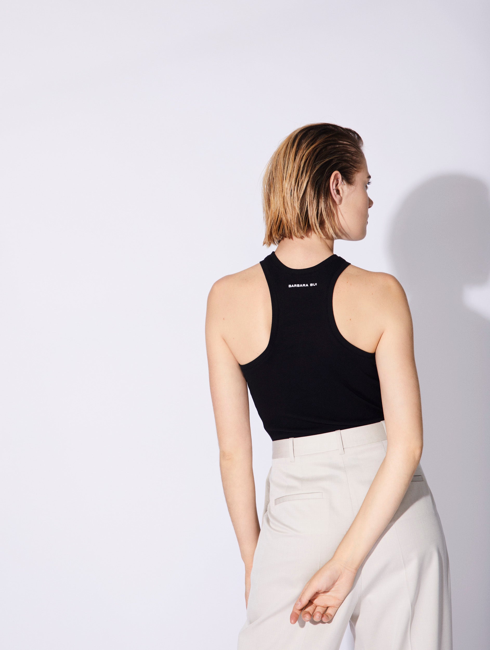 The sporty-chic style favoured by Barbara Bui is reworked with her typical rock touch. Enhanced with a detachable silver metal piercing, this women’s tank top will be one of your essentials all along the summer. The halterneck and open back sculpt the feminine silhouette. In black or white, this tank top in soft comfortable ribbed jersey is also available in blue.