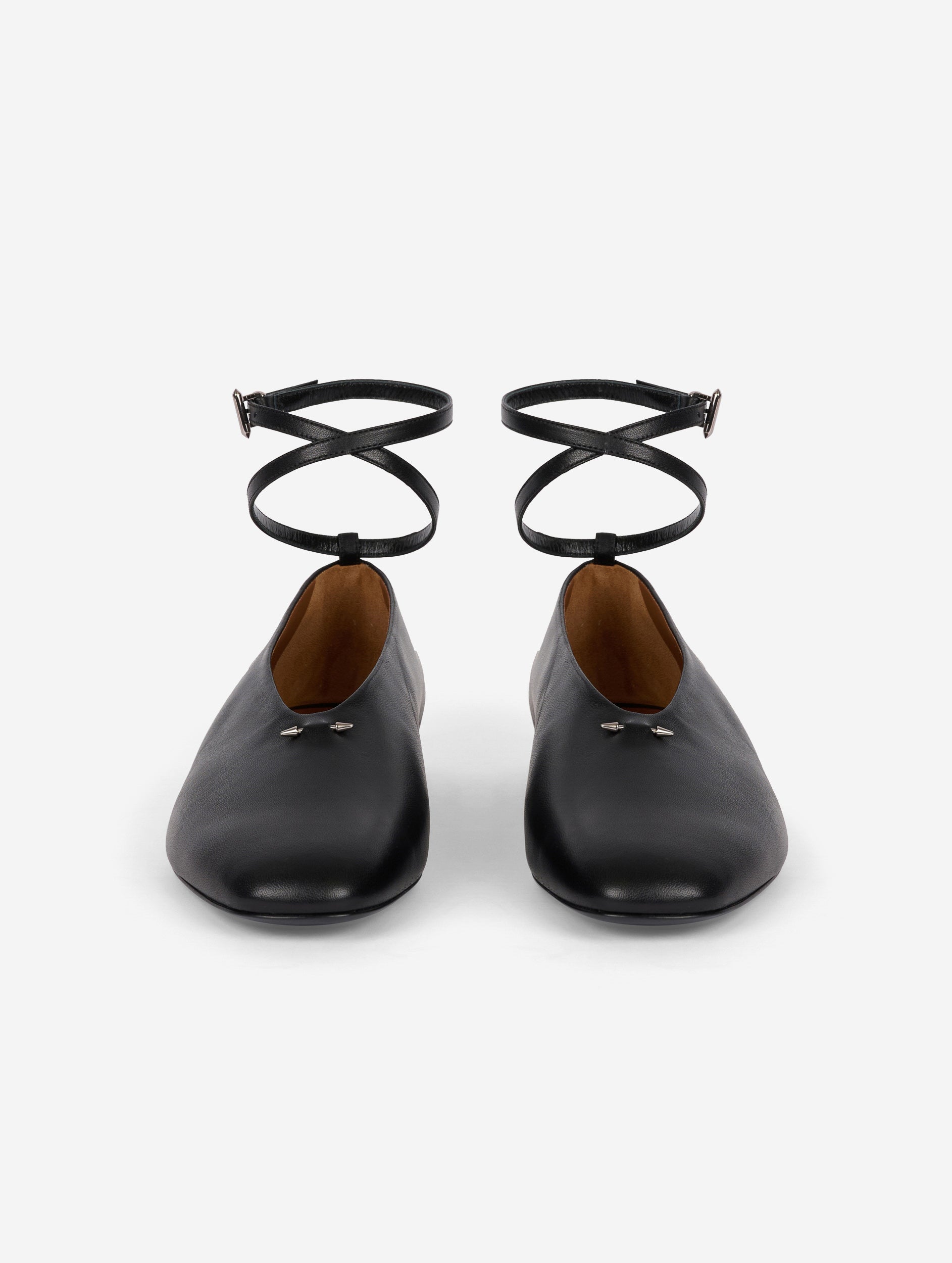 Black lambskin nappa leather ballet flats with delicate criss-cross ankle straps. High neckline accentuated by the House's signature piercing. 12mm flat heel and leather sole.