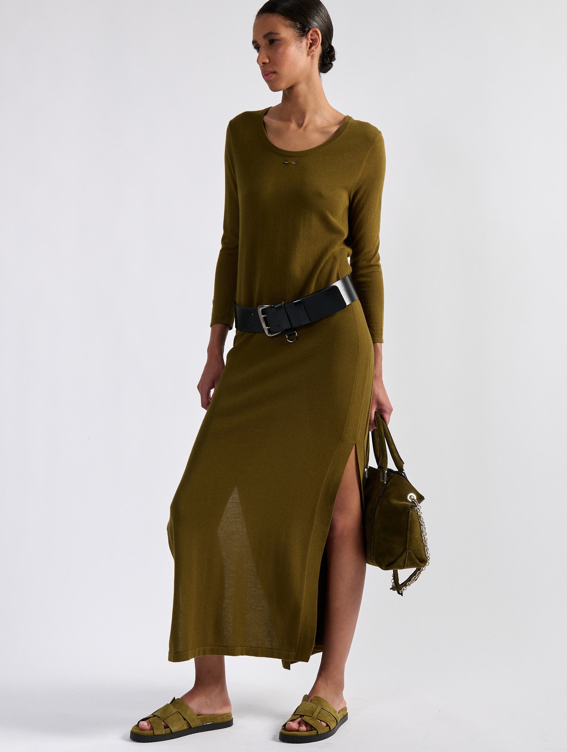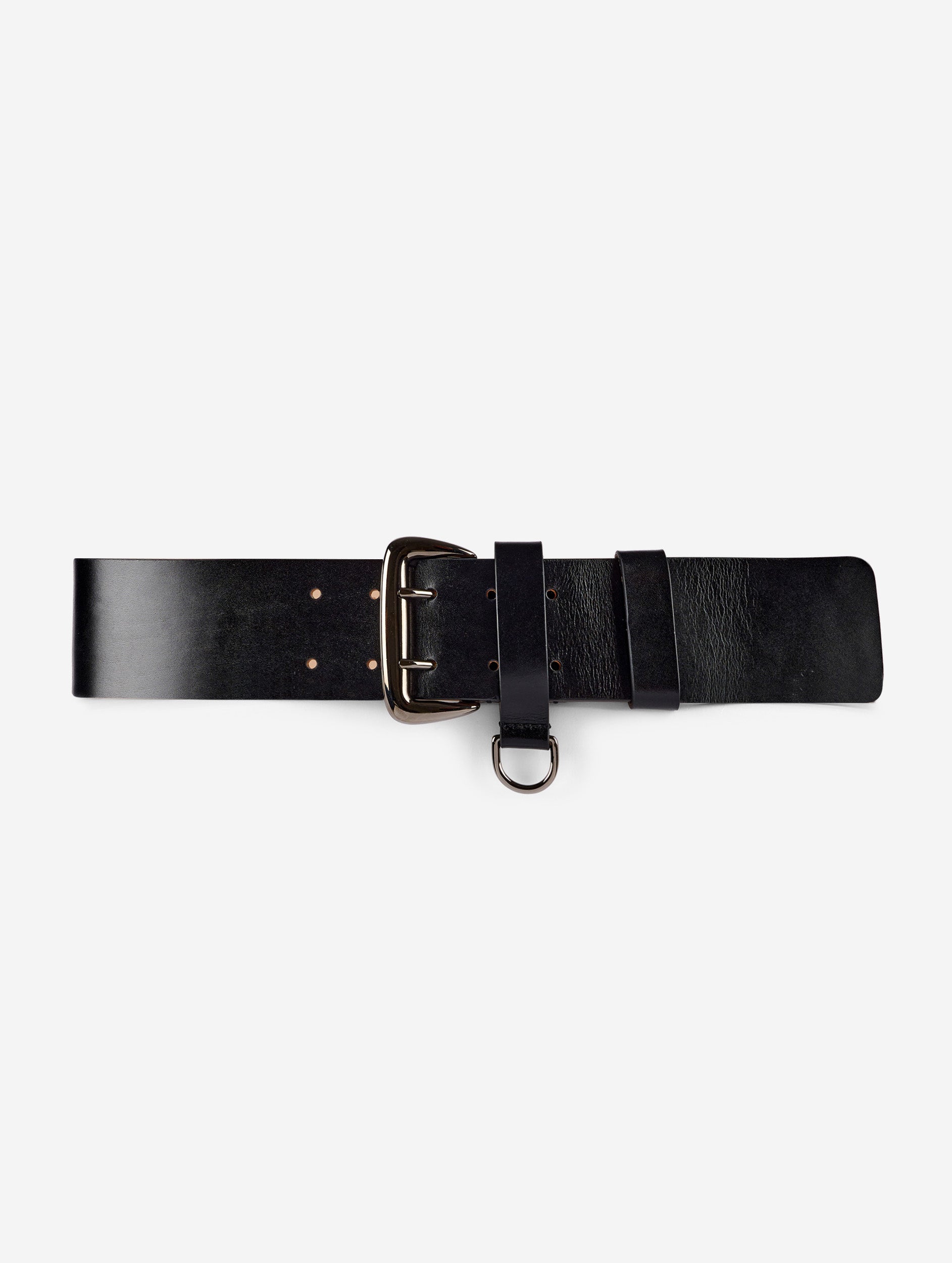 Large military belt in shiny black vegetable-tanned leather. Shaped cut-out to follow the low waistline. High double pin buckle and ‘D’ ring on a loop in gunmetal finish to reinforce the martial spirit. 5 double-row adjustment holes, height 60 mm.