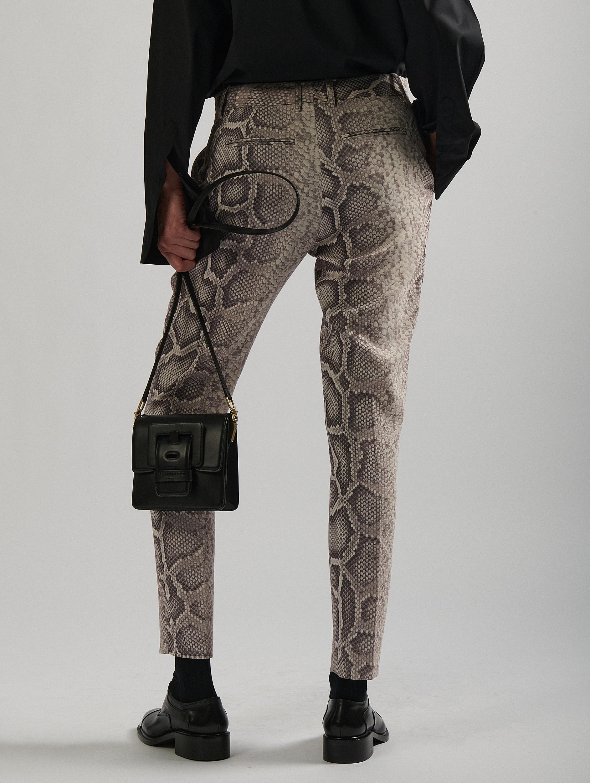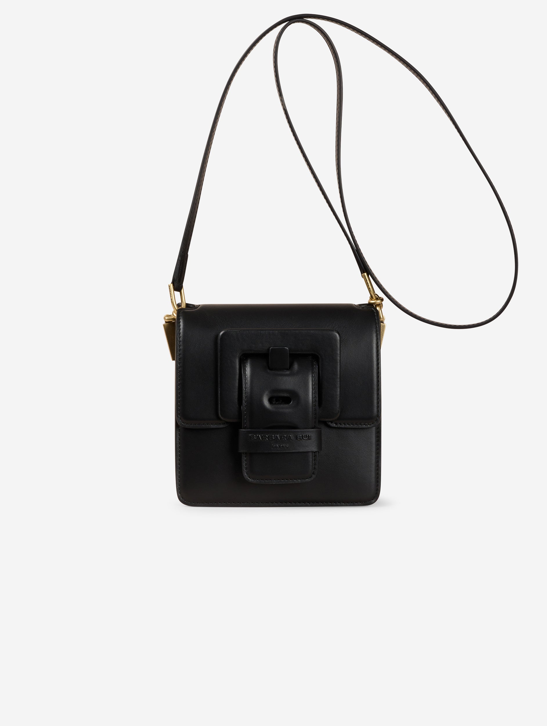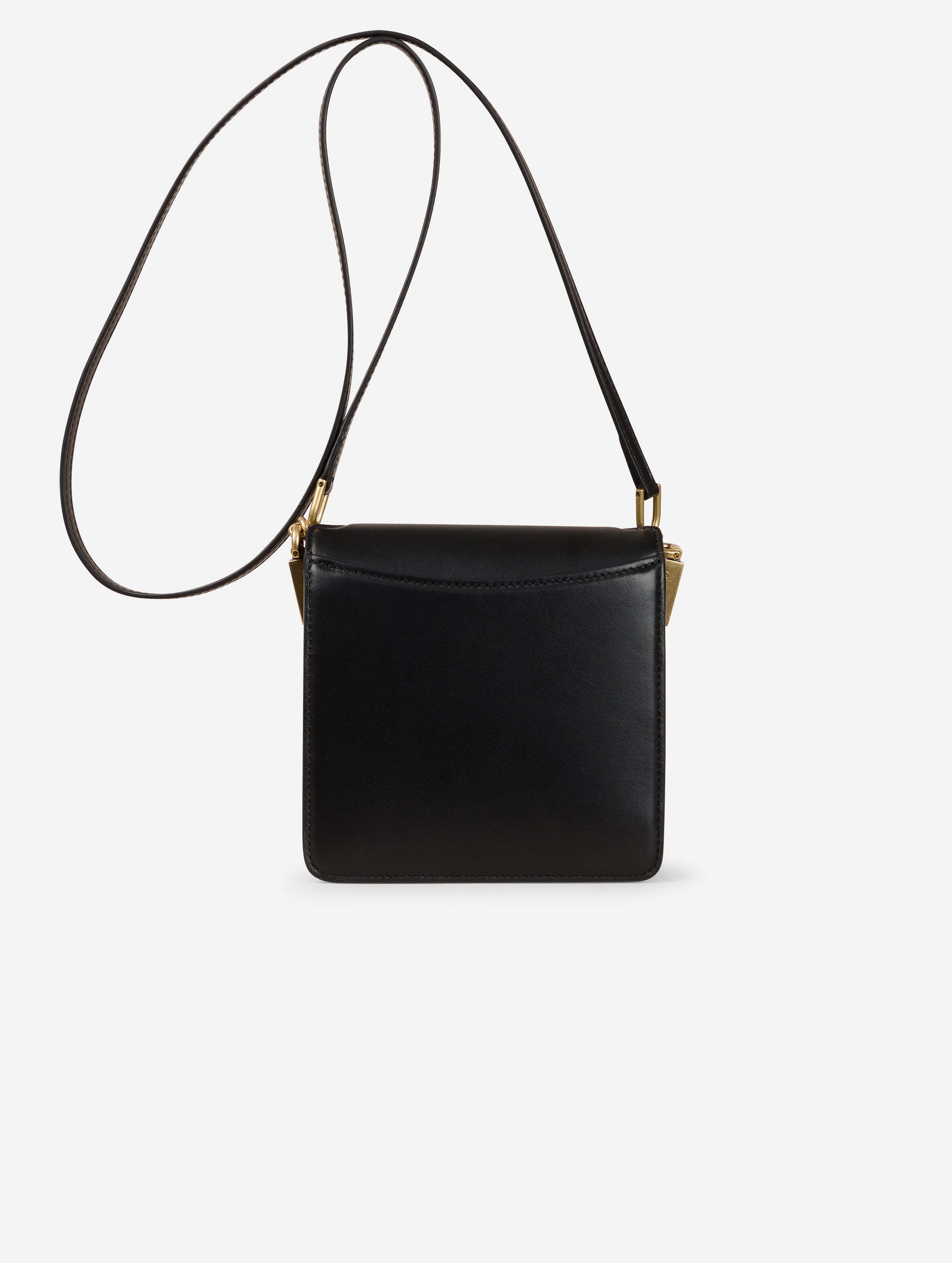LOVE ME bag in smooth black leather. 120 cm long narrow shoulder strap for crossbody wear. Large decorative reinforced leather buckle on the magnetic closure flap. Front pocket, back pocket to keep your smartphone handy and inside welt pocket. Height: 16cm/ Length: 16cm/ Depth: 6.5 cm.