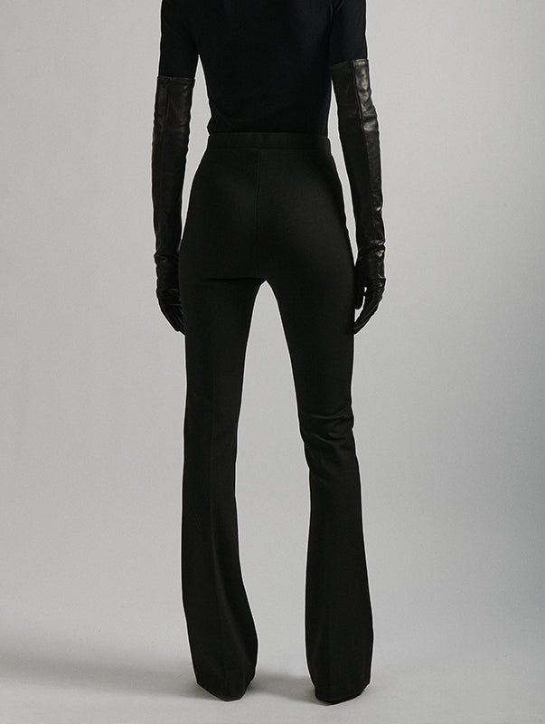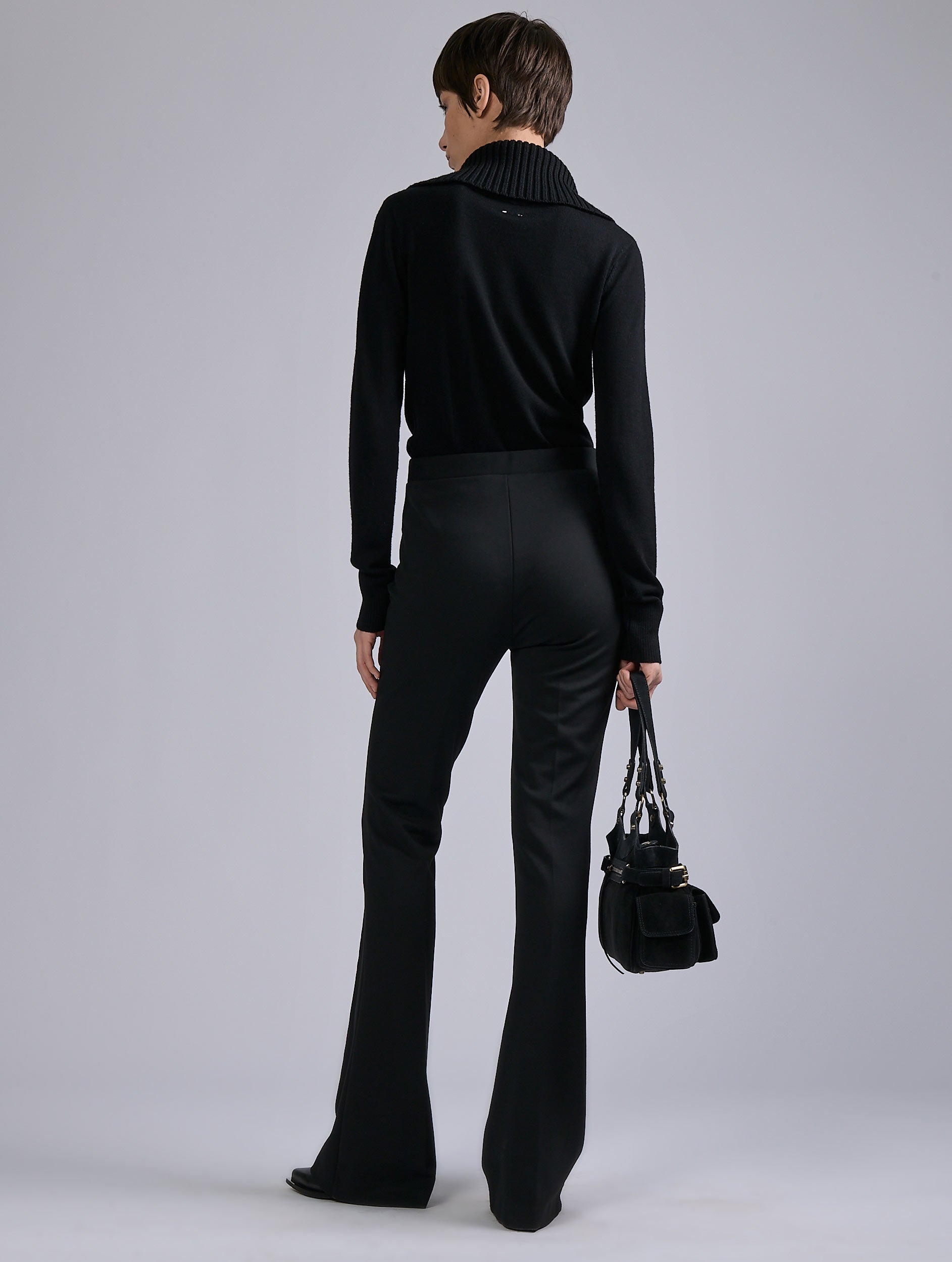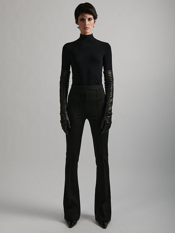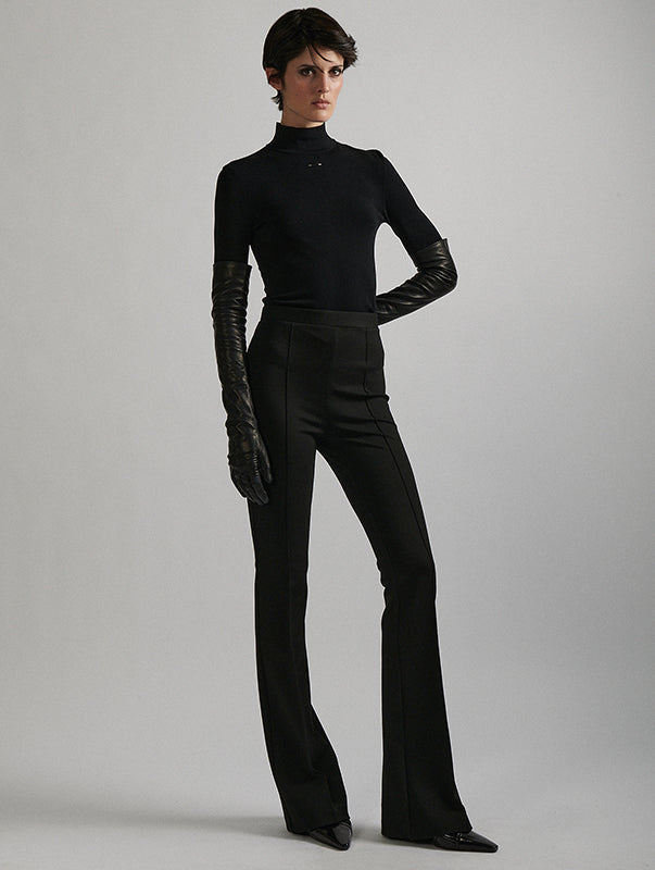A Barbara Bui essential, the milano jersey leggings flatter the silhouette perfectly. Clean and minimalist, it substitutes for pants when paired with our knit pieces or a tunic. Its high-waisted bootcut shape and pleats elongating the leg contribute to its flattering fit, while its stretch material ensures long-lasting comfort without losing shape. This black legging with clean lines is a timeless piece that will become an invaluable ally in creating a wide range of looks, from the most elegant to the most casual on weekends.