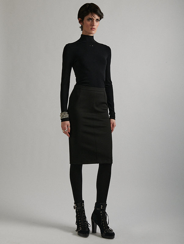 A staple for business looks, the pencil skirt acquires a new elegance by making shaping milano jersey its best asset. The sleek style of this black knee-length skirt flatters the body, promising a fitted fit and long, elegant legs. Its stitched pleat at the front and carefully placed seams are a testament to Barbara Bui’s sartorial expertise, entirely devoted to femininity.