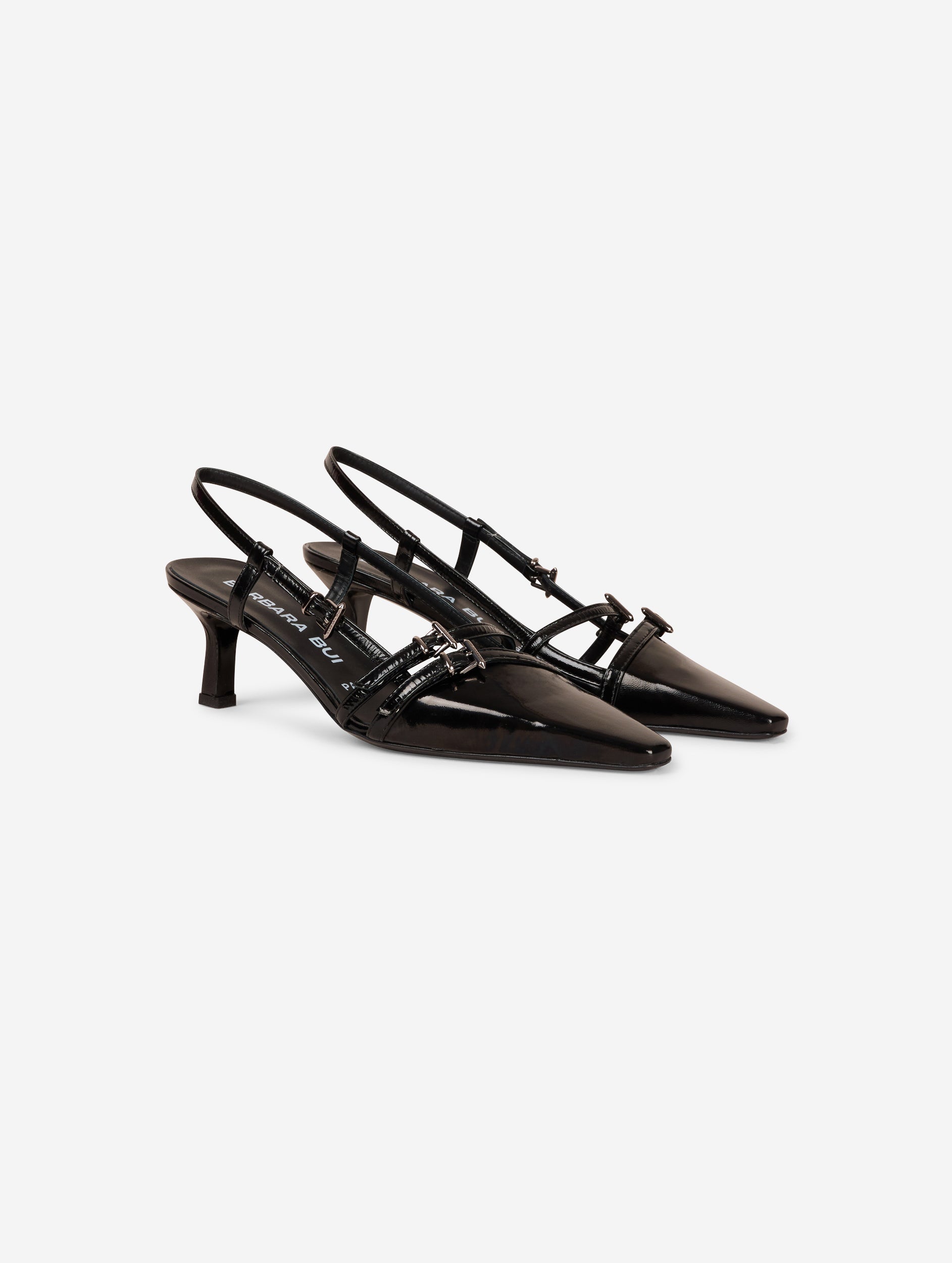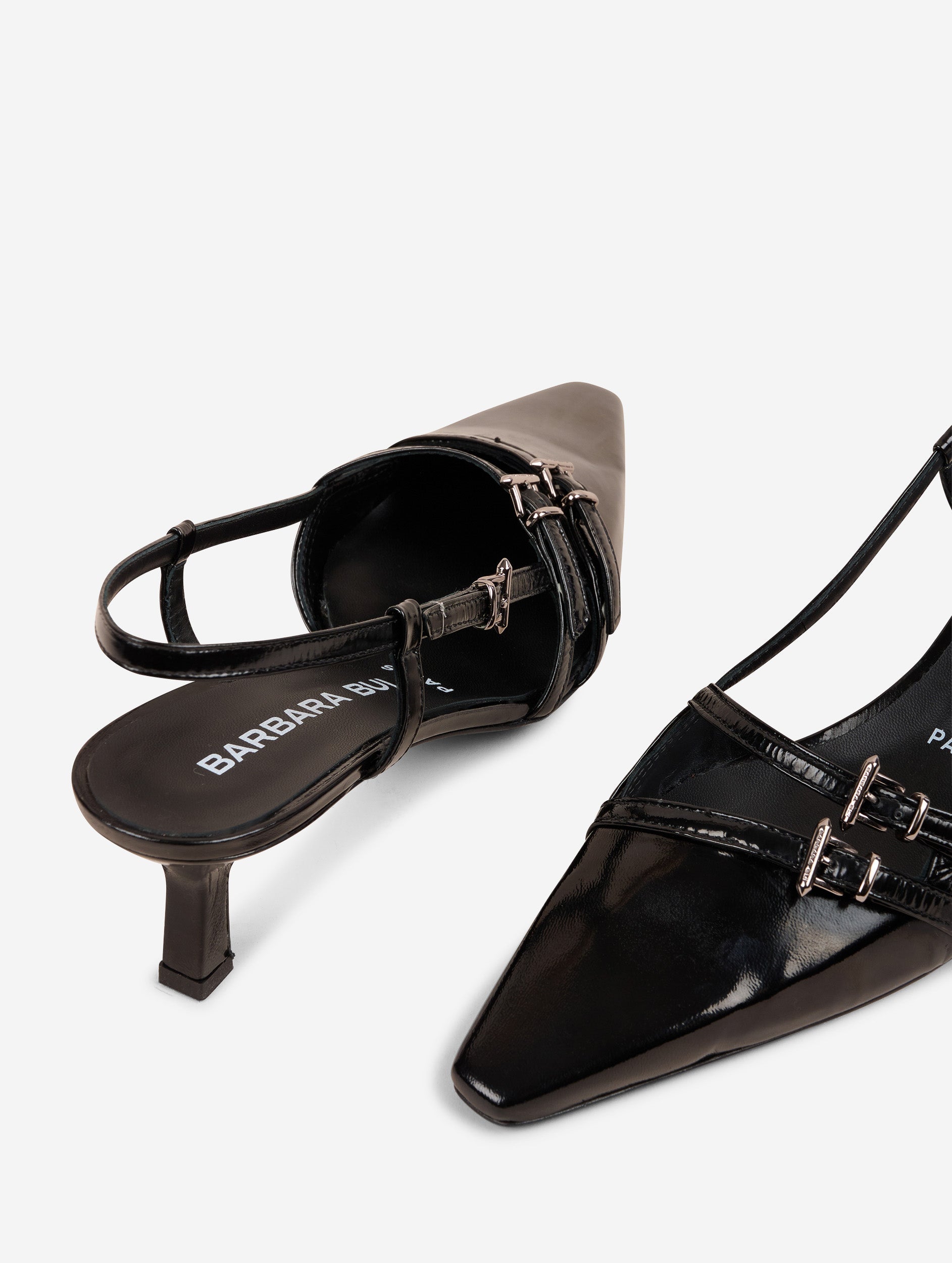 Open-back pumps in black patent leather. Fine asymmetrical straps with nickel-finish buckles. Sexy little 5.5 cm heel covered in tone-on-tone leather.