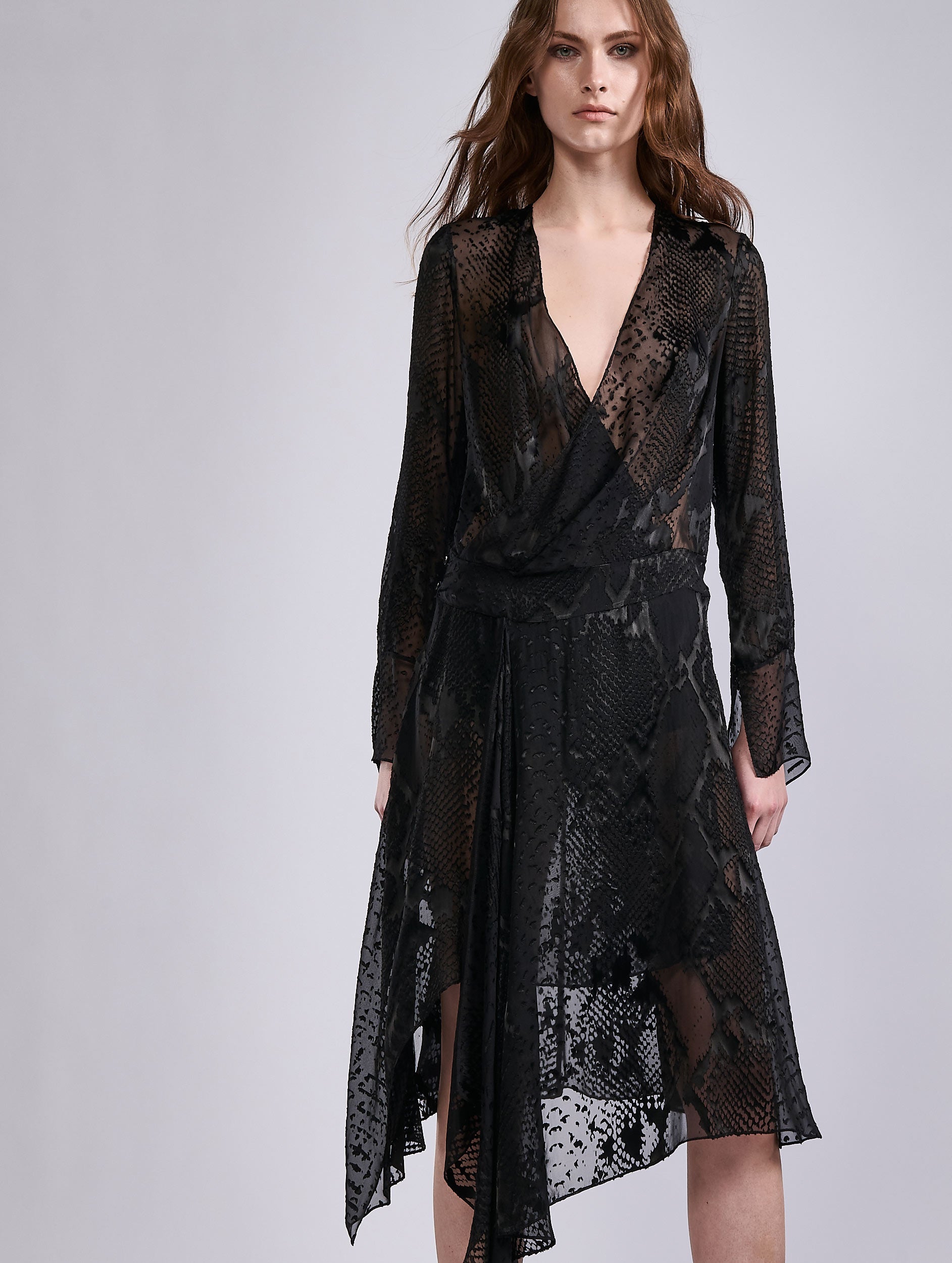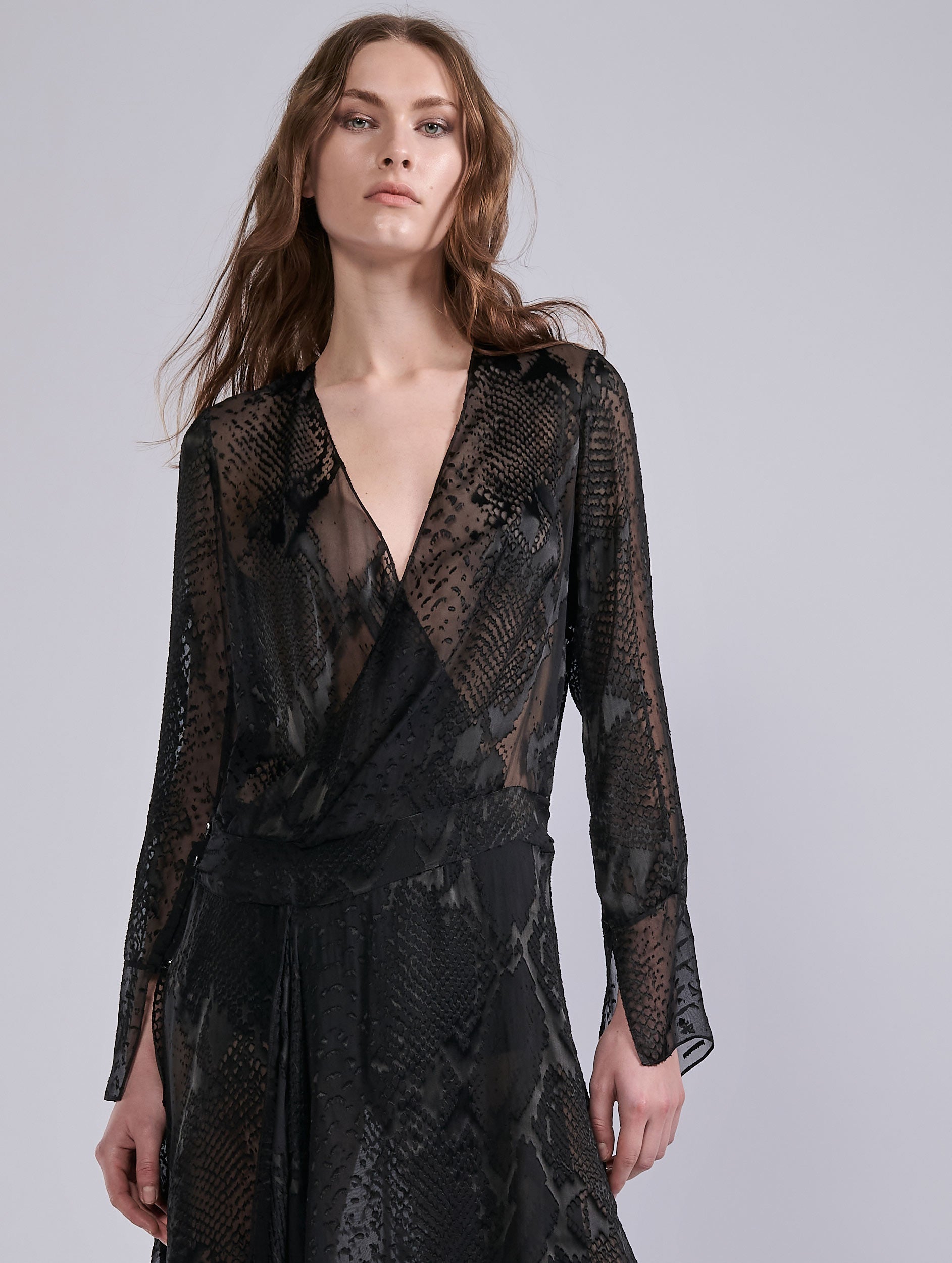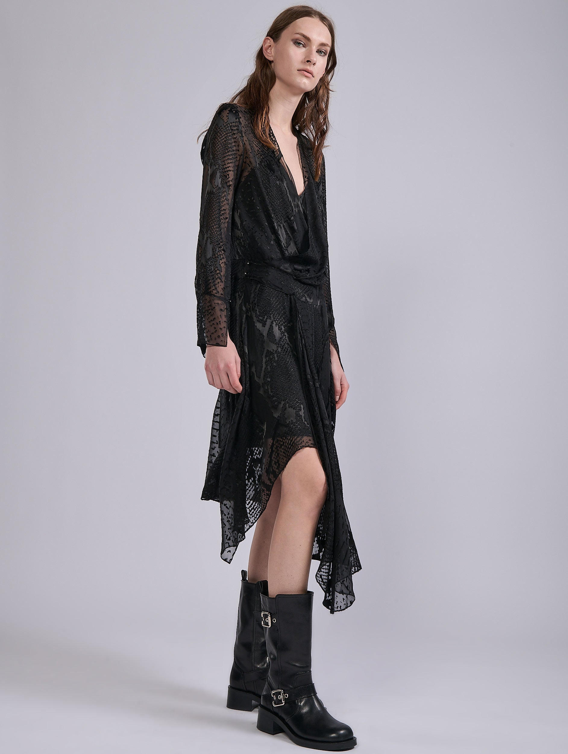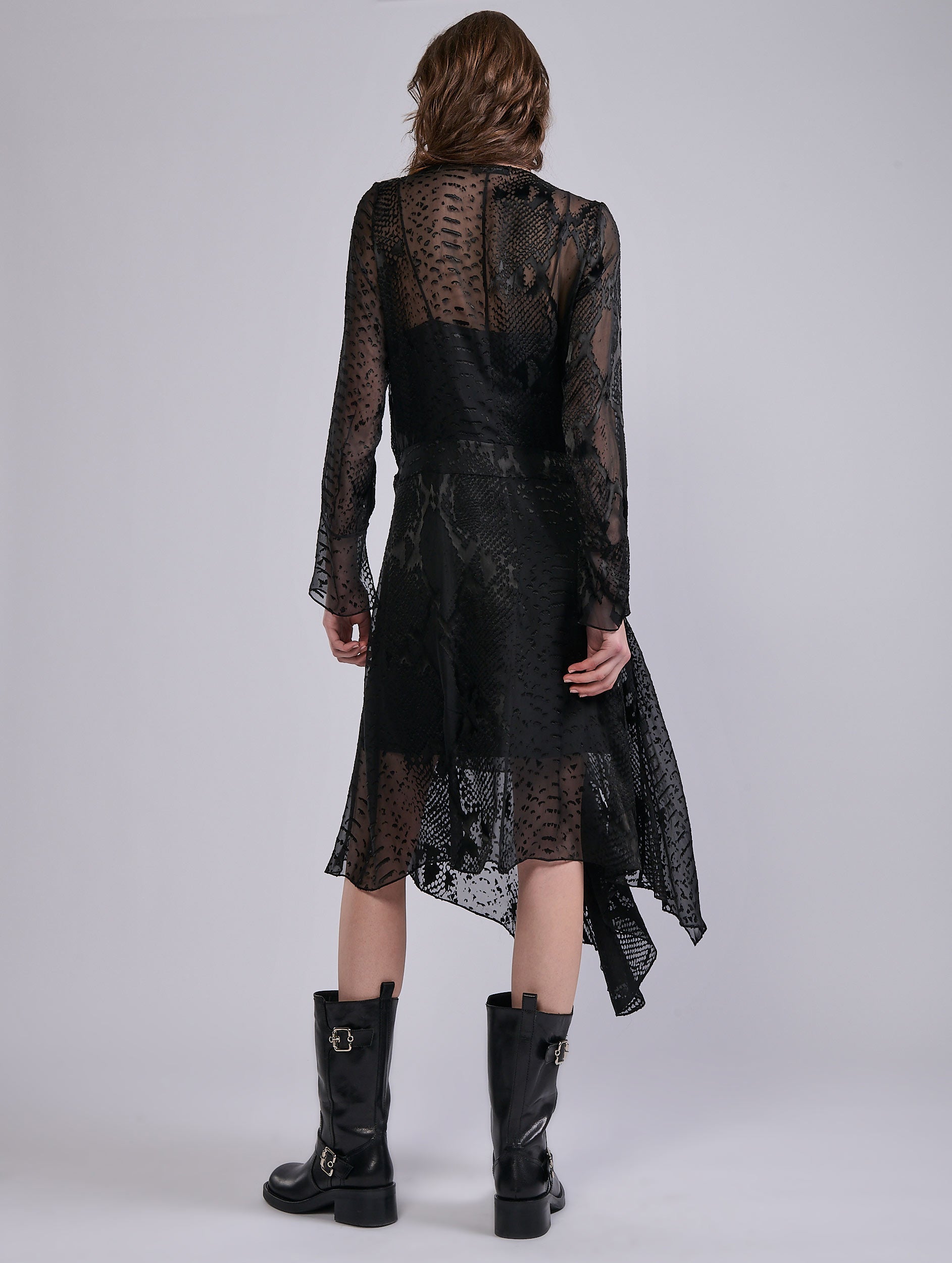 Crafted in python print satin devoré, this wrap dress is available in timeless black or powder pink. Held in place with two discreet buttons, this flowing wrap dress is comfortable to wear and has a belted waist. Featuring flowing scarf panels and delivered with a slip dress, this sexy, refined piece plays with transparency without revealing too much. Long sleeves delicately slit at the wrists, accentuating the airy elegance of this piece. To contrast with the evanescence of this fluid dress, add a pair of biker boots to your look.