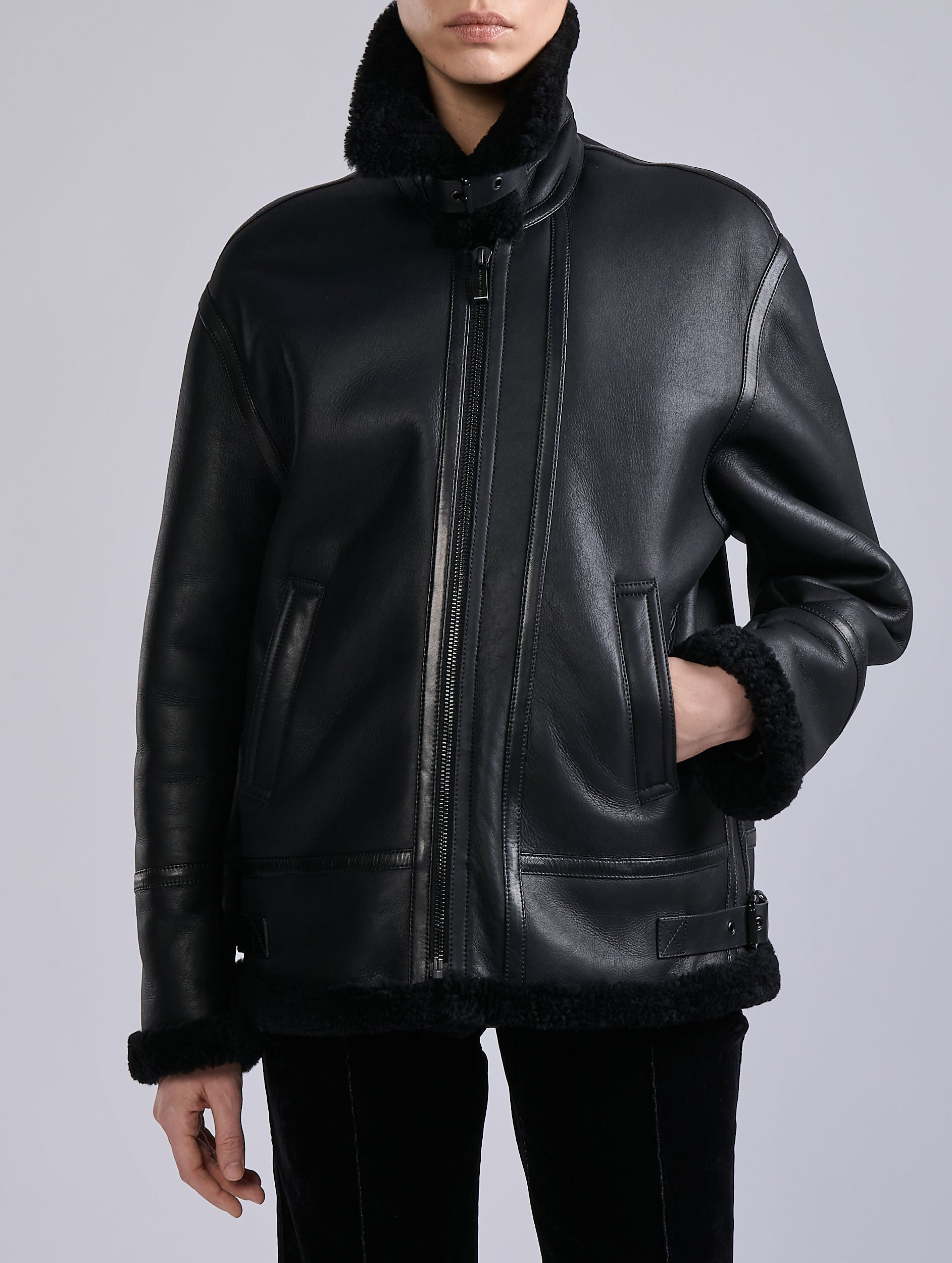Barbara Bui revisits the shearling jacket in a contemporary and sophisticated version. This monochrome coat has a straight cut, structured by functional details such as the side buckles and the collar buckle, which allow this warm jacket to be worn in a variety of ways while maintaining its elegant lines. Tone-on-tone, smooth leather trims discreetly underline the contours, for a graphic, racy silhouette from morning to night. Featuring deep pockets, this shearling jacket combines warmth and character, embodying the idea of enveloping, modern luxury.
