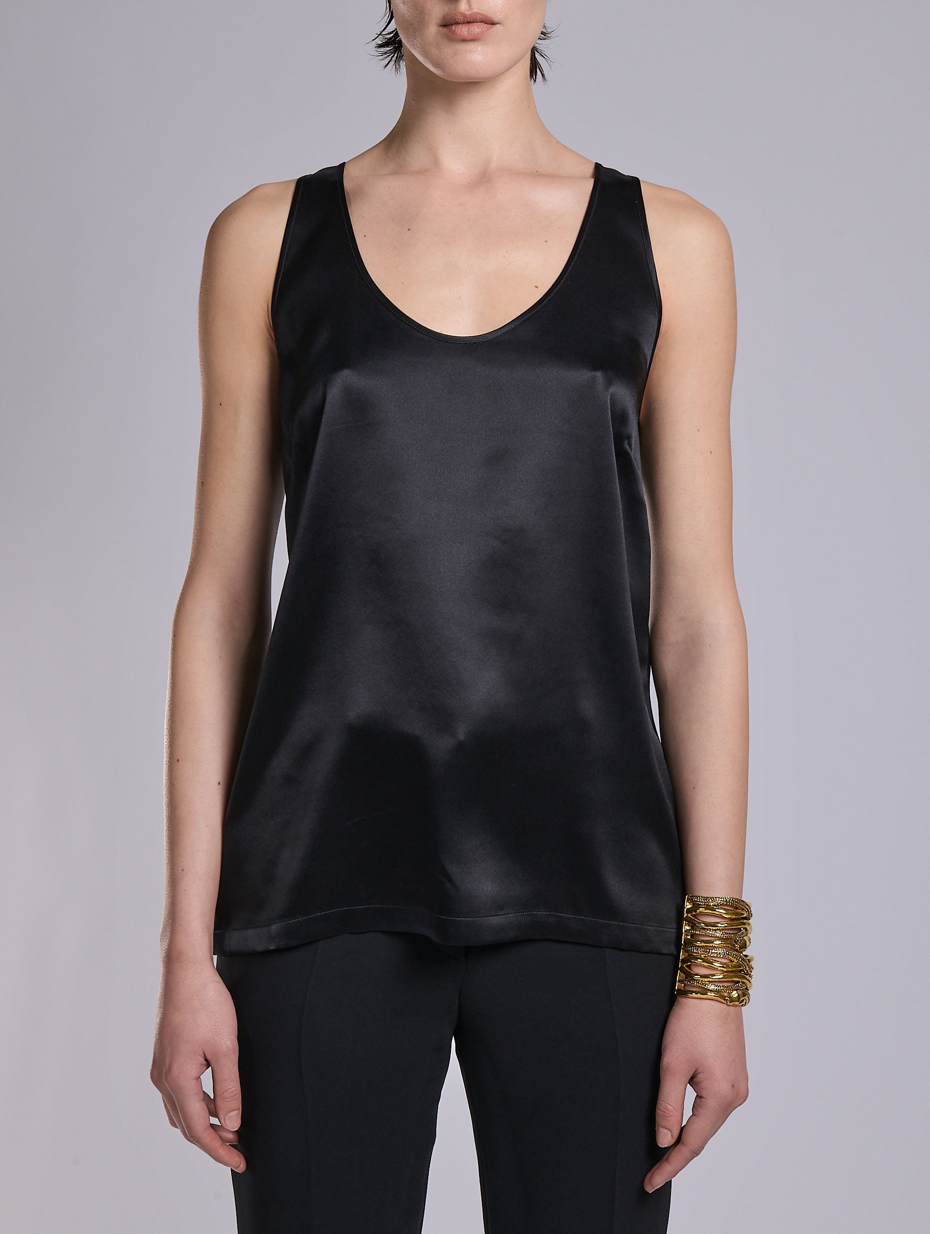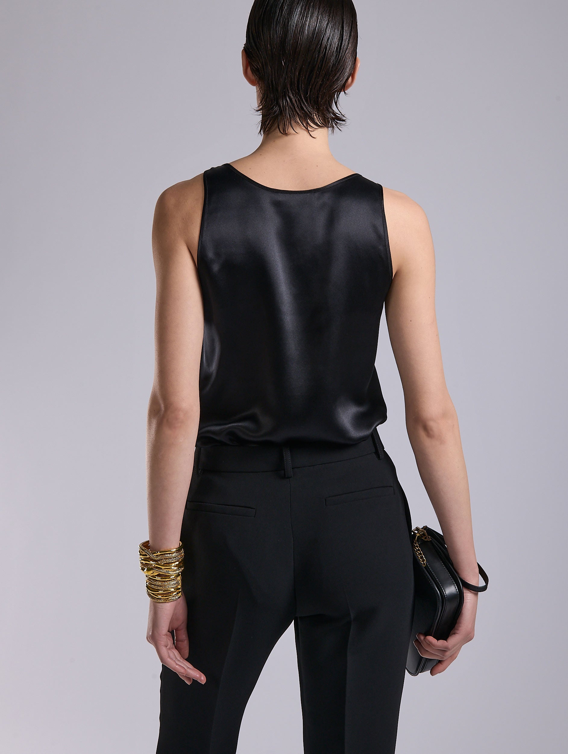 An essential piece in the feminine wardrobe, this black or ivory satin silk camisole exudes discreet sensuality. Its minimalist cut makes it a precious and comfortable basic, easy to slip under a suit jacket by day or wear on its own in the evening. The delicate shine of this top will create a refined contrast with the matte finish of the matching suit, offered in the same timeless shades.