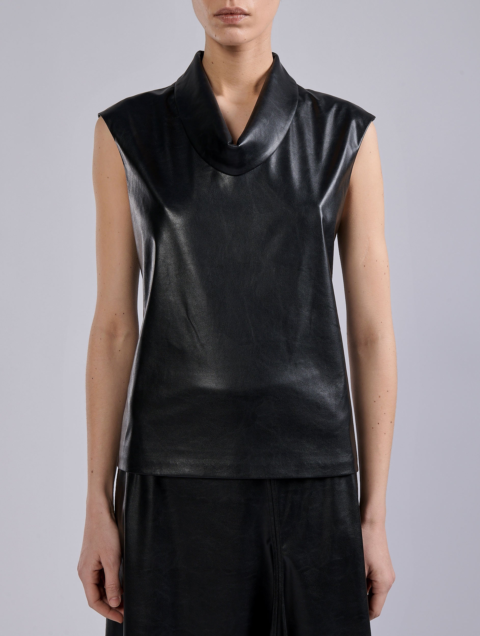 If you’re looking to add the rock-inspired touch of leather to your looks while enjoying the comfort of a lightweight, easy-care piece, this sleeveless top will be your perfect match. Its turned collar, reminiscent of a cowl neck, beautifully highlights your posture. At the back, the top features a zip closure. Surprisingly light, this lined top can be styled in a full leather look with our black skirt, layered under a biker jacket, or tucked into a more sophisticated high-waisted pant for a polished ensemble.
