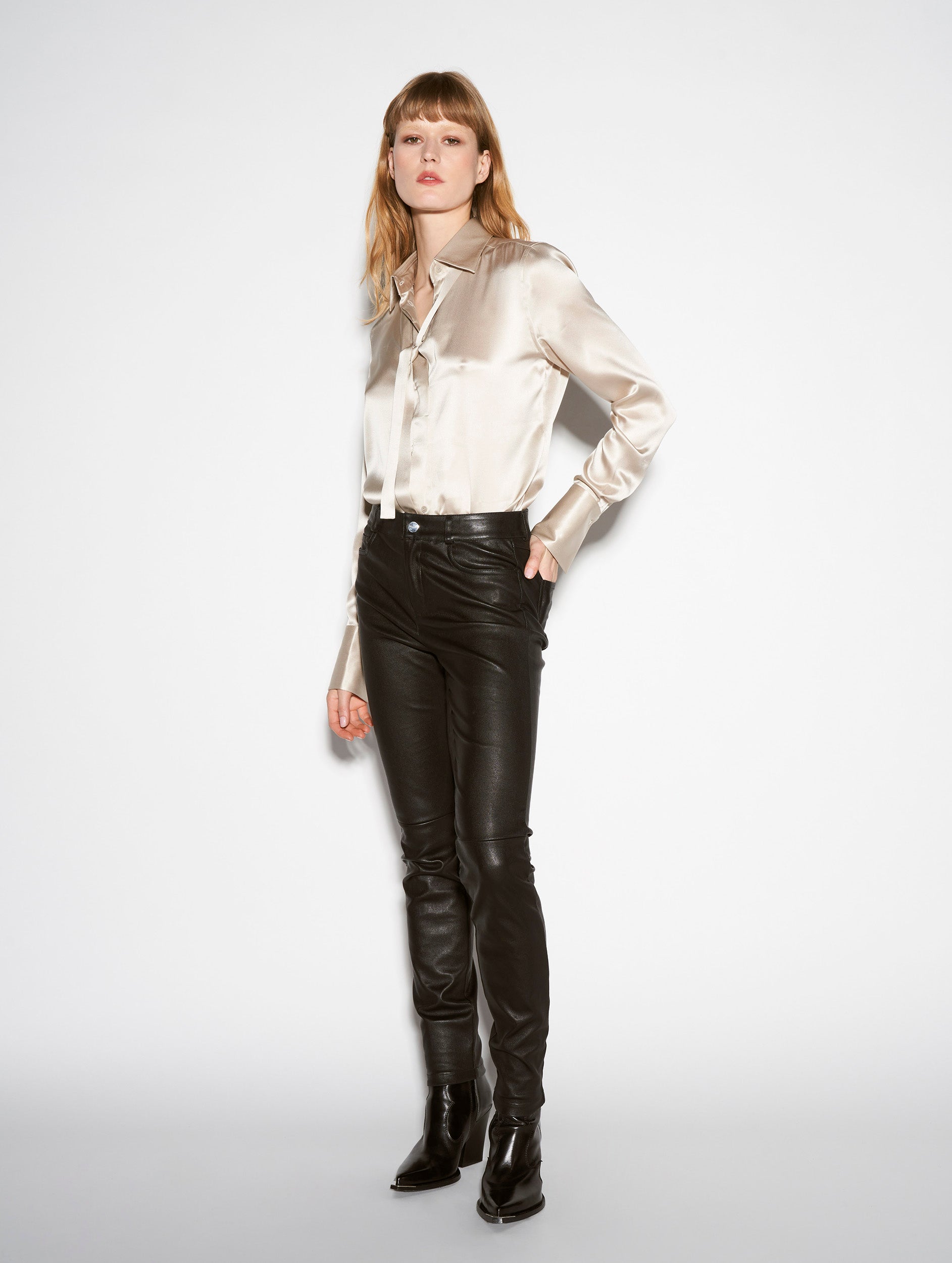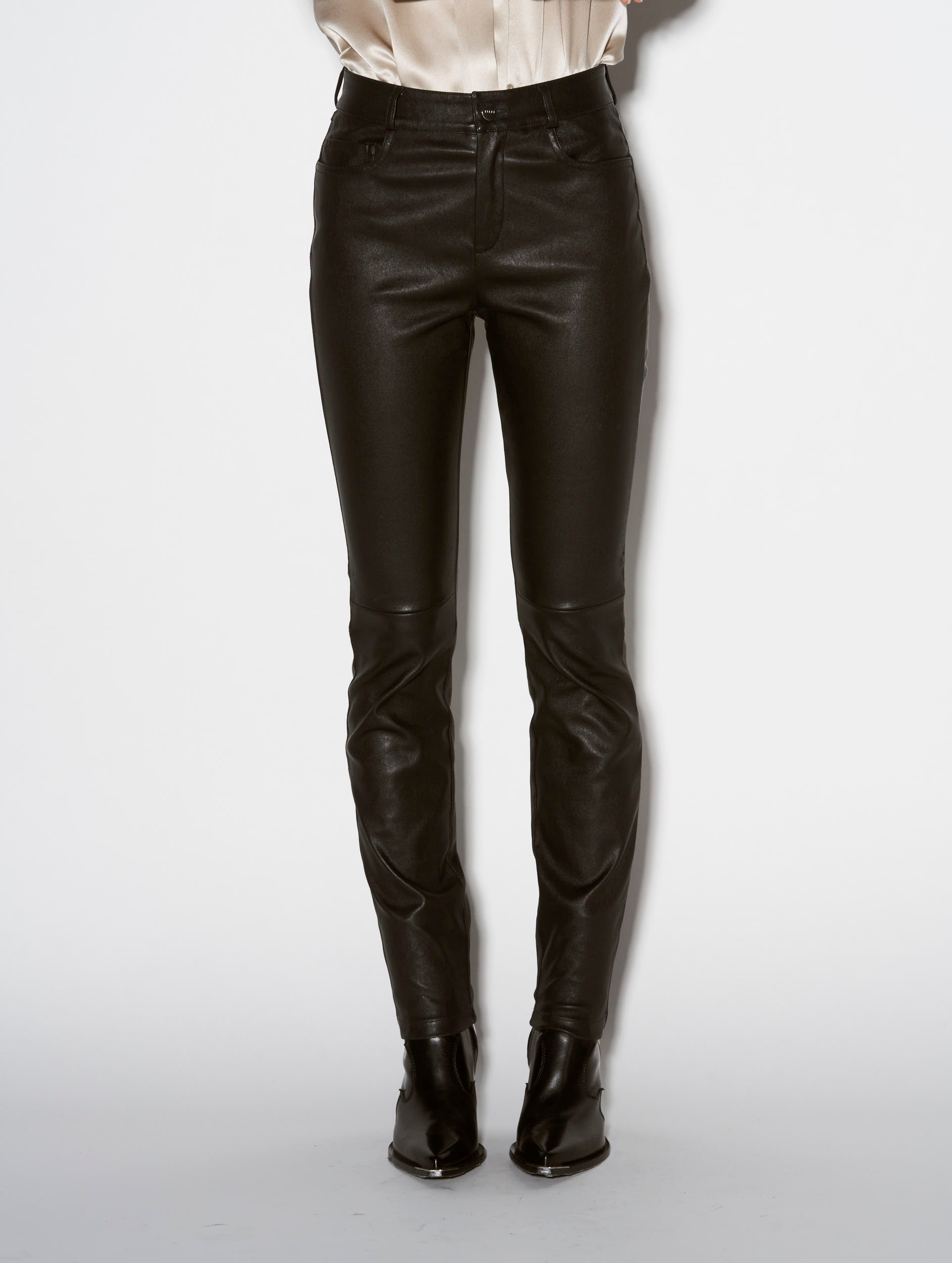 The attractive slim cut and iconic finishing details found in jeans are echoed in these stretch calfskin leather trousers. With 5 pockets including a small ticket pocket, these black leather trousers feature two rear patch pockets, belt loops at the waist and two small silver metal rivets at the back. These stylish close-fit trousers are adorned with tone on tone overstitch detail on the knees for a rock look inspired by biker trousers. With a fine-knit sweater or silk satin shirt, you will wear these slim-fit trousers in stretch leather from morning to evening.
