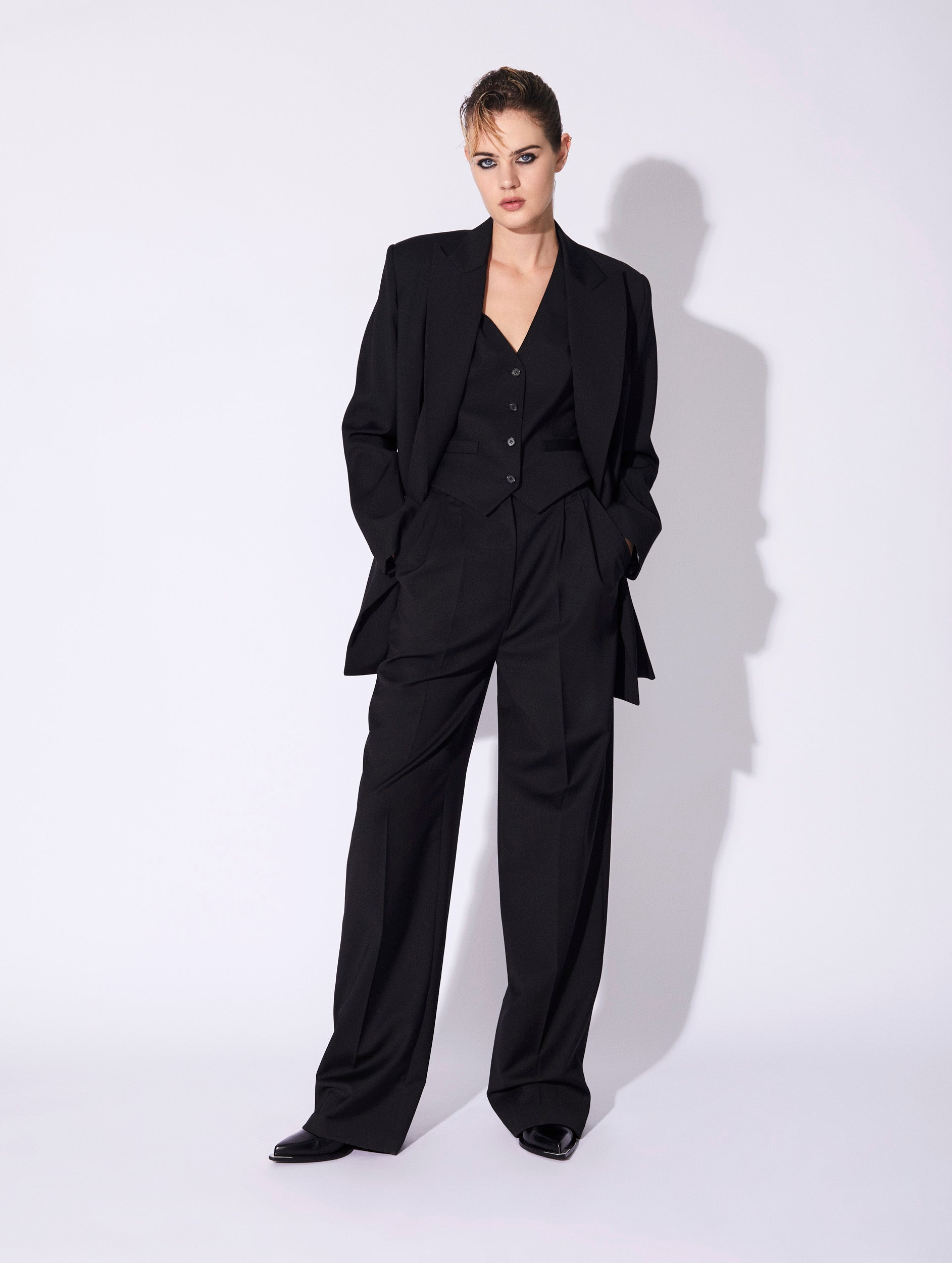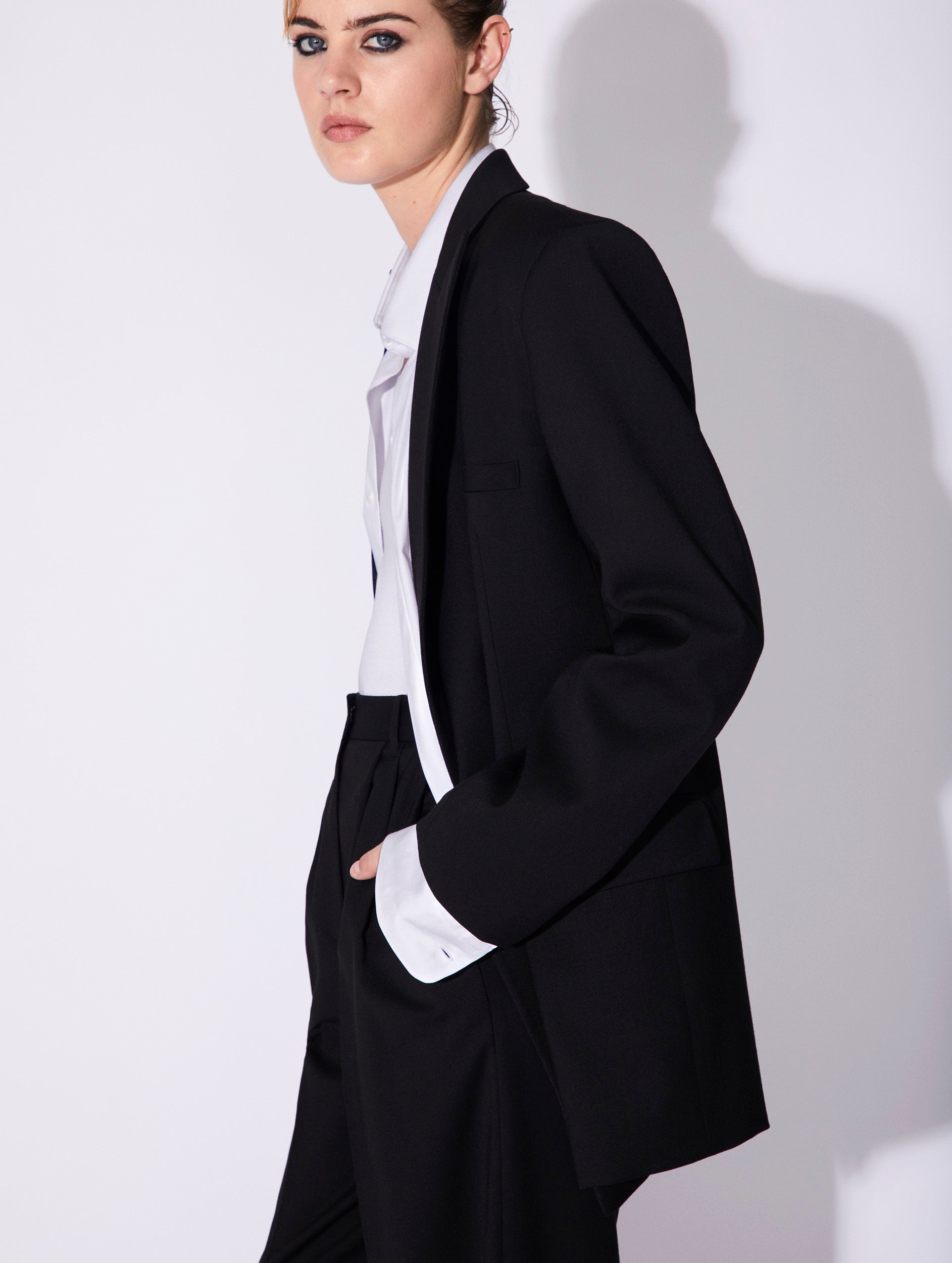 This double-breasted suit jacket features a loose comfortable fit and promises the iconic Barbara Bui style worn either in your normal size or oversized. The lapel collar enhances the sophisticated look of this tailored jacket with its concealed buttonhole and impeccable straight drape. Made in black stretch wool gabardine, this women’s jacket bears all the hallmarks of a luxury suit embellished by our signature detachable piercing detail. The striped sleeve lining, watch pocket, welt pockets and felt-lined collar are inspired by masculine tailoring. This slightly long jacket from the Barbara Bui Suits line will team well with trousers or shorts.