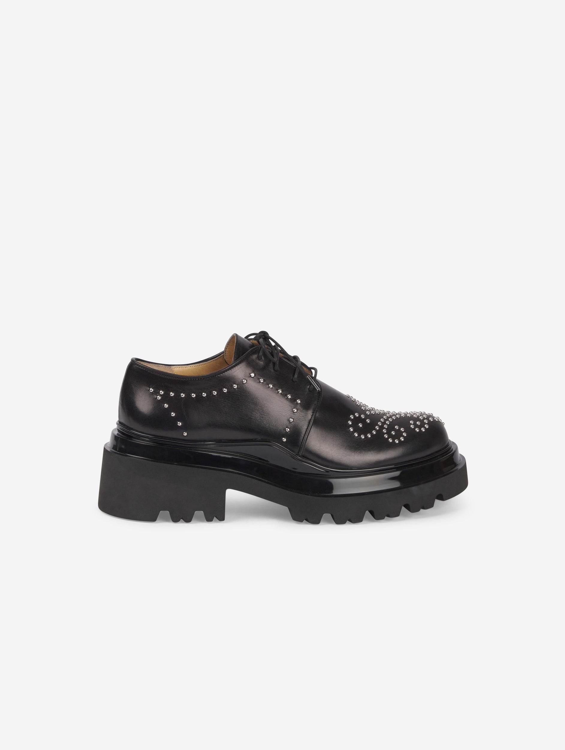 Black studded leather brogues. Chunky ultra-light notched double rubber sole with black lacquered finish on top section. Heel: 6 cm.