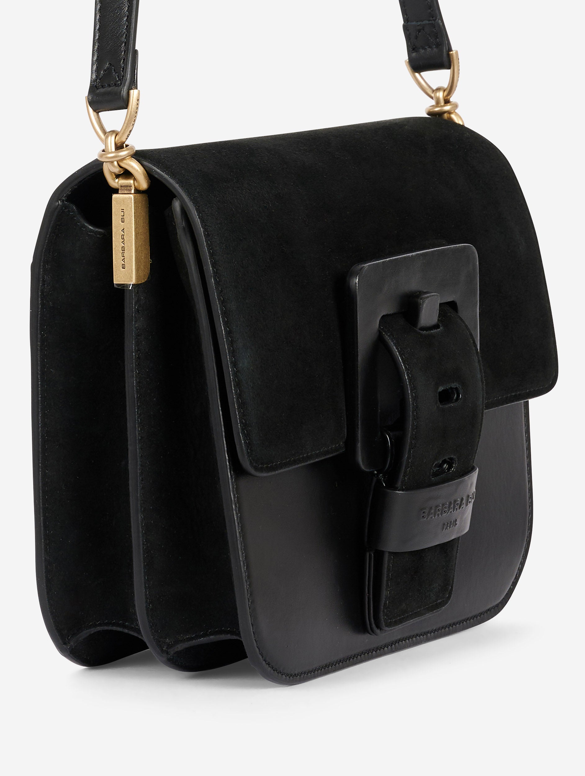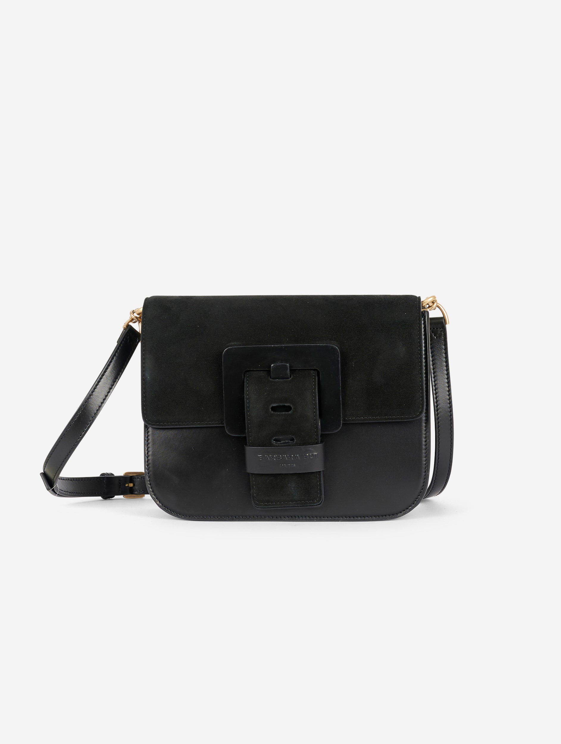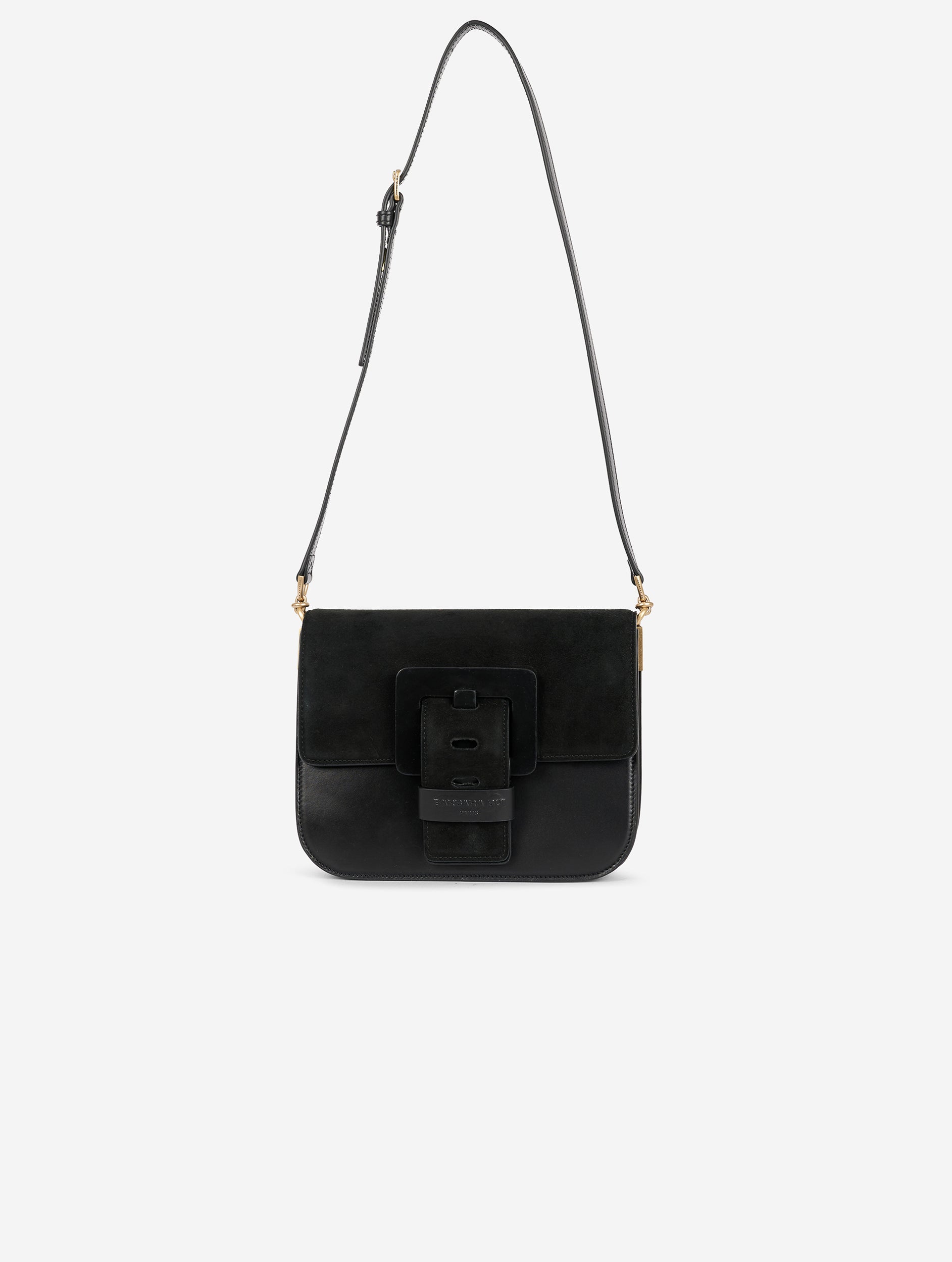 "TOUCH ME" two-material bag in black suede and leather. Magnetic closure flap with reinforced leather maxi buckle, signature of our “ME” bag line. Adjustable shoulder strap with removable strap and buckles for shoulder or cross-body carrying. Back and front pockets, double interior compartment with pockets.