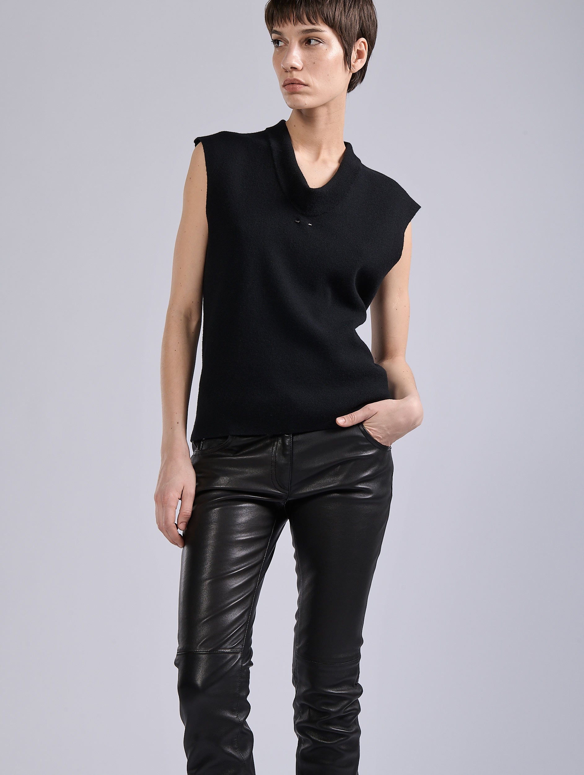 Knit in a luxurious wool and cashmere blend, this sleeveless sweater features a rounded collar that blends a round neck with a cowl neck. This detail highlights the posture while giving this timeless sweater a touch of originality. Offered in black or grey, this model is adorned with the iconic Barbara Bui silver metal piercing jewelry. For a trompe-l'oeil effect, wear this wool and cashmere sweater with the matching knit skirt and a leather belt.