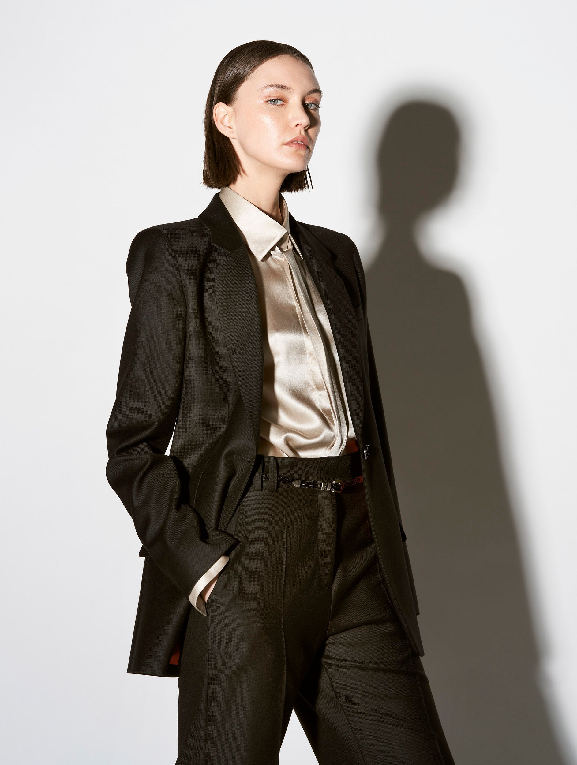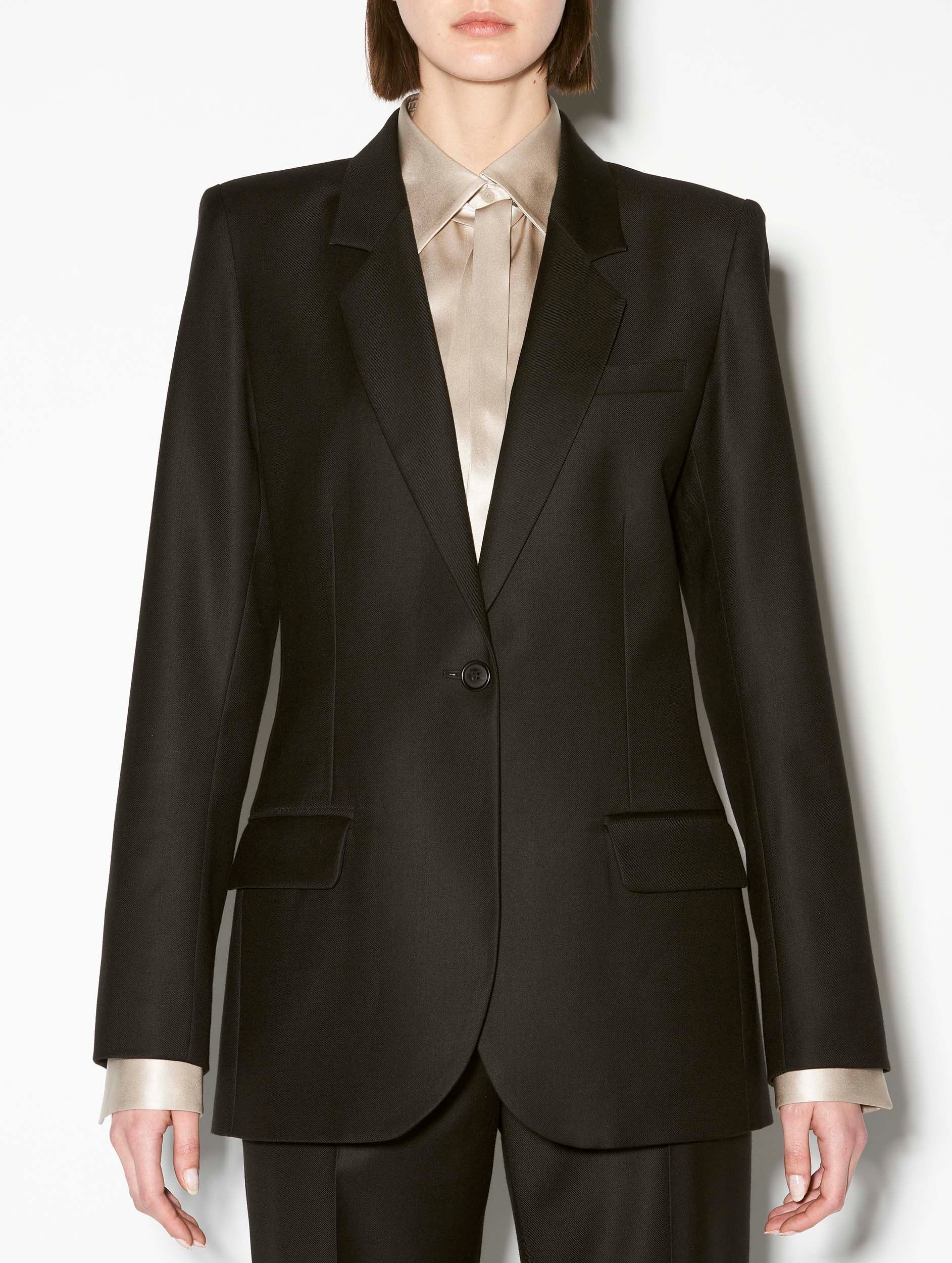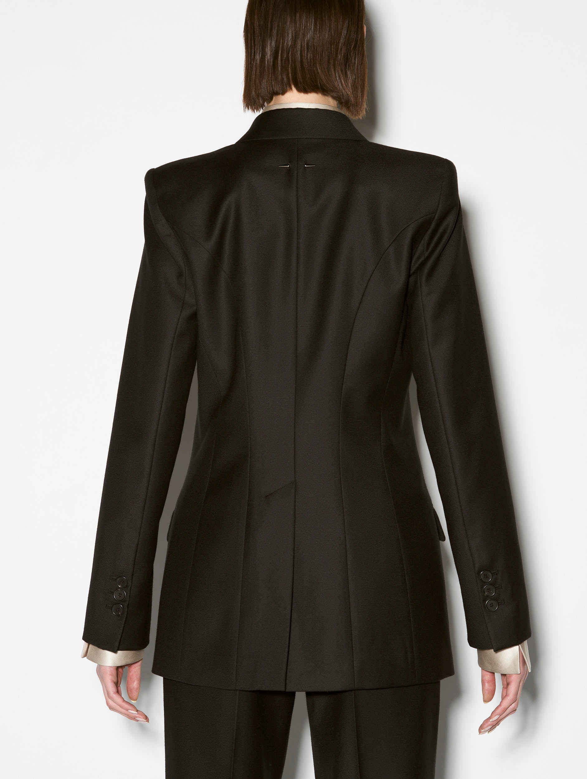 This women’s suit jacket showcases our workshops’ expertise and our designer’s love of menswear-inspired tailoring. This slightly fitted classic cut black jacket flatters feminine contours thanks to the elegant seams at the back while the rear vent ensures comfort and unrestricted movement. Featuring three welt pockets and buttoned cuffs, this tailored jacket in wool gabardine and cashmere reveals a stylish coral coloured lining with pink fluo piping. Our iconic detachable silver metal piercing detail at the back is a nod to the irreverent rock spirit dear to Barbara Bui.