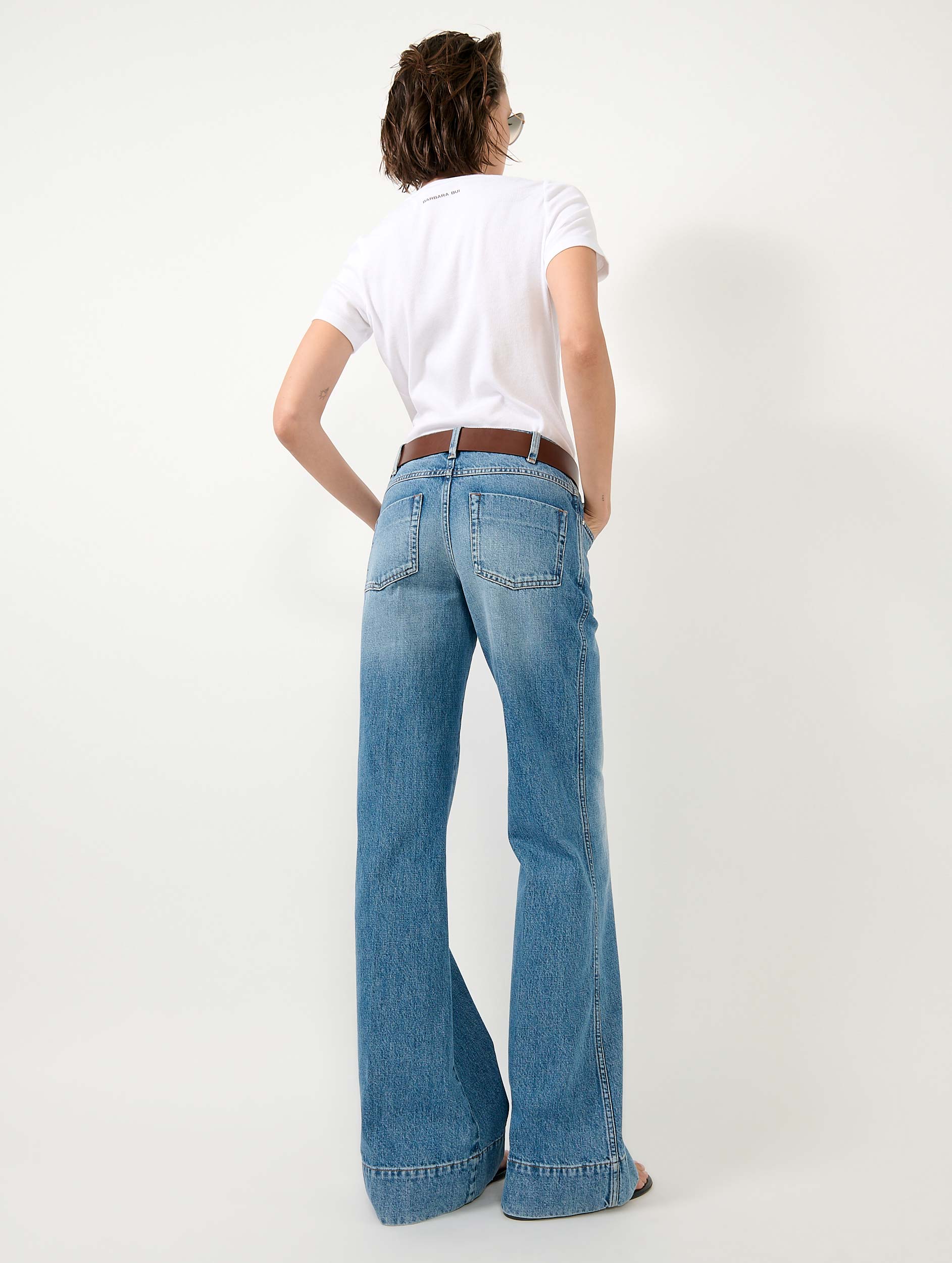 Instantly cool, flare jeans inspire a seventies note to an outfit that is both chic and relaxed. To highlight the elegance of these women's jeans with the perfect wash, a sewn crease runs along their dramatically flared leg. Worn with a simple white cotton T-shirt, a leather belt, and heeled sandals, these denim trousers accompany you in your daily life while flattering your silhouette. Their neat finishes, inspired by traditional signatures typical of denim, are all reworked with the elegance that characterizes the House's wardrobe, from the BB logo tab in fine gold-plated metal to the leather jacron with the Barbara Bui logo held by silver-tone metal rivets.