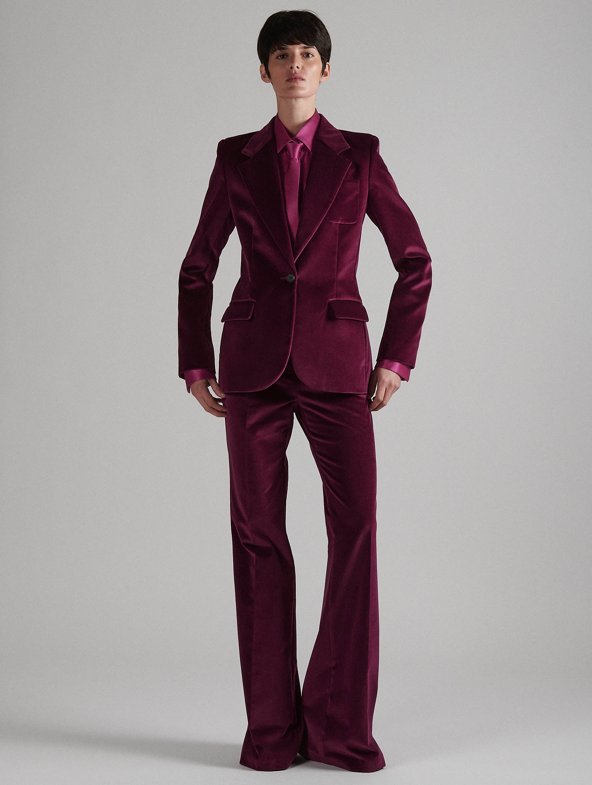 An icon in the Barbara Bui wardrobe, the bootleg-cut velvet pants are available in new shades this season: green, blue or pomegranate. Designed to be worn with a suit, they go well with a slim-fitting velvet jacket. These pants are fitted at the thigh and flare out at the leg, with cleverly placed seams and a flattering silhouette. They are made from a velvet that catches the light, creating a play of reflections and subtle contrasts that will look great paired with the brilliance of our silk satin lavallière shirt for a monochrome total look.