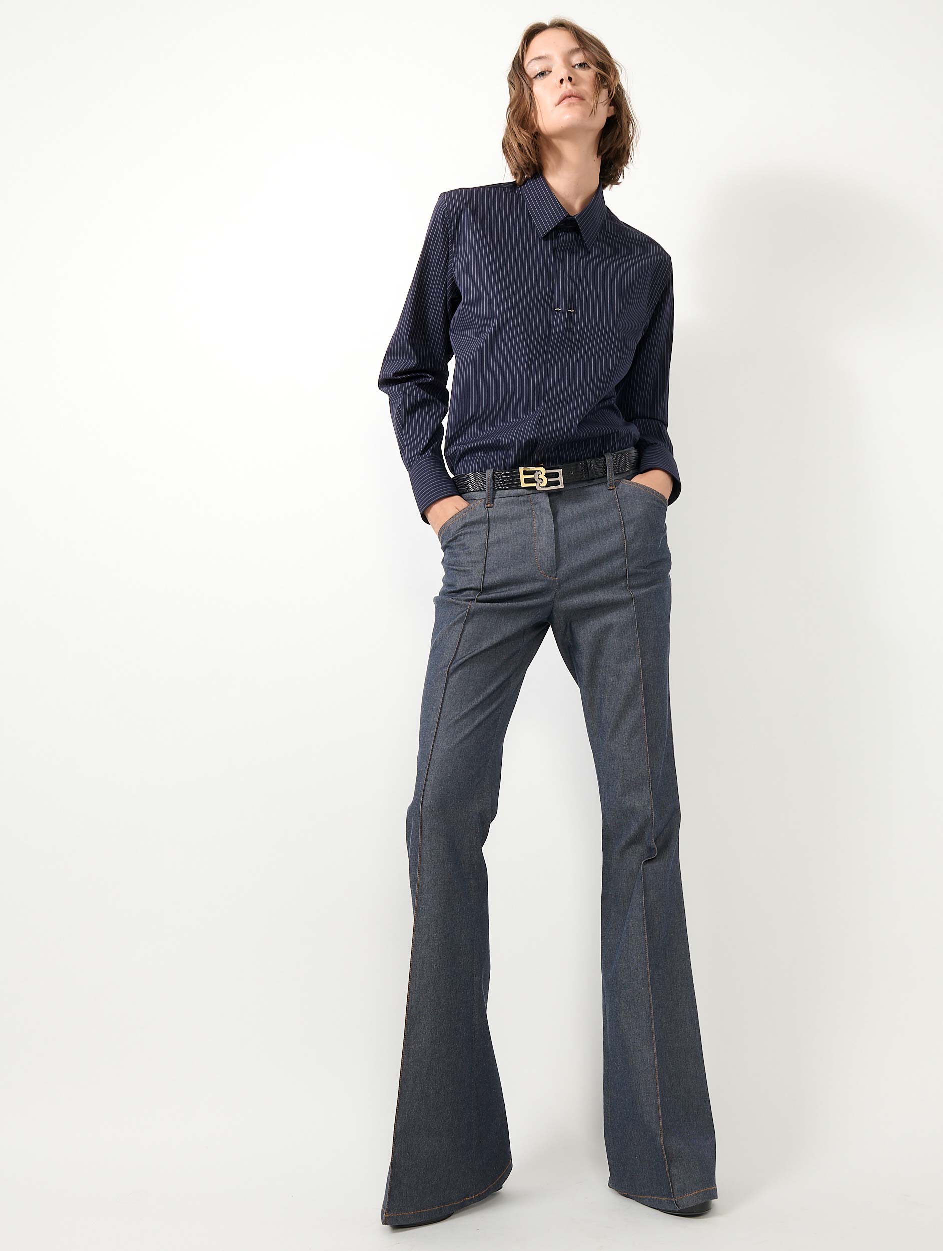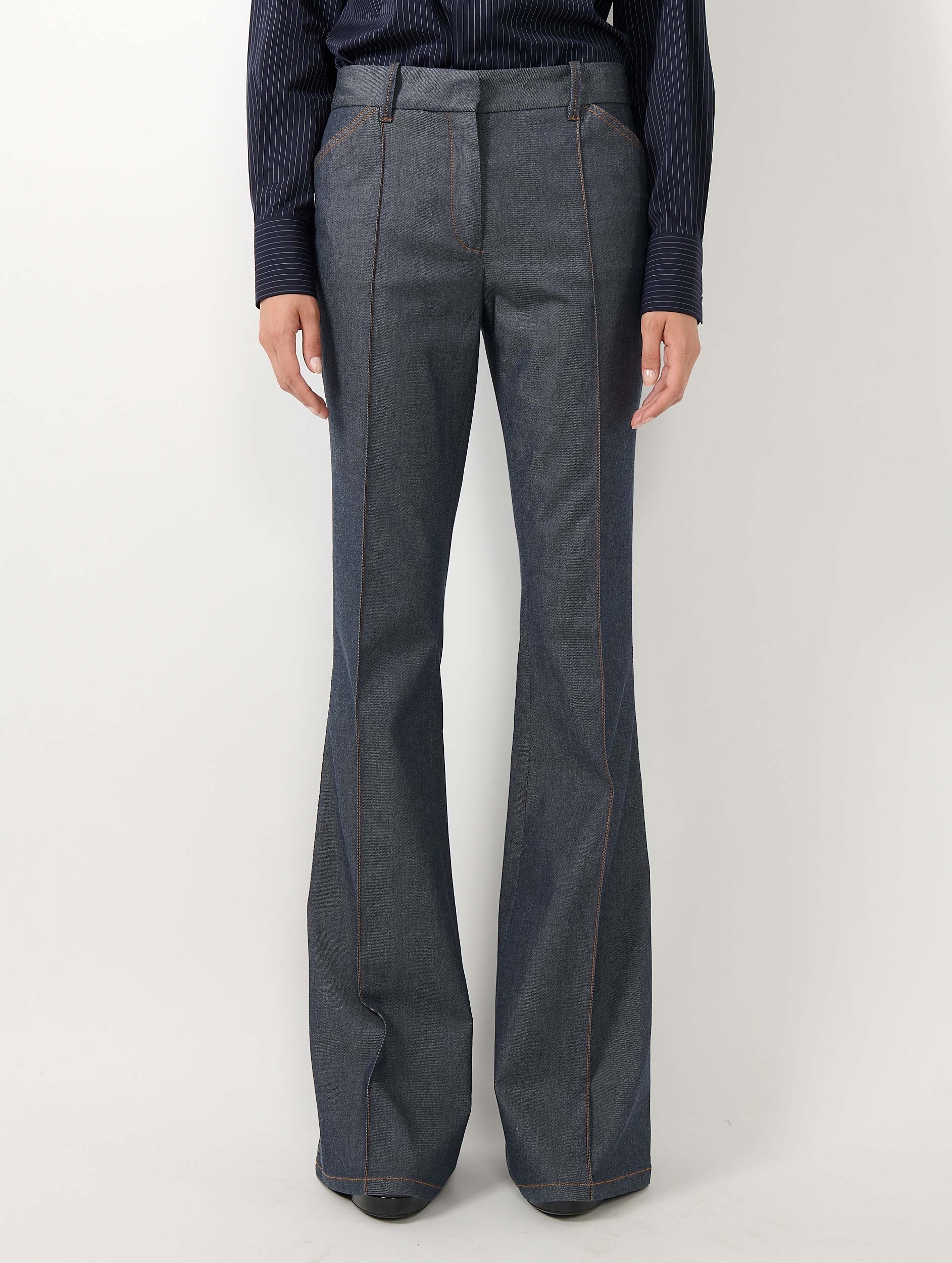 A perfect synthesis of denim and suit pants, this bootleg style revisits the codes of denim with the refinement of tailoring. The sewn-in pleat along the leg lifts the silhouette. Made from a washed denim fabric with tobacco-colored contrast stitching, it can be worn as a revisited three-piece suit or with a shirt layered over a light knit sweater. Italian pockets and piped back pockets ensure a flattering fit.