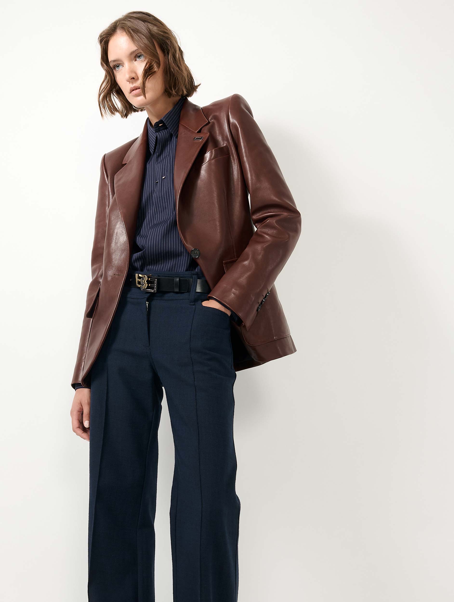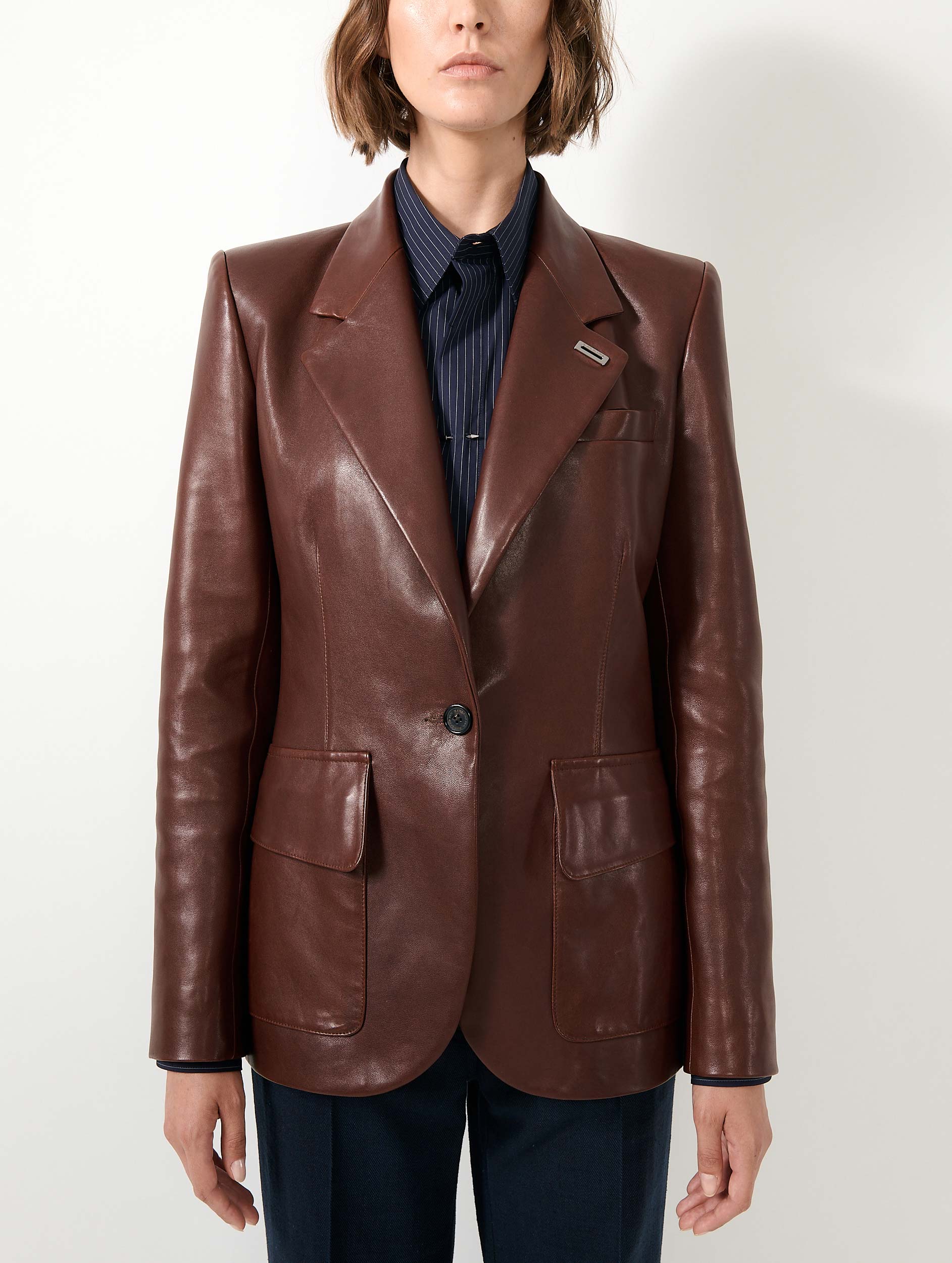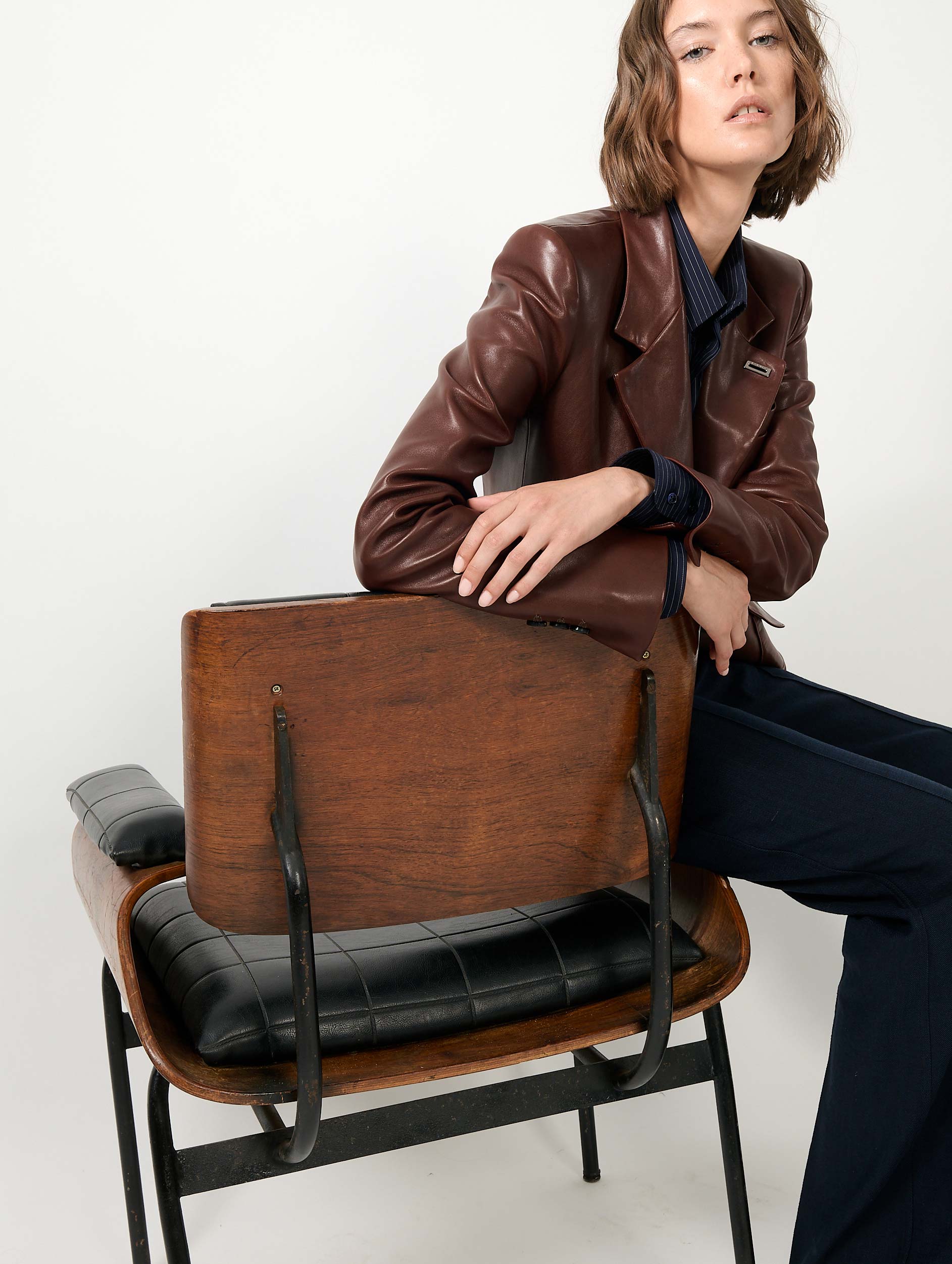 This leather blazer gives this noble material, so dear to Barbara Bui, the full respect it deserves within a sartorial wardrobe, from expertly positioned darts to the Milanese vent accented with a silver metal trim. The patch pockets feature reworked flaps with a subtle asymmetry, asserting a discreet yet noticeable presence. In its brown hue, this leather blazer with clean lines offers the sharp, signature style of the House.