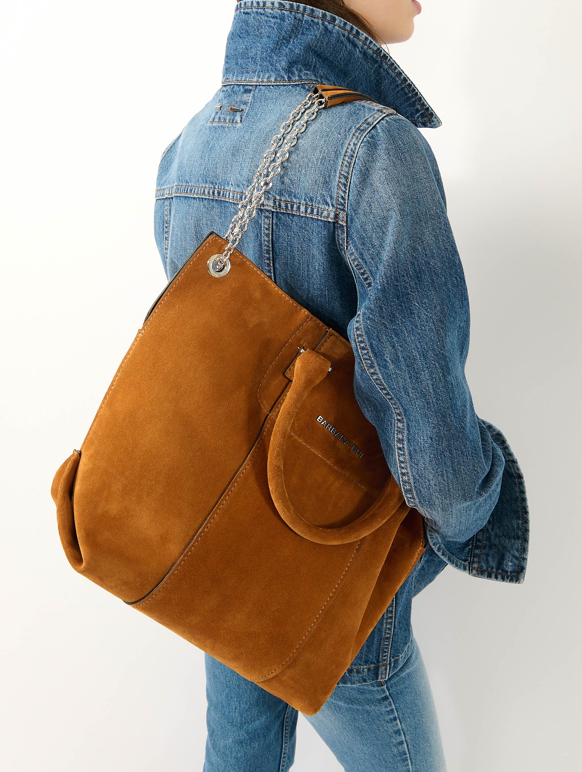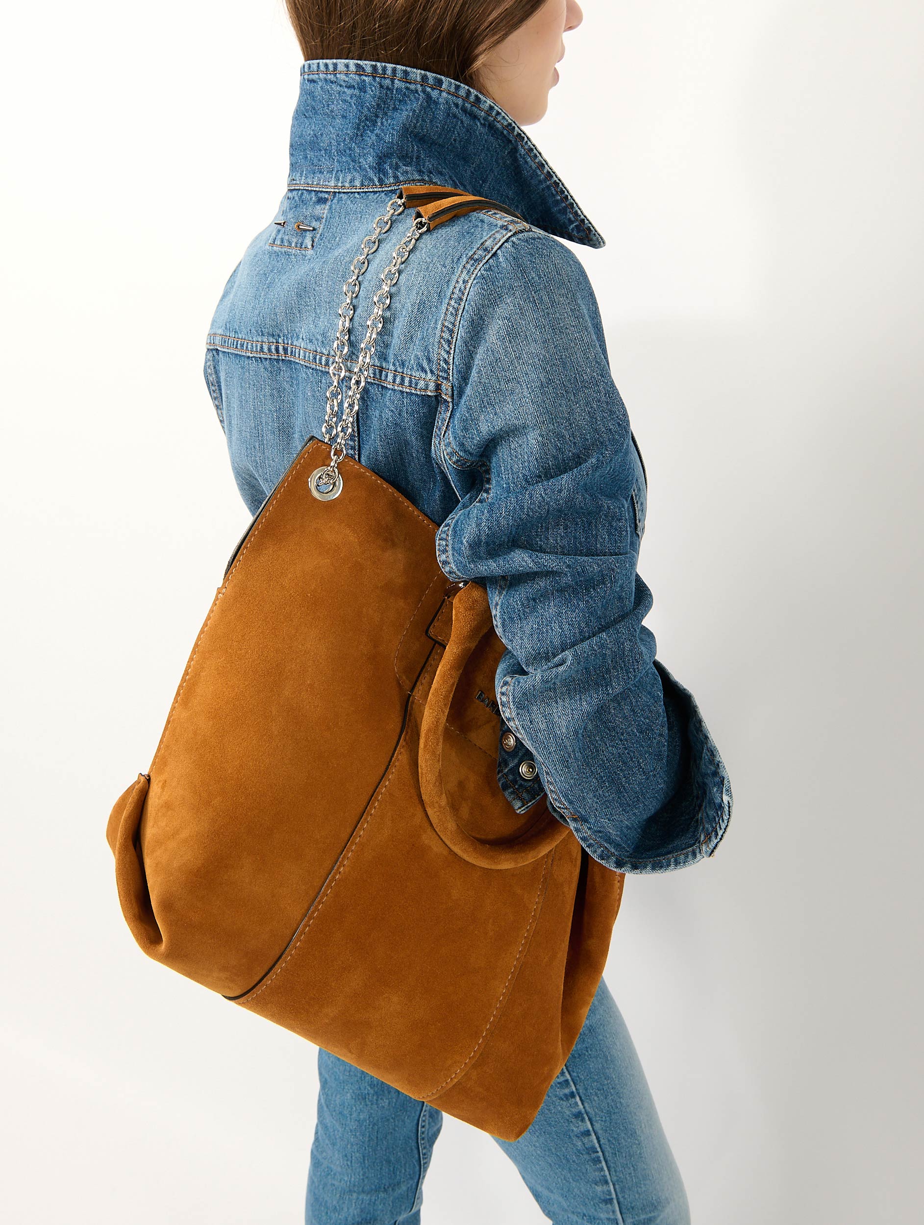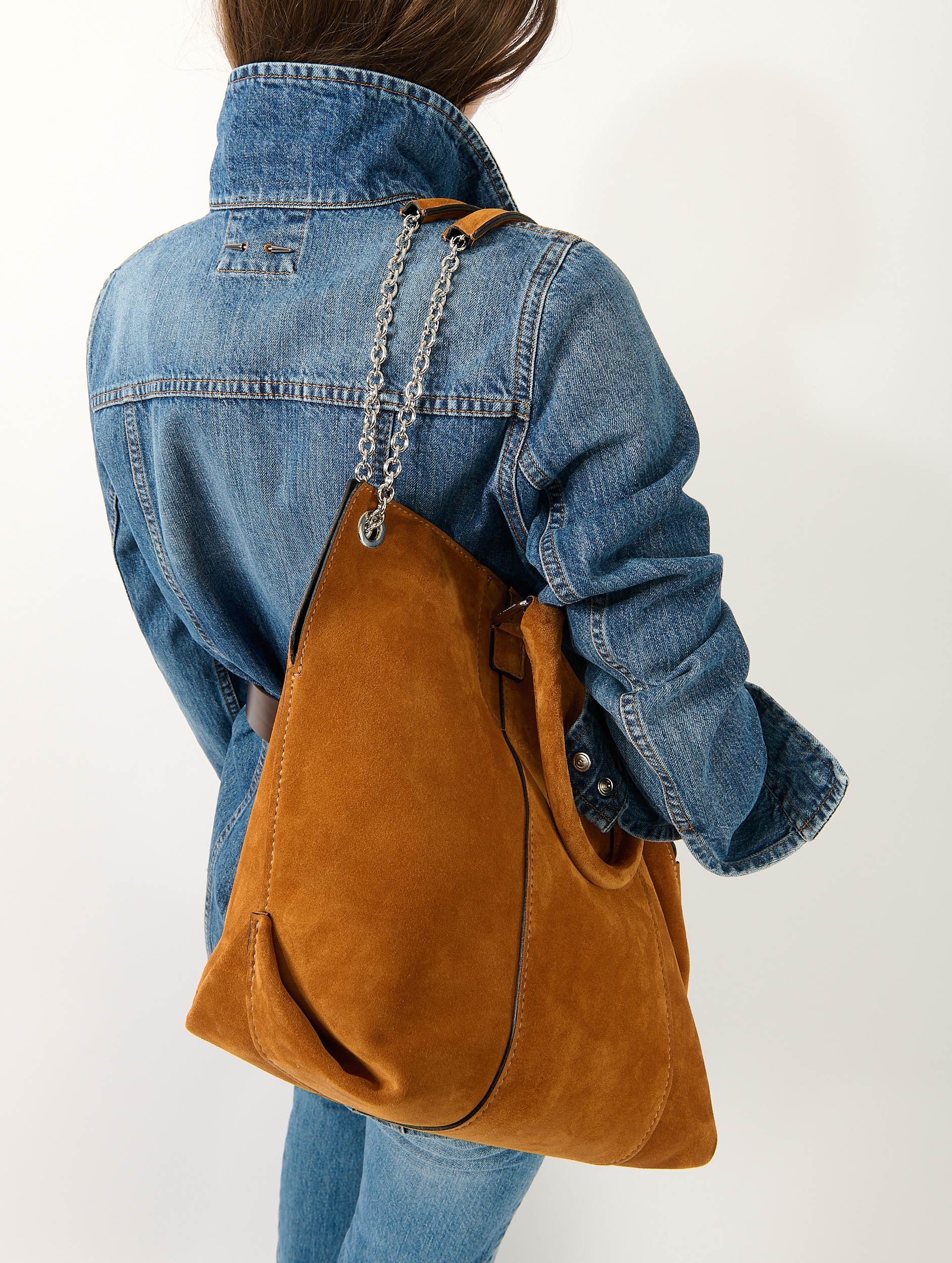 "Chamallow" tote bag in mustard suede calfskin bonded to its reversible lining. Articulated handles for carrying by hand and a sliding chain shoulder strap allowing it to be worn over the shoulder, either as a short double chain or a long single chain. Interior slip pocket and magnetic closure.