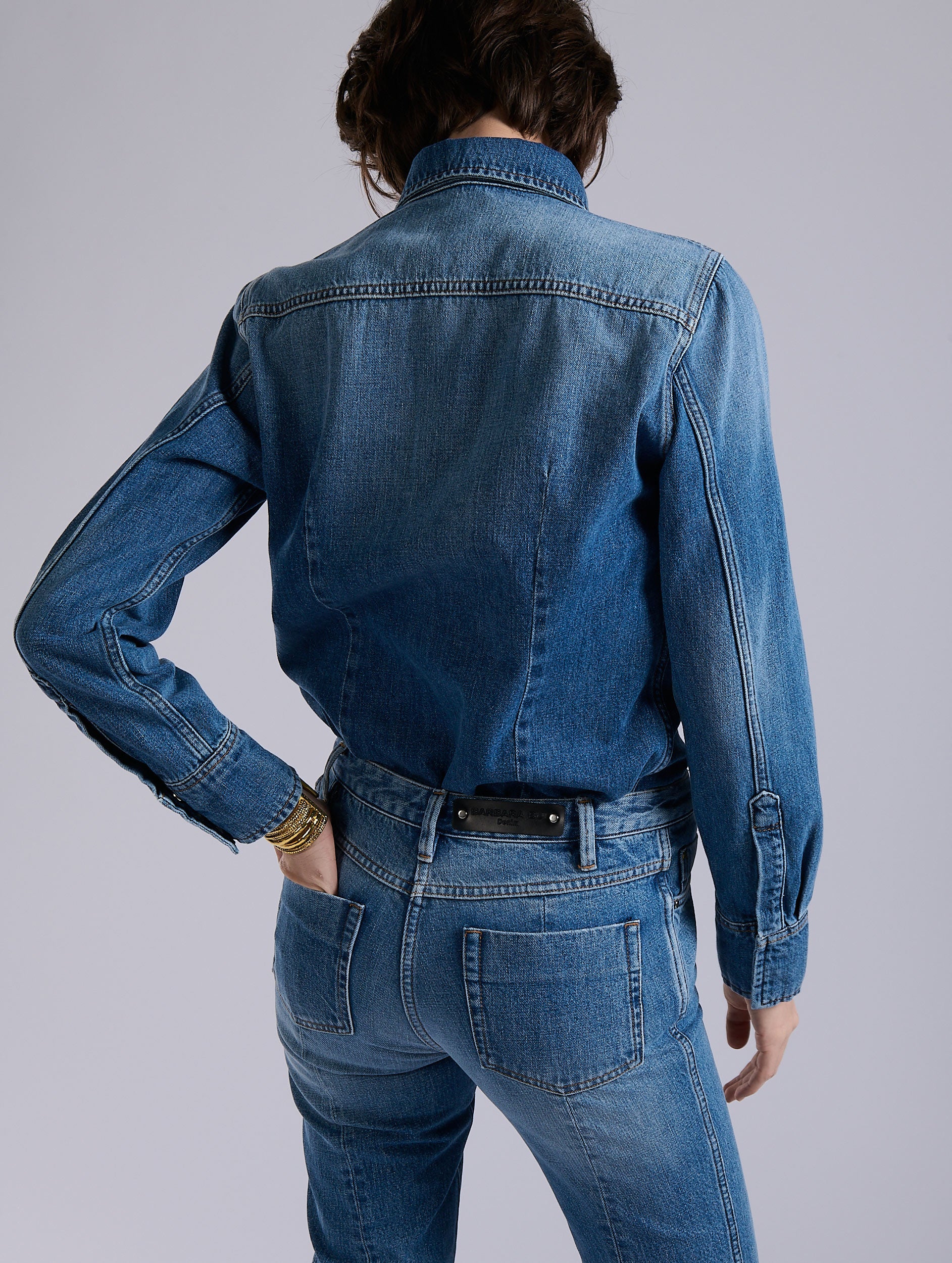 Denim is a fabric dear to Barbara Bui. Crafted from denim with a wash identical to that of our bootleg jeans, this slightly fitted denim shirt can be paired with them for a trompe-l'œil effect reminiscent of a jumpsuit. The attention to its cut and finishes draws from the tailoring expertise of the house, while retaining the tobacco-colored topstitching emblematic of workwear wardrobes and featuring the iconic Barbara Bui piercing jewel on the front. With its hidden button placket, pleat detailing, and two patch pockets, this shirt ushers denim into a new era.