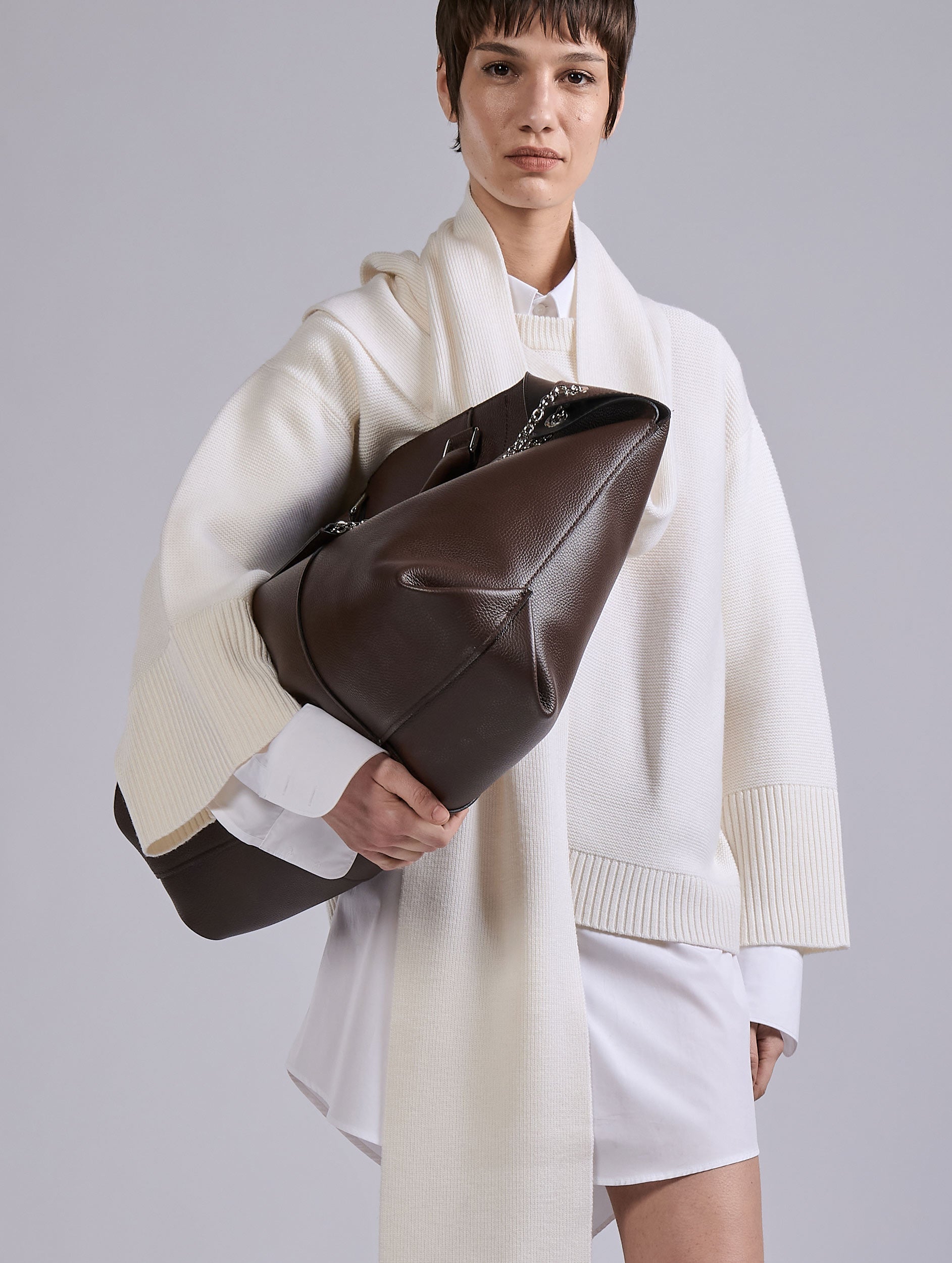 Crafted in soft, flowing merino wool in a garter stitch knit, this straight round-neck sweater stands out for its minimalist elegance and playful detail: a removable scarf held in place at the back by its silver metal piercing jewel. The collar, cuffs and waist are knitted in ribbed knit for a perfectly structured look. Available in deep black, luminous ivory or midnight blue, this scarf sweater with elegantly flared sleeves combines comfort and refinement, adding the coolest look to any winter silhouette.