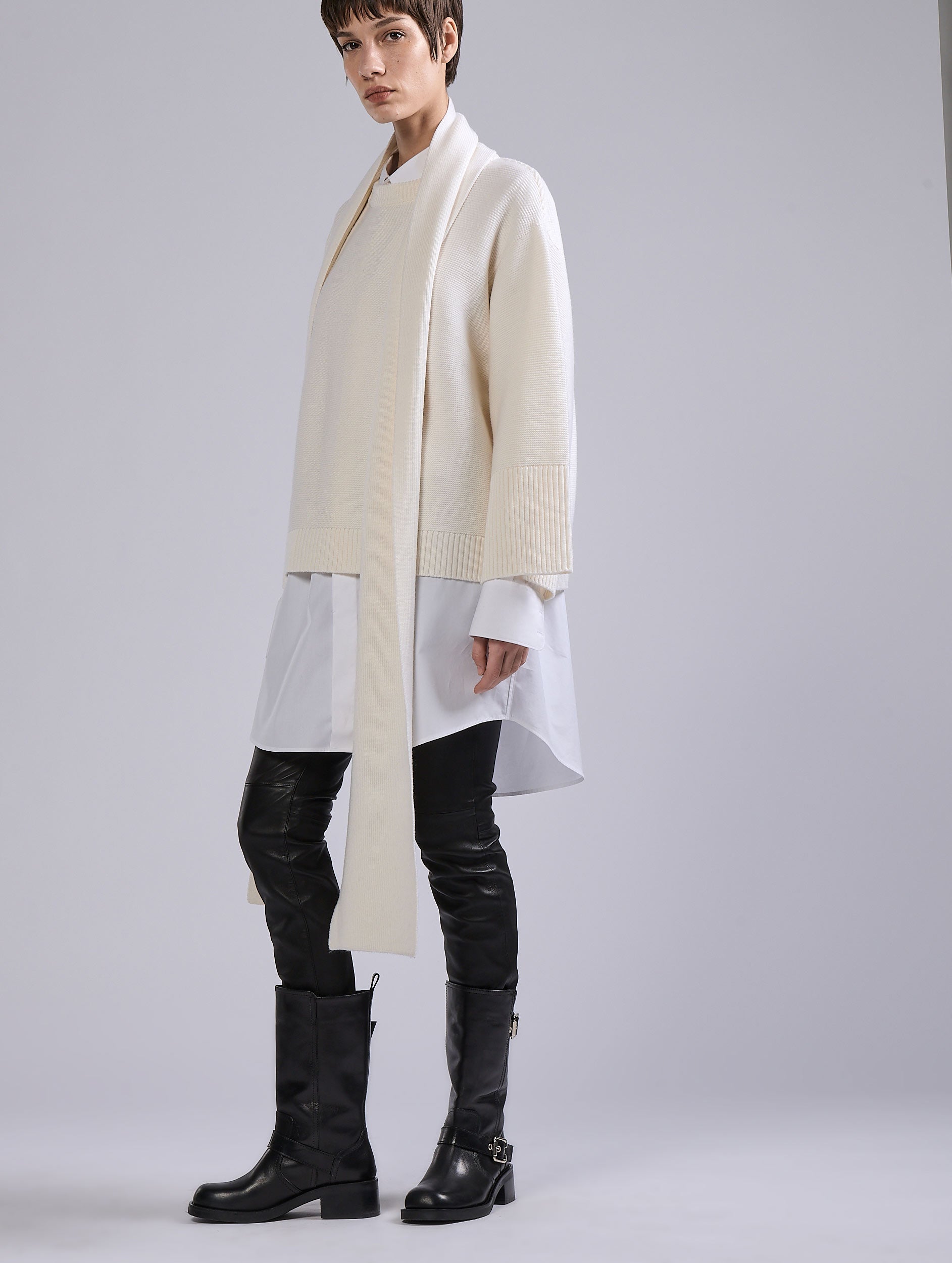 Ecru merino wool integrated scarf sweater
