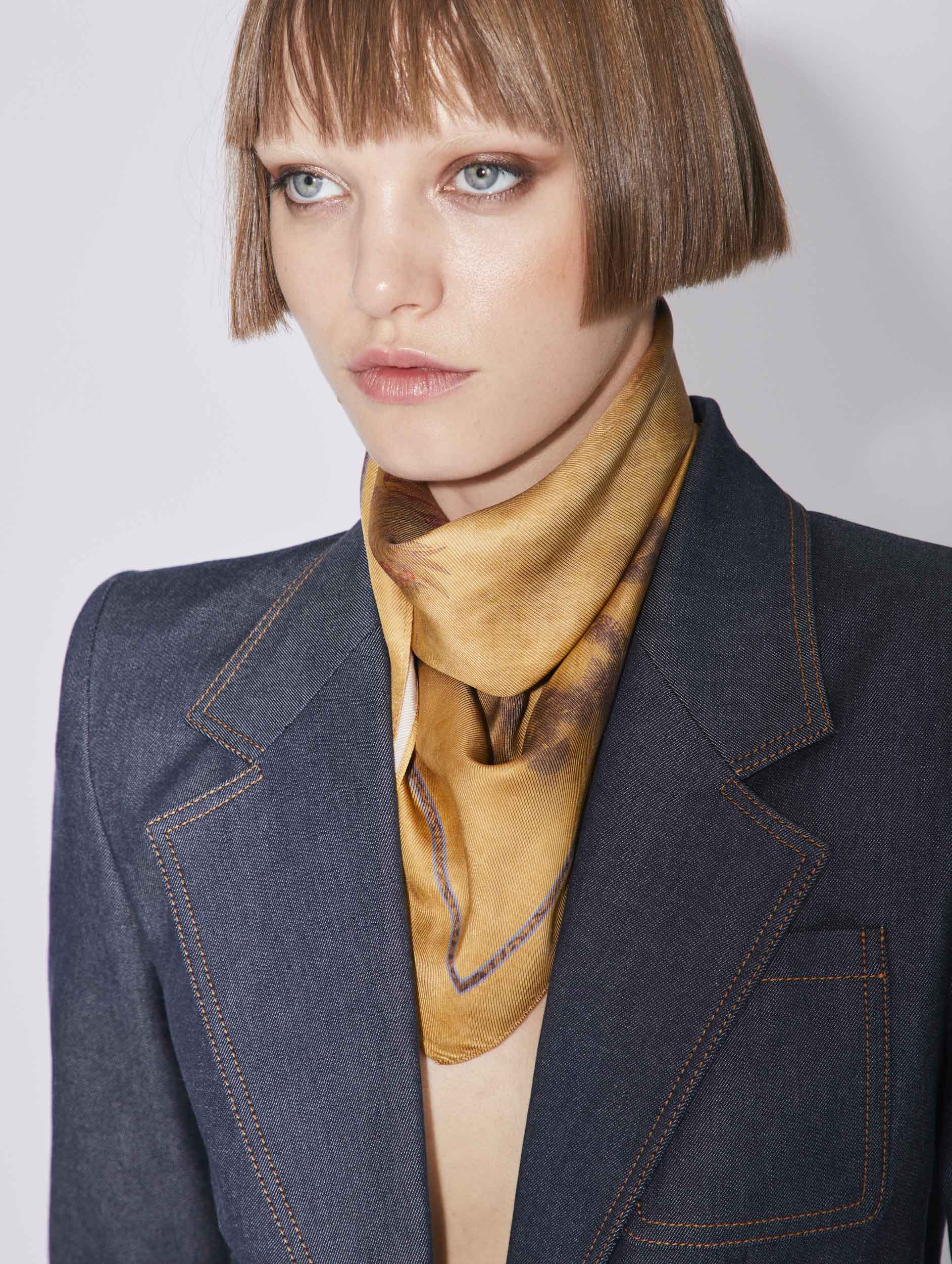 The bronze tints of this silk scarf will warm up any outfit while the exclusive abstract motif brings a discreetly elegant note to all your looks. Soft to the touch and lightweight, this silk square can be worn knotted around the neck or in your hair. It can be used to accessorise a handbag, delicately knotted around the leather handle.