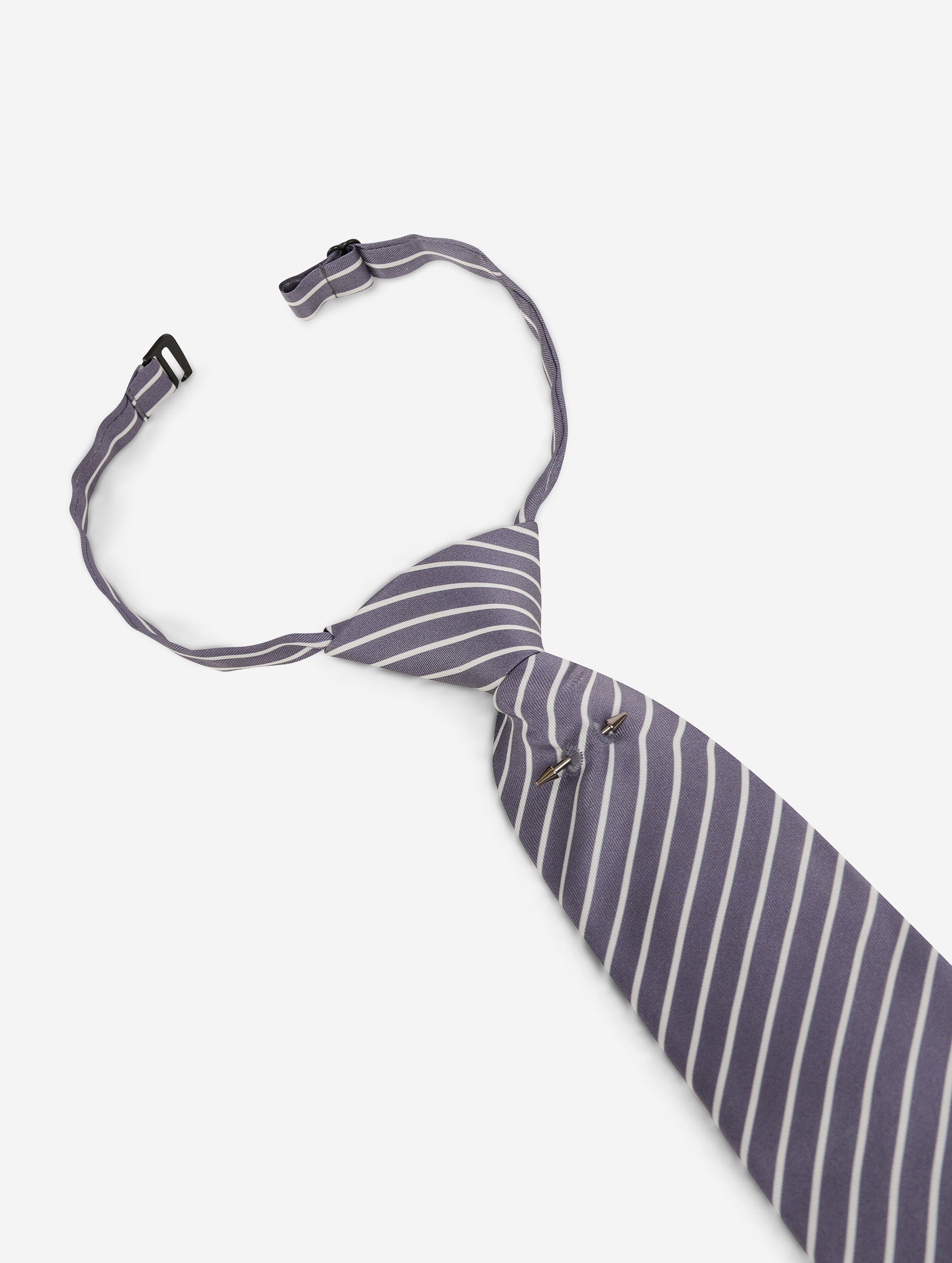 Adept at mixing genres for a feminized boyish look, Barbara Bui borrows from the tailor's wardrobe its iconic accessory: the tie. Mounted on a collar attachment and pre-tied for a perfect fall, this grey and white silk twill tie can easily be added to the matching shirt for a contemporary and refined business look. An emblematic detail, it is adorned with our silver metal piercing jewelry, a removable piece that adds a rock touch to this striped tie.