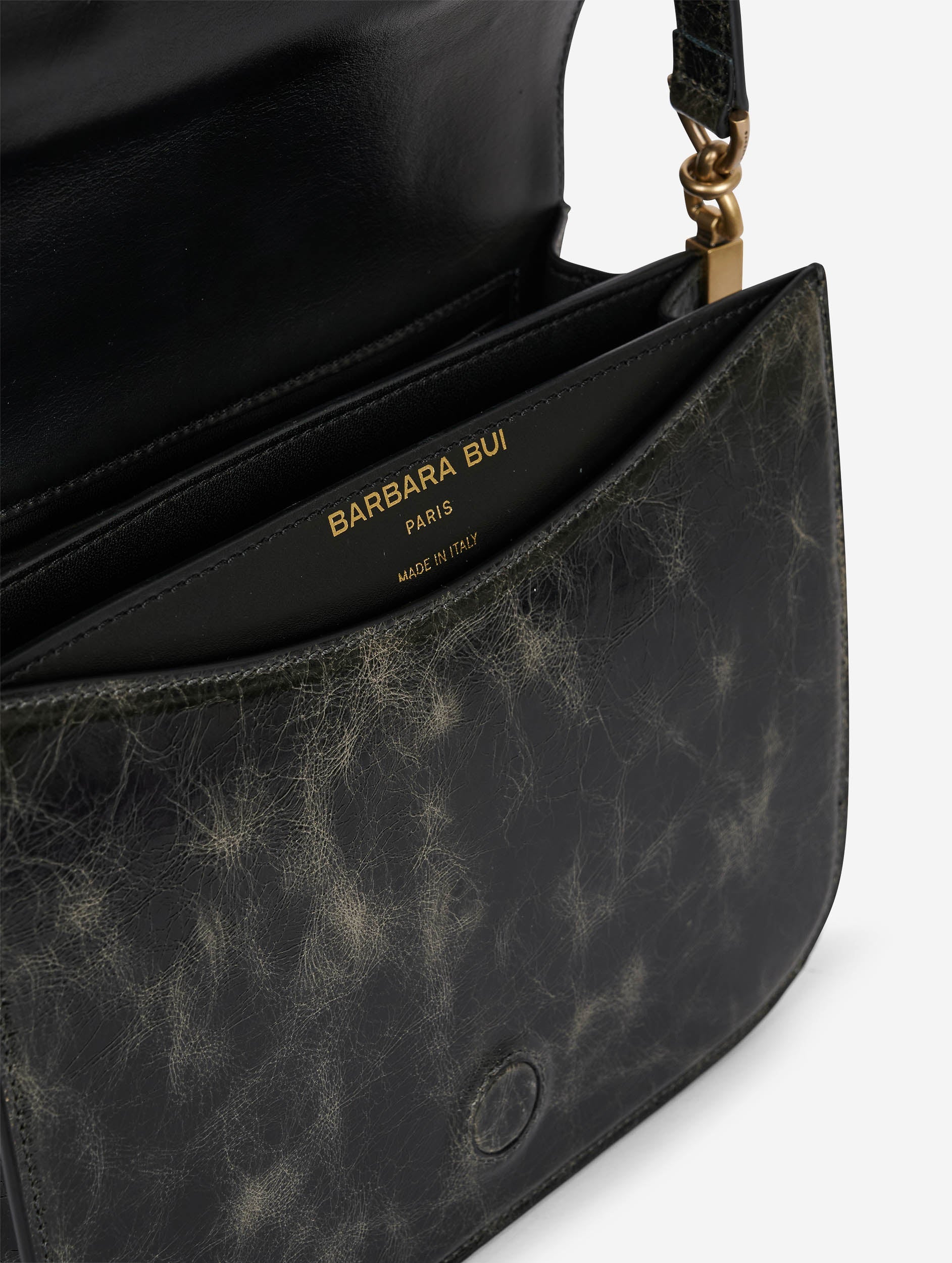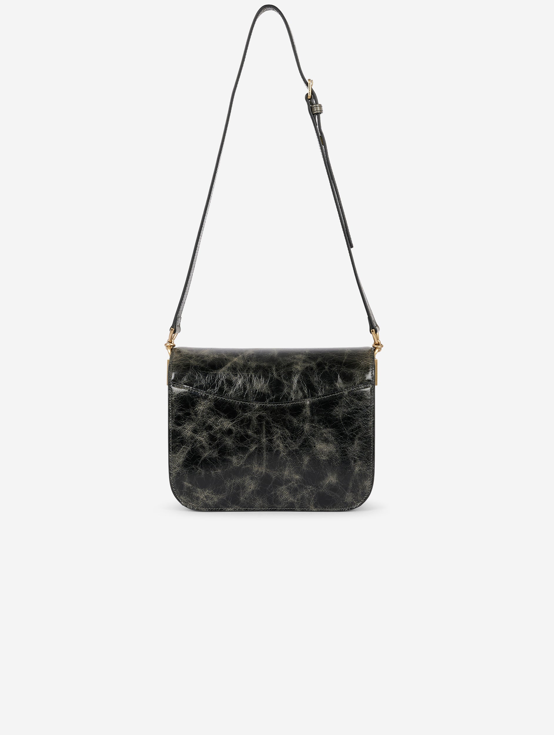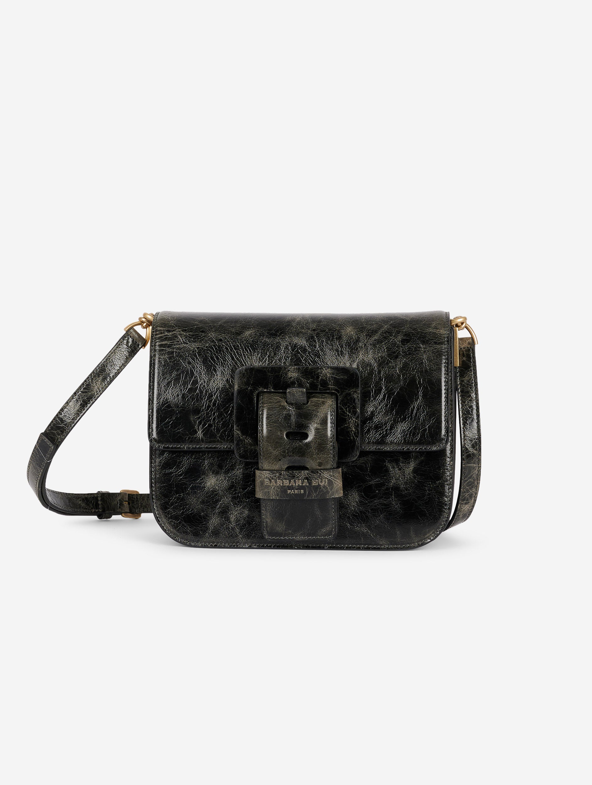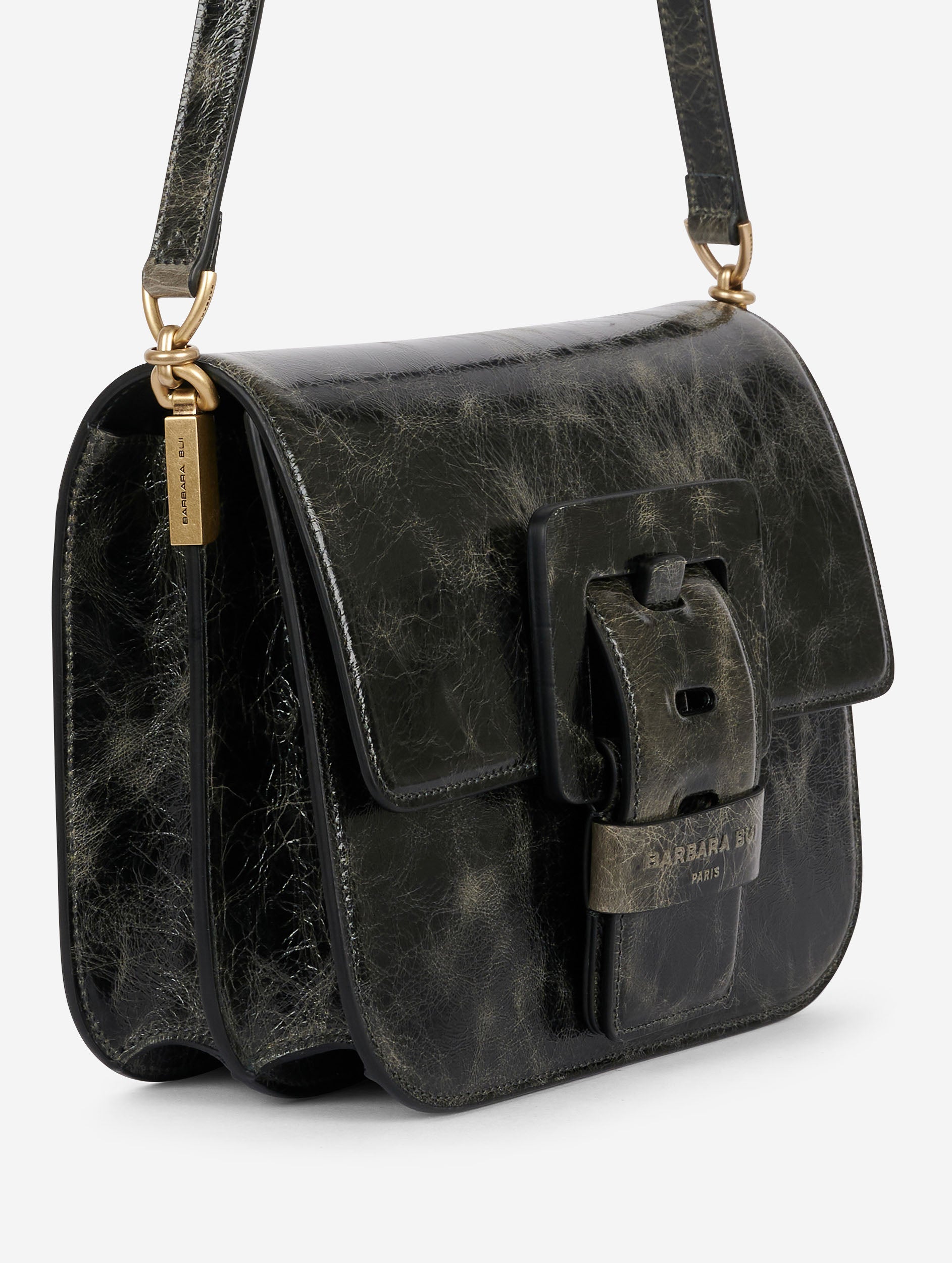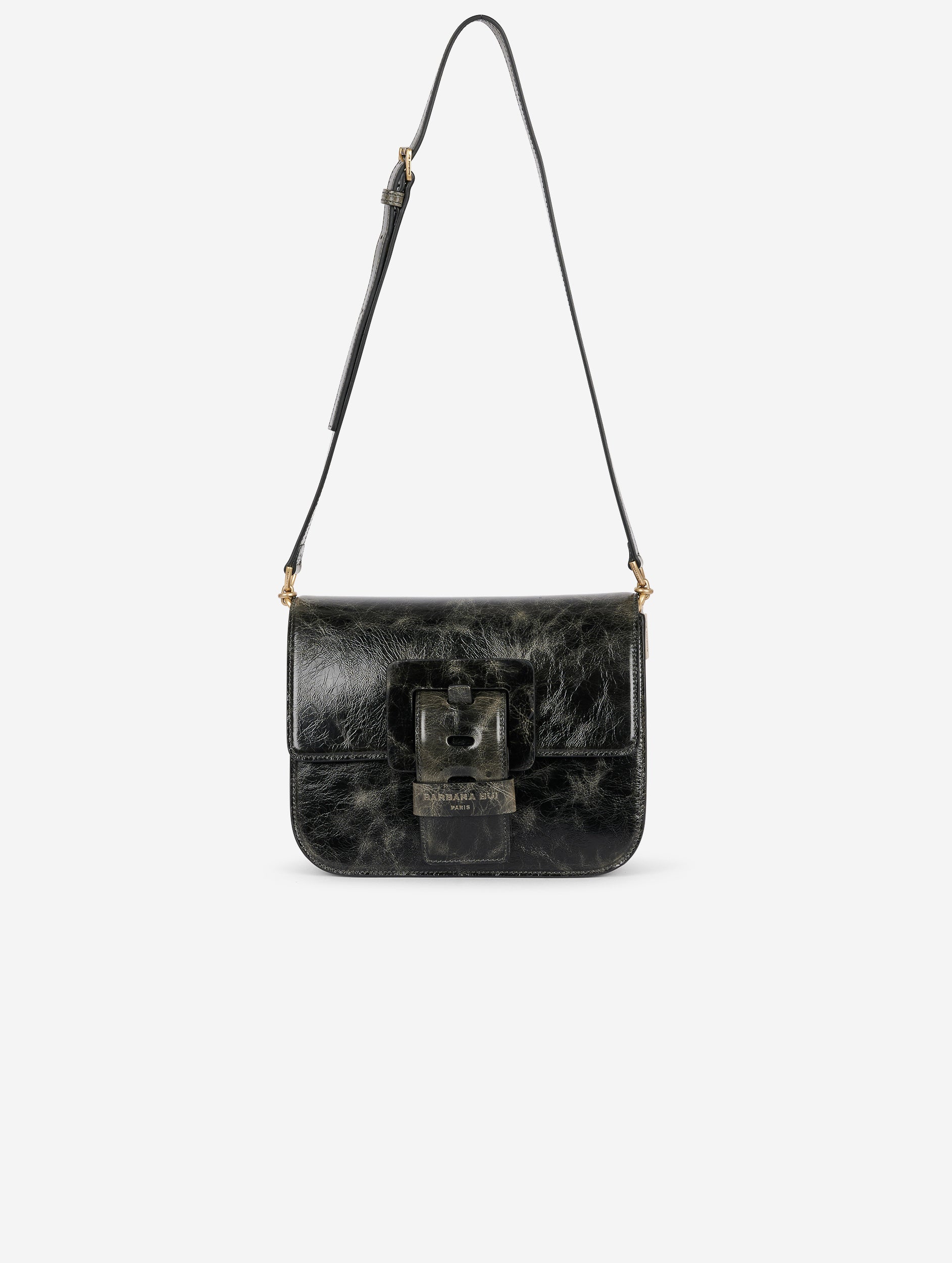 "TOUCH ME" bag in vintage grey patent leather, marbled and creased. Magnetic closure flap with reinforced leather maxi buckle, signature of our “ME” bag line. Adjustable shoulder strap with removable strap and buckles for shoulder or cross-body carrying. Back and front pockets, double interior compartment with pockets.