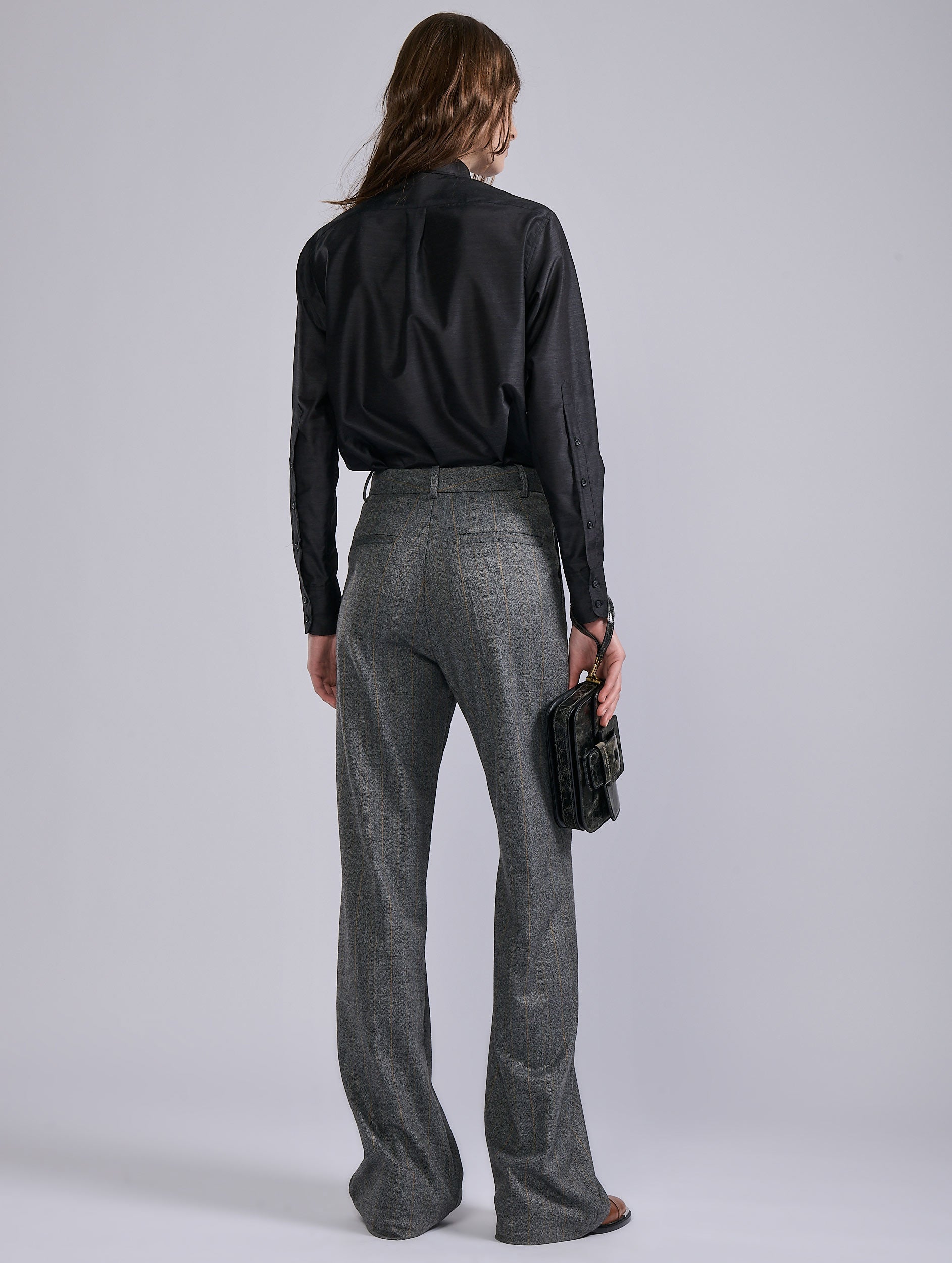 This high-waisted, wide-leg pant borrows its sartorial elegance from masculine models. Made from a grey fabric with ochre stripes that subtly elongate the leg, this pant for women boasts impeccable finishes and drape, with a duo of double belt loops for a touch of whimsy. Black and grey pair wonderfully with it, but Barbara Bui also likes to pair it with our camel leather biker jacket, a subtle nod to its stripe pattern, creating a silhouette that blends tailoring expertise and casual authenticity.