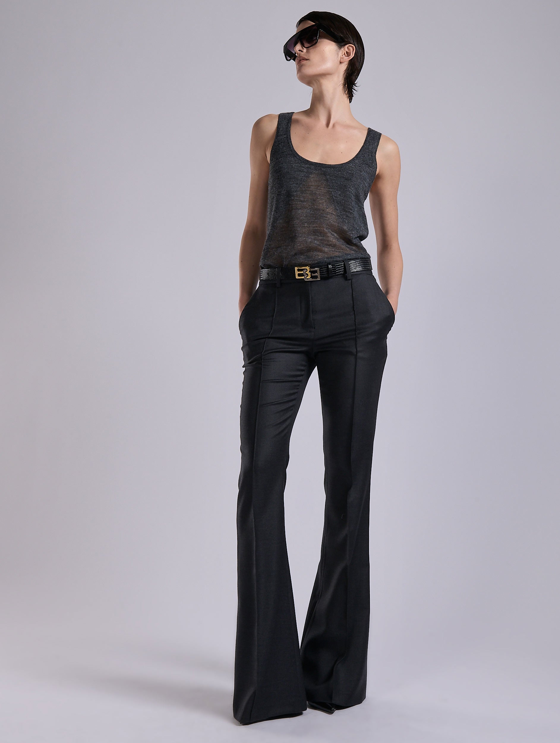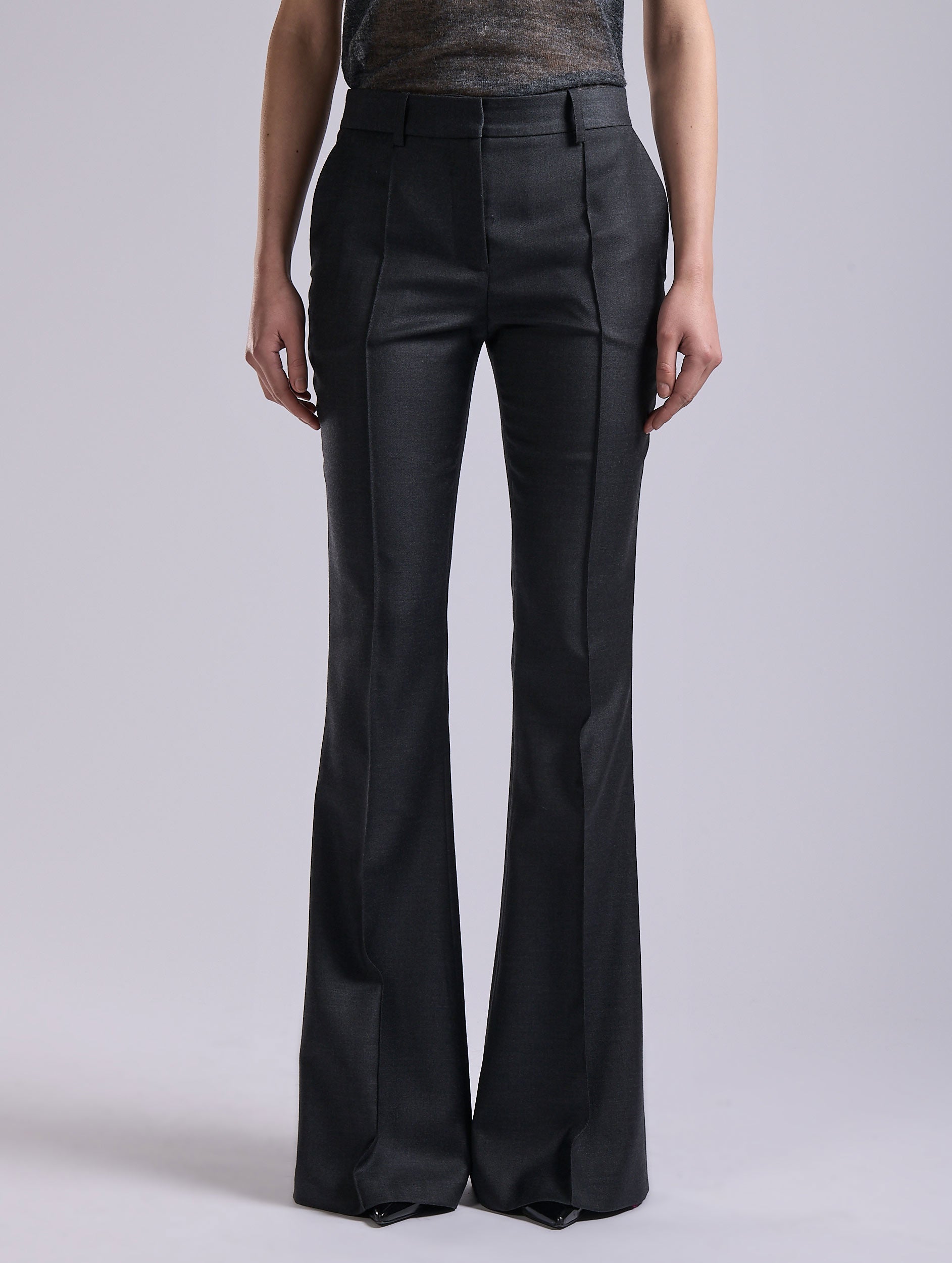 These bootleg trousers show a sculptural cut in a wool and cashmere twill blend that is soft and elegant to the touch. Offered in navy or grey, this women’s suit pant defines a sharp and contemporary silhouette. It pairs with the matching jacket with zippered sleeves for a total sartorial look inspired by the men’s wardrobe. A stitched pleat running down the leg, flared cut, and flawless finishes: every detail contributes to the sophisticated simplicity of this tailored pant.