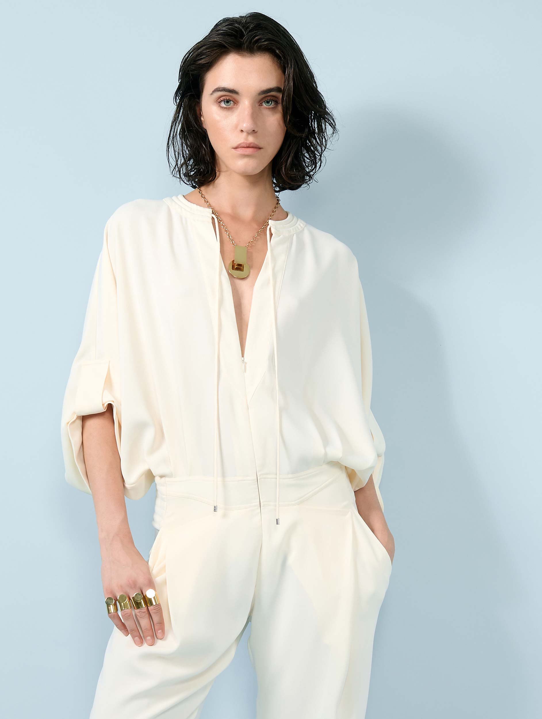 Inspired by our pleated trousers and matching zip-up jacket, this jumpsuit combines these two on-trend pieces into one. Made from fluid crêpe in ivory, navy blue or black, this smart jumpsuit has sleeves cleverly rolled up with tabs, a round collar with biker quilting that deepens into a zipped Tunisian neckline, and drawstrings. The cinched waist enhances the silhouette, while the fluid trousers offer comfort and movement without sacrificing elegance.