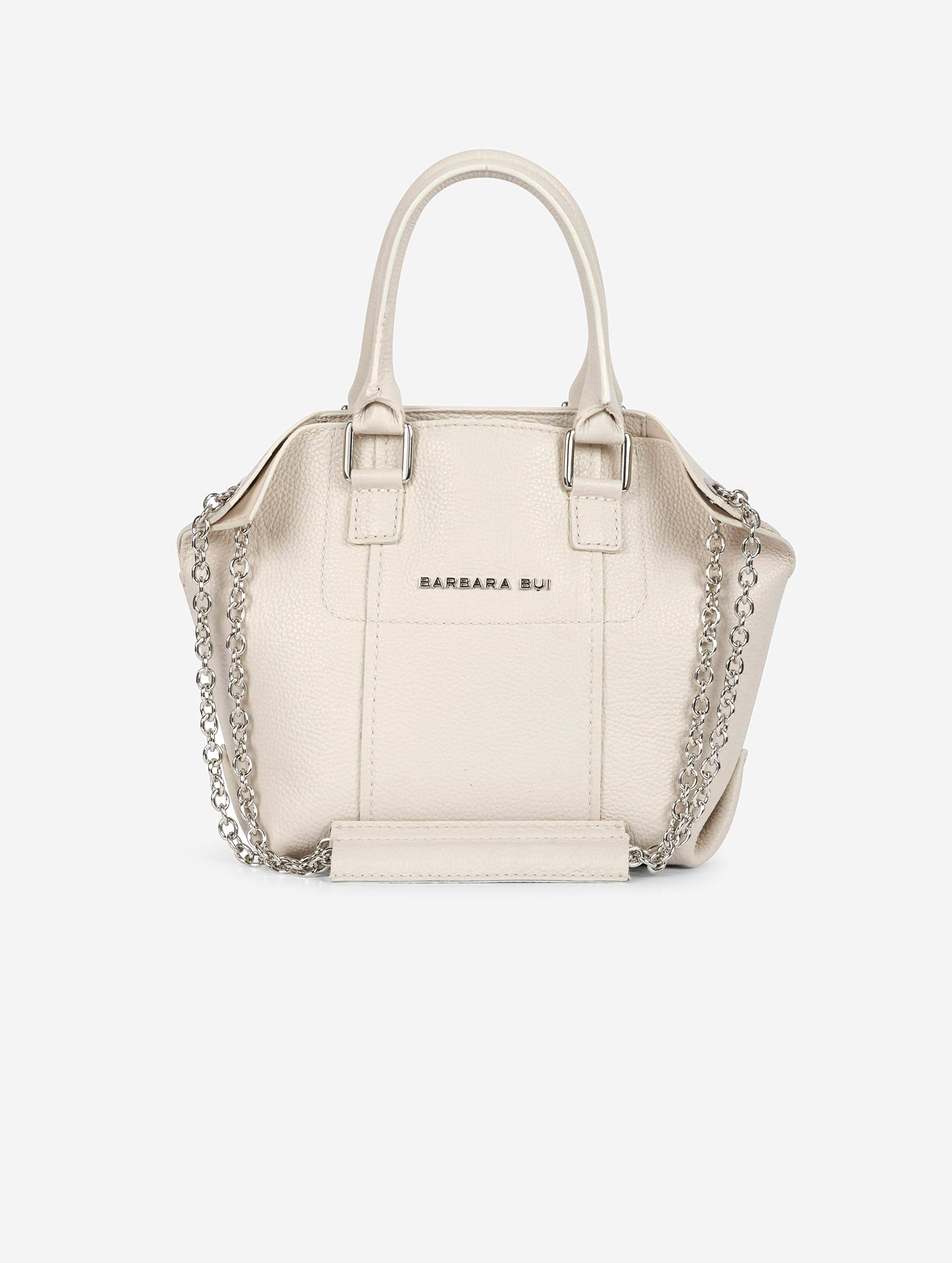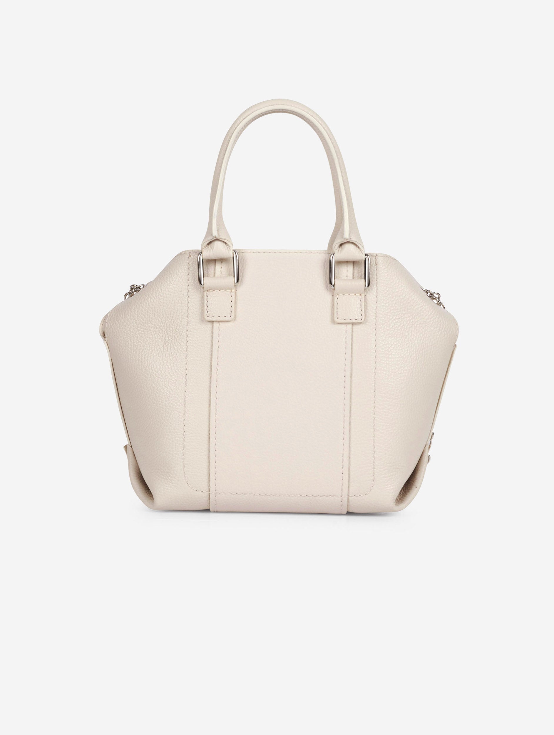 "Little CHAMALLOW" tote bag in ivory grained leather, double-sided effect laminated lining. Articulated carry handles. Sliding chain shoulder strap for either short double-chain or long single-chain shoulder carrying. Inside patch pocket and magnetic closure. Height: 24cm - Width: 33cm - Depth: 12cm.