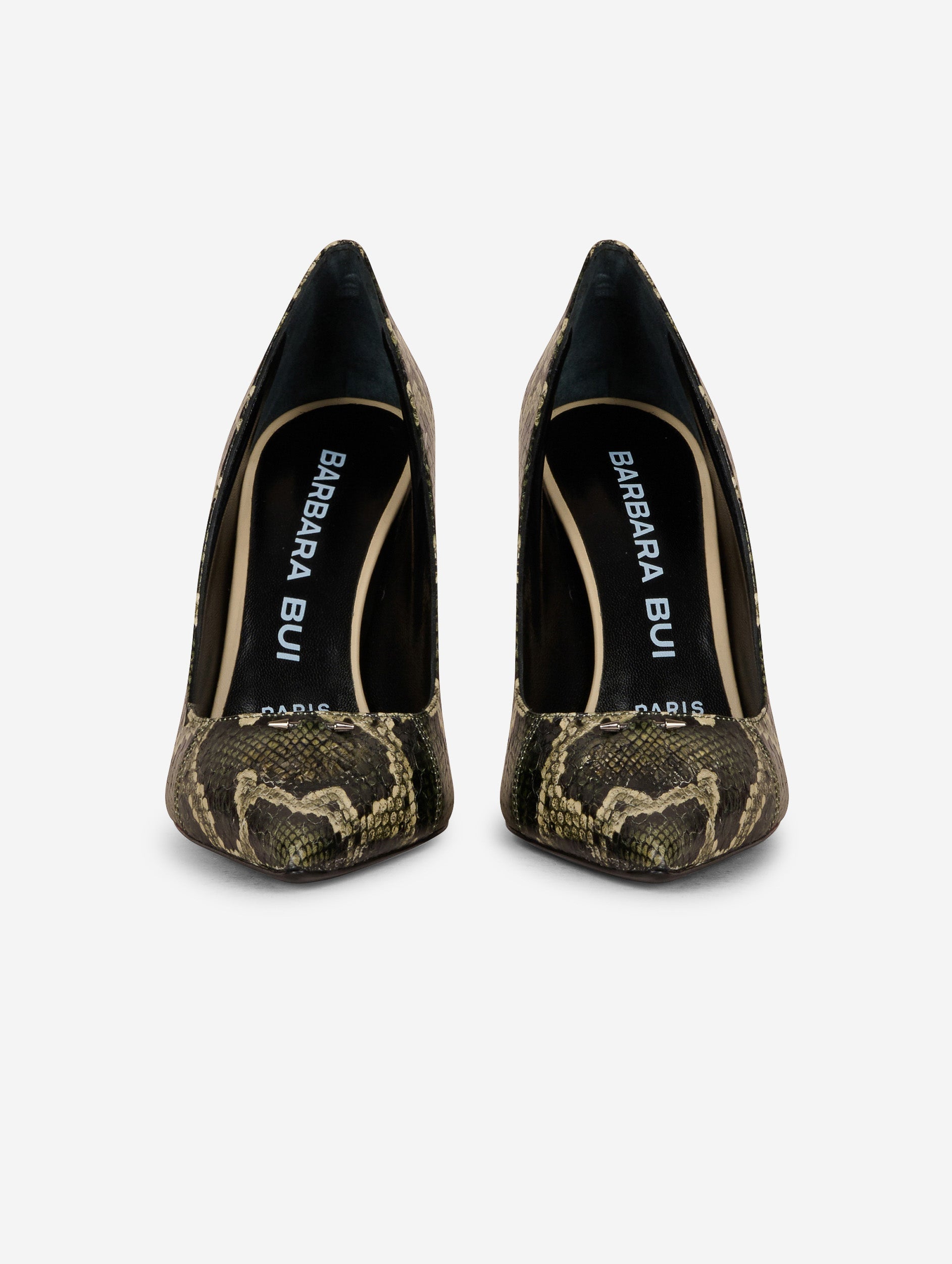 Green water snake stilettos punctuated with our signature metal piercing. Sexy 10.5 cm heel.