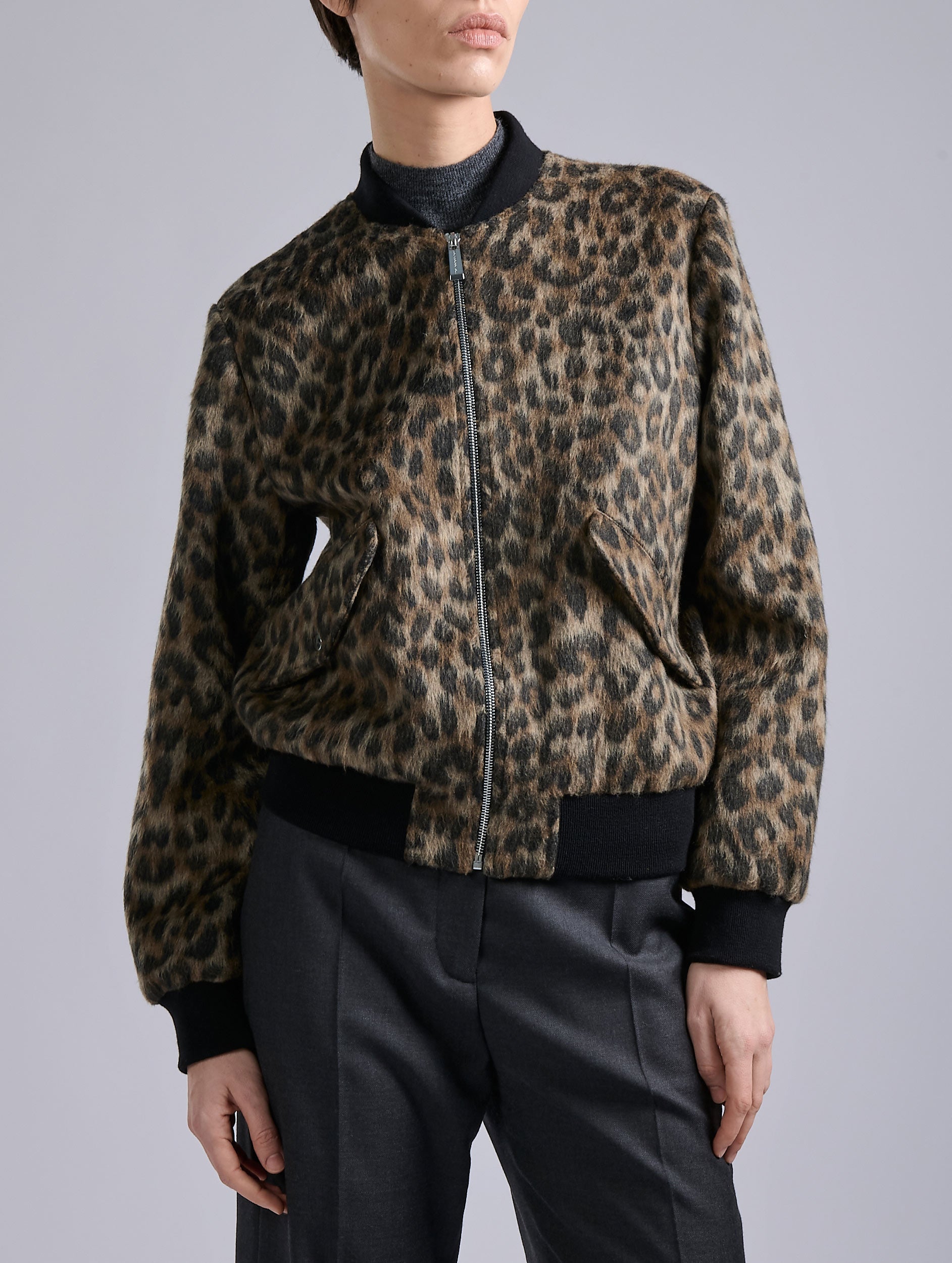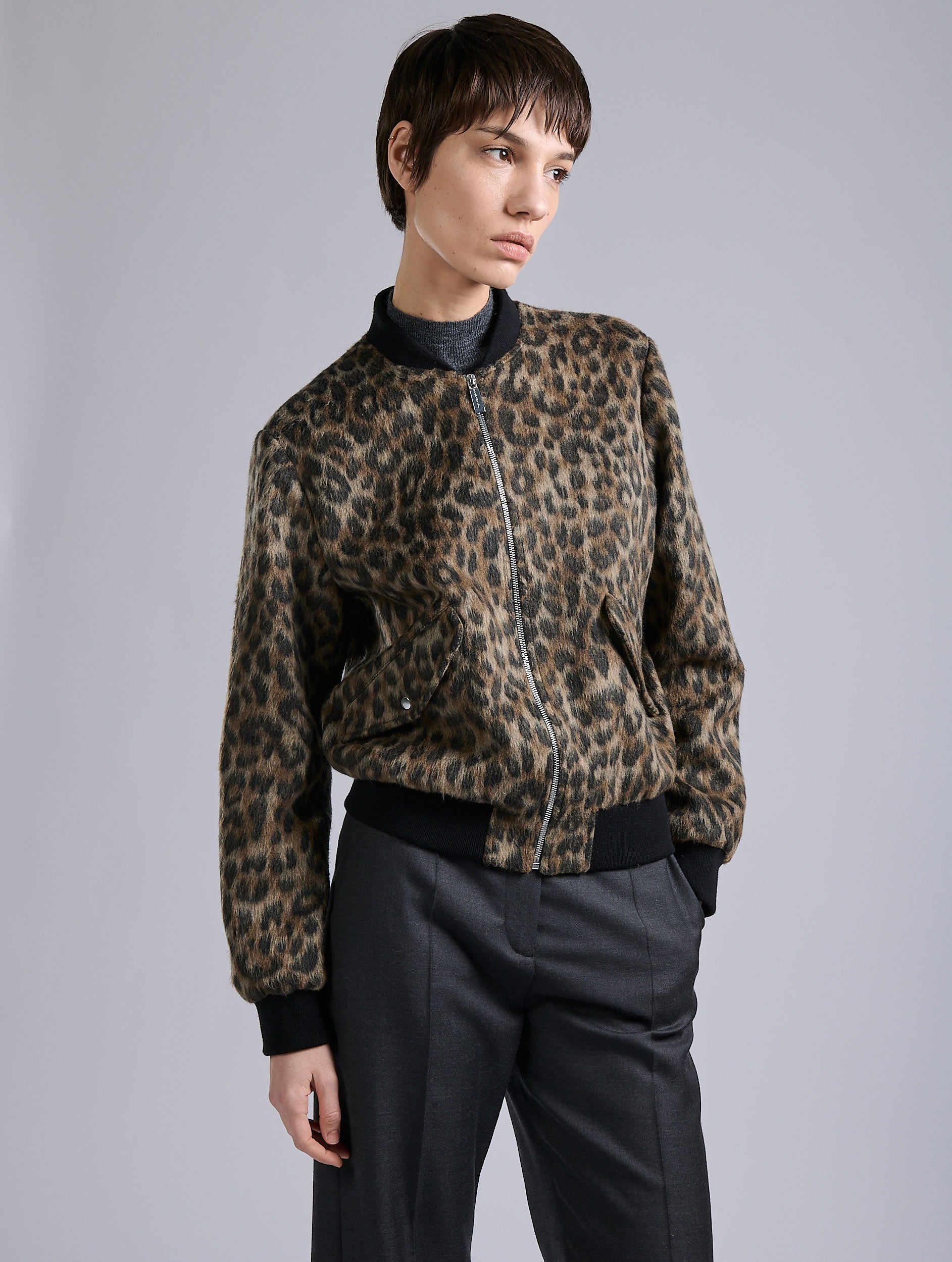 The ultimate sport-chic jacket, the Teddy jacket is revisited in a leopard version made from a soft and comfortable jacquard. It features all the iconic Teddy codes: straight zip, black elasticated ribbed cuffs, and flap pockets with a signature press-stud button. The animal print is a staple in Barbara Bui’s wardrobe, the leopard pattern is available in a selection of edgy pieces to pair with the brand’s tailored trousers for a sophisticated look on any occasion.