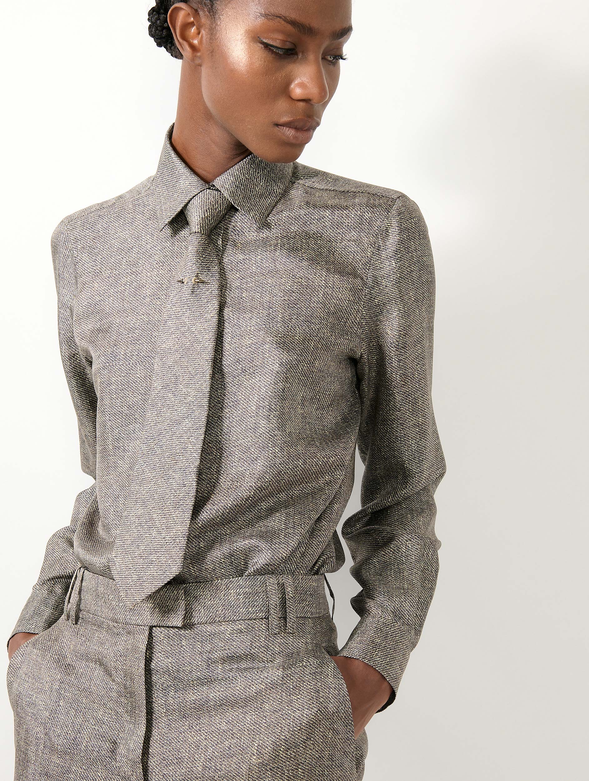 Sober silhouette and signature details: this long-sleeved women's shirt is crafted in a fluid silk printed in trompe-l'œil. Its motif evokes classic men's tailoring weaves highlighted by the shine of the silk. Its classic collar and buttoned cuffs maintain a clean line, while our silver-tone metal piercing, placed on the back, gives it a rock touch, signature of the House. A shirt to wear alone for a subtly androgynous allure, or in a total look with the tie, jacket, and matching suit trousers for a contemporary business look.