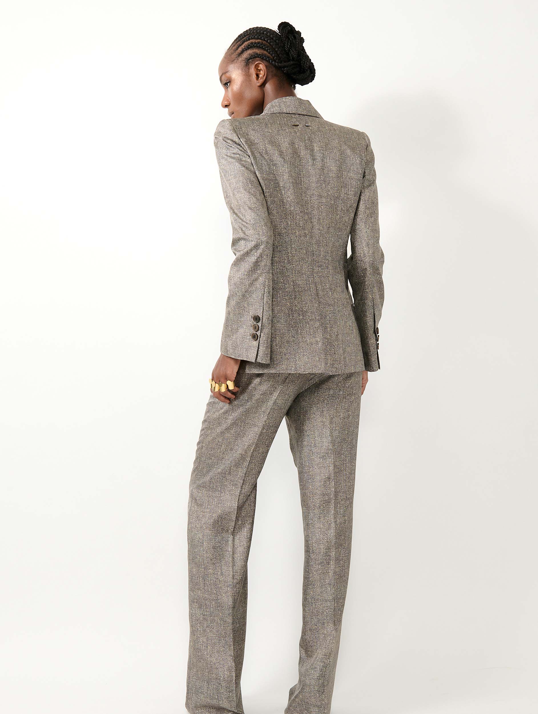 Crafted in silk with a trompe-l'œil linen weave print, this jacket with a pronounced collar creates an elegant silhouette from day to night. The subtle nuances of the pattern, enhanced by the silk medium, recall men's suits while remaining undeniably feminine. Its zipped sleeves open to reveal the coordinated shirt accessorized with its tie, the epicentre of Barbara Bui's boyish tailoring allure.